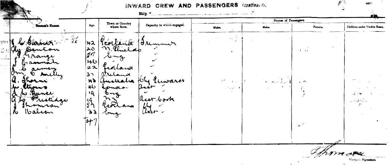 Source: State Records Authority of New South Wales: Shipping Master's Office; Passengers Arriving 1855 - 1922; NRS13278, [X443] reels 2109 & 2110. Transcribed by Lester Hamilton. Proofread by Lyn & Maurie. You may view/print a scan of the original list - a monitor set to high resolution is recommended for clarity. Use your back button to return. |