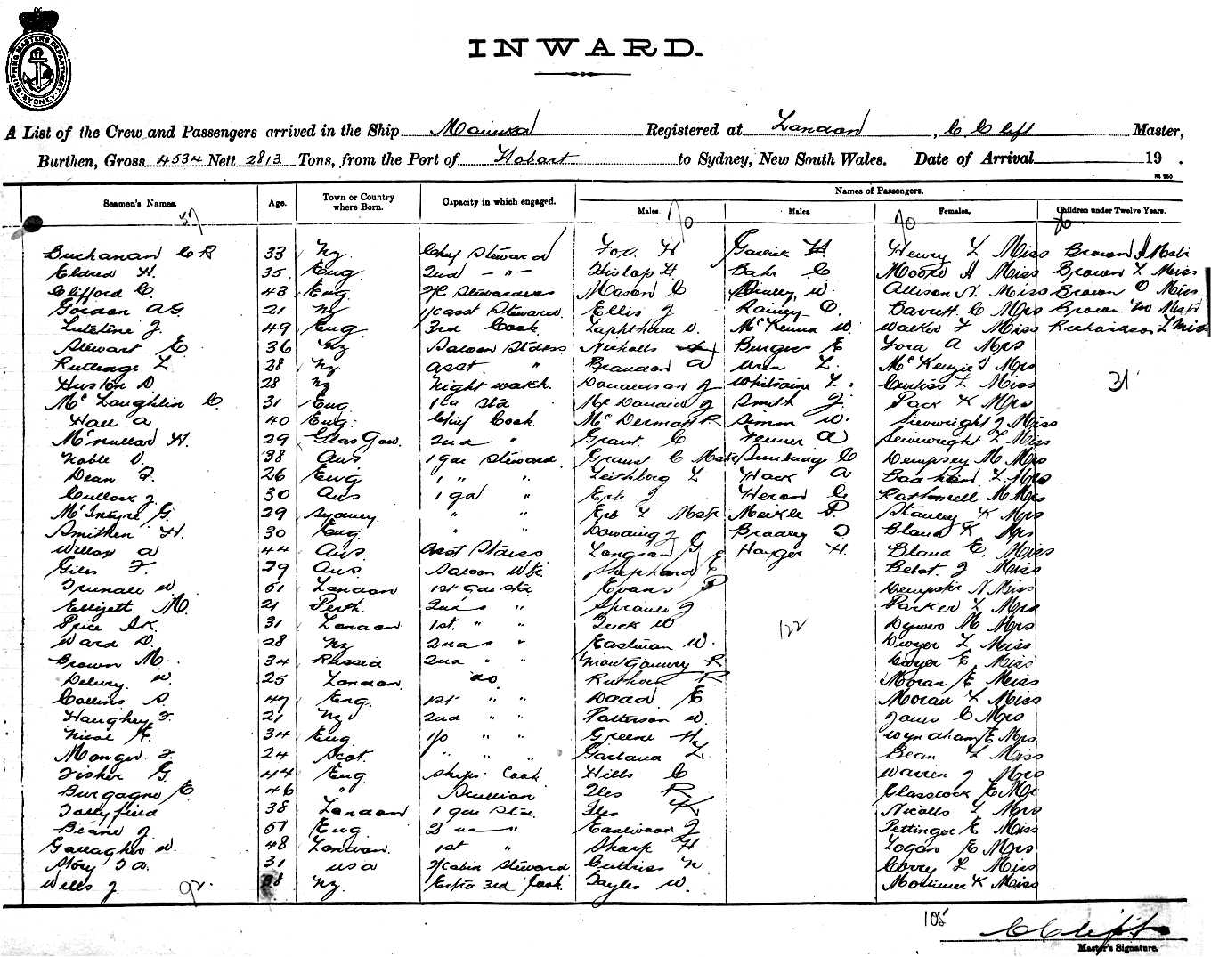 Source: State Records Authority of New South Wales: Shipping Master's Office; Passengers Arriving 1855 - 1922; NRS13278, [X443] reels 2109 & 2110. Transcribed by Lester Hamilton. Proofread by Lyn & Maurie. You may view/print a scan of the original list - a monitor set to high resolution is recommended for clarity. Use your back button to return. |