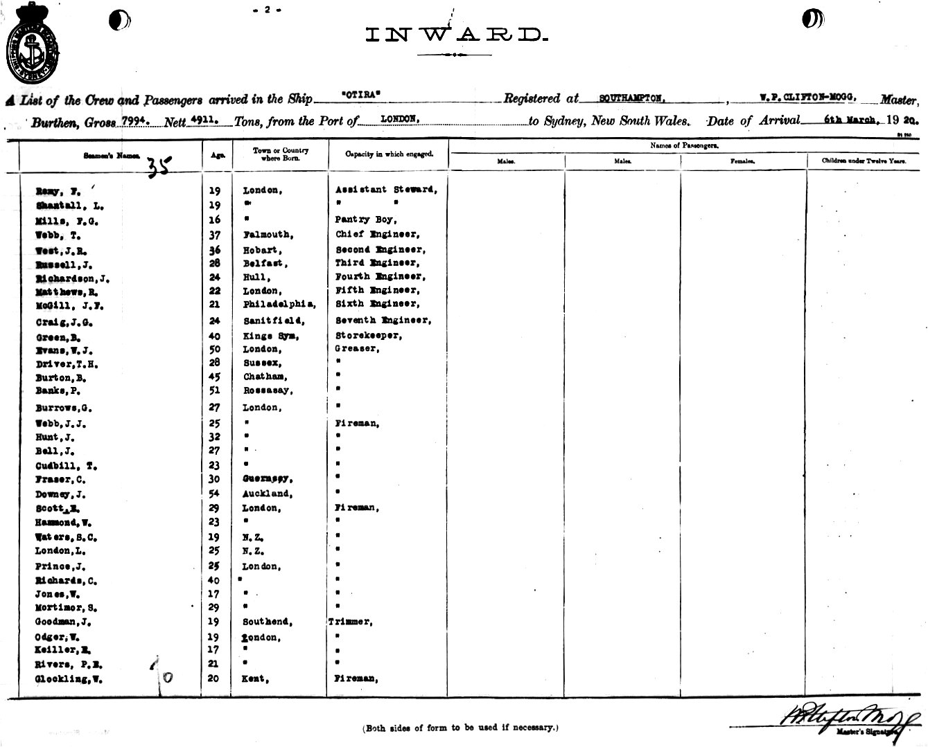 OTIRAOF SOUTHAMPTON, W. P. CLIFTON-MOGG, MASTER, BURTHEN 7994/4911 TONS FROM THE PORT OF LONDON TO SYDNEY, NEW SOUTH WALES, 6TH MARCH 1920 |