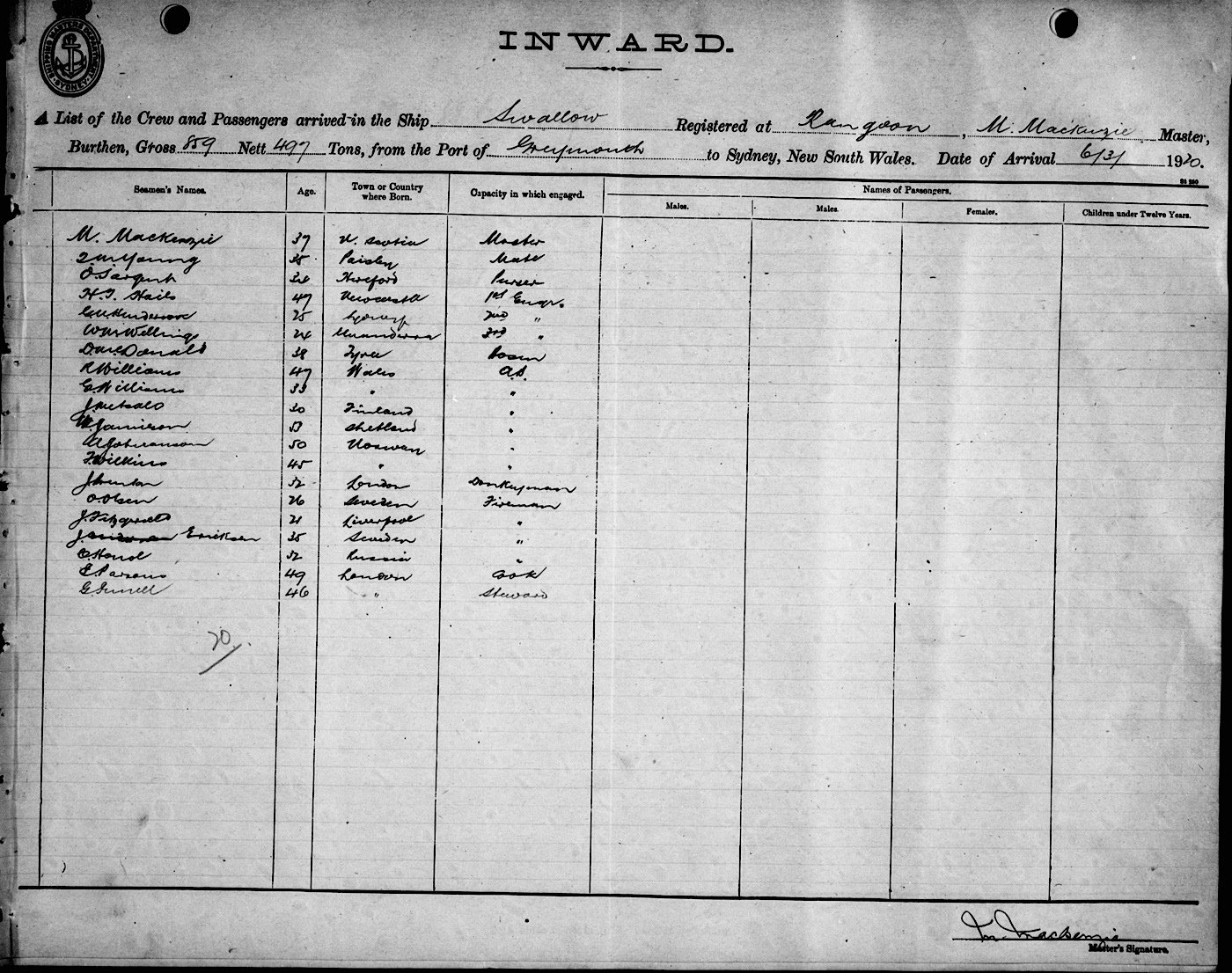 SWALLOWOF RANGOON, M. MACKENZIE, MASTER, BURTHEN 859/497 TONS FROM THE PORT OF GREYMOUTH TO SYDNEY, NEW SOUTH WALES, 6TH MARCH 1920 |