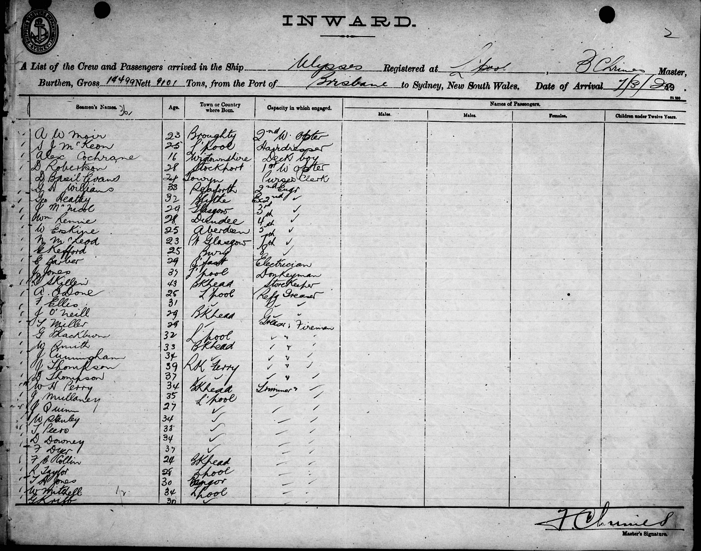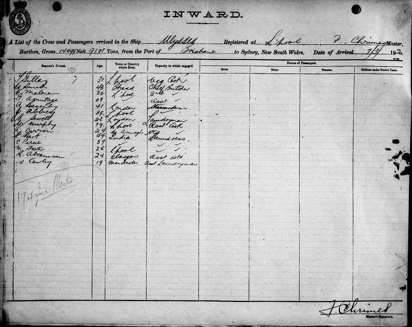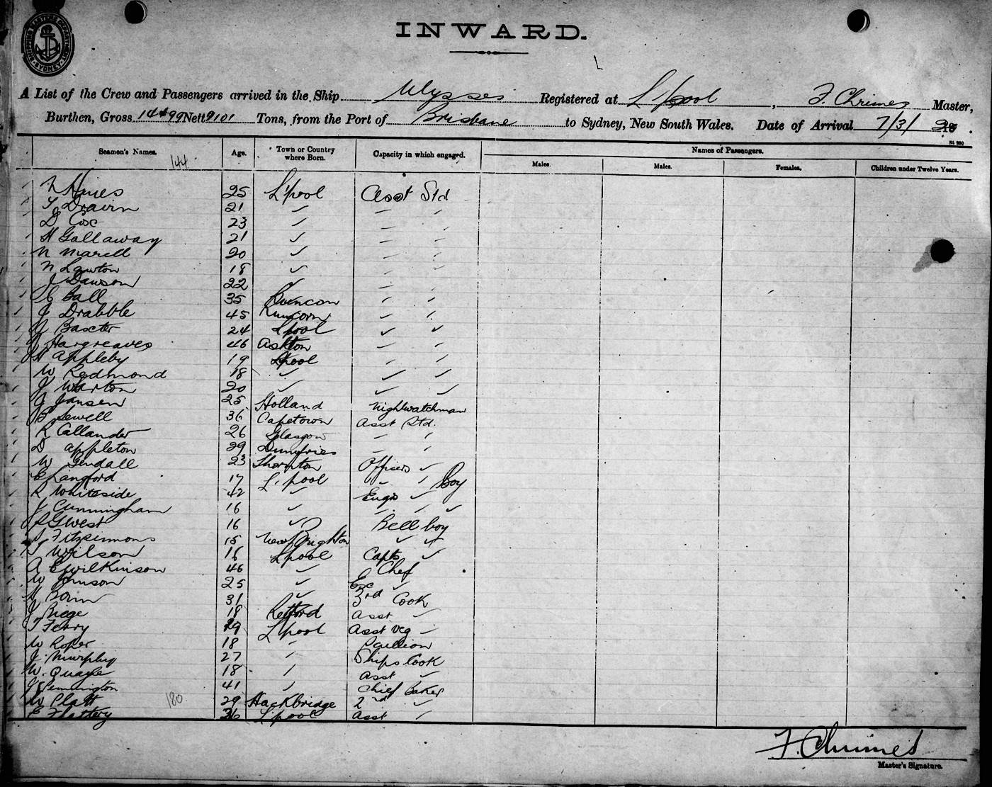 ULYSSESOF LIVERPOOL, F. CHRIMES, MASTER, BURTHEN 14499/9101 TONS FROM THE PORT OF BRISBANE TO SYDNEY, NEW SOUTH WALES, 7TH MARCH 1920 |