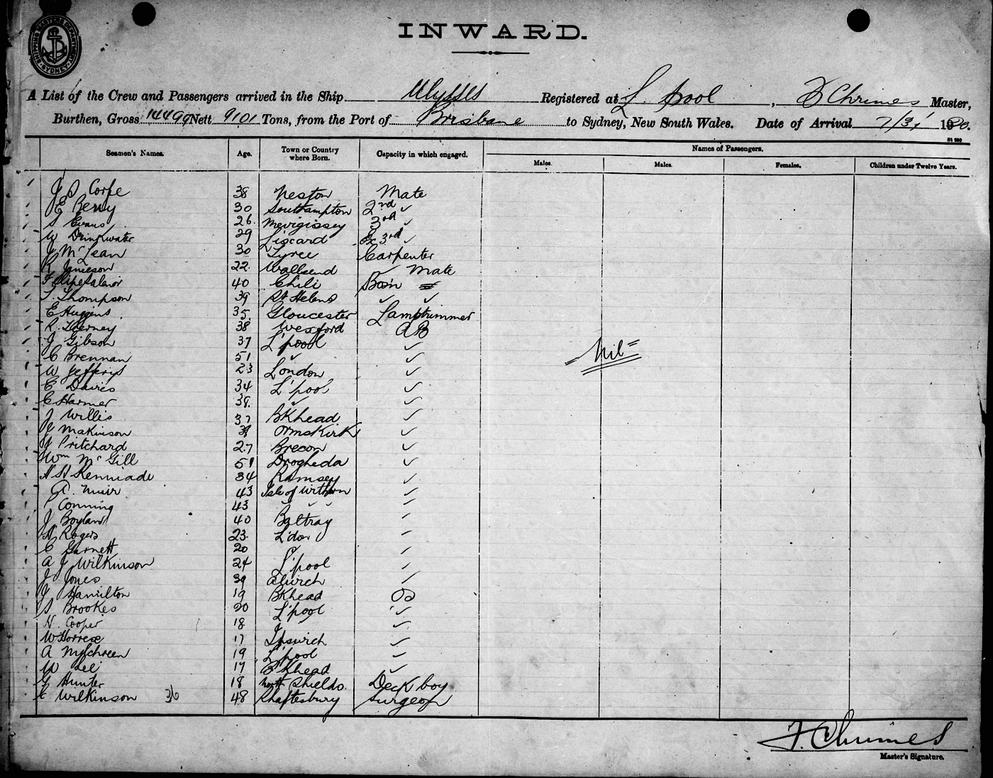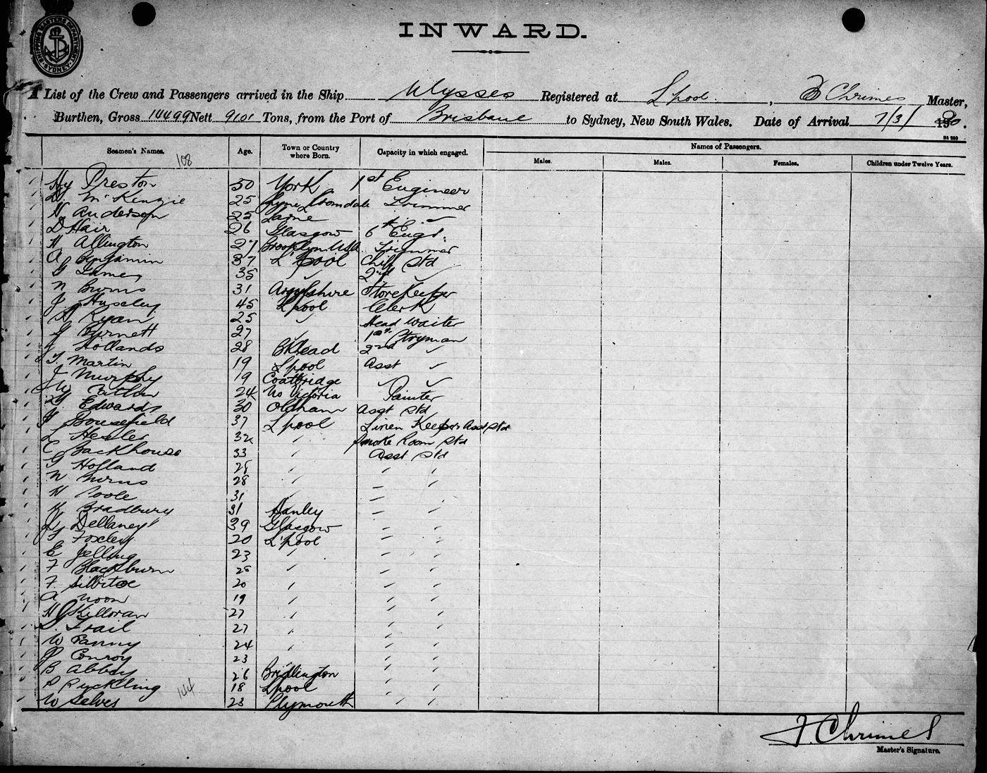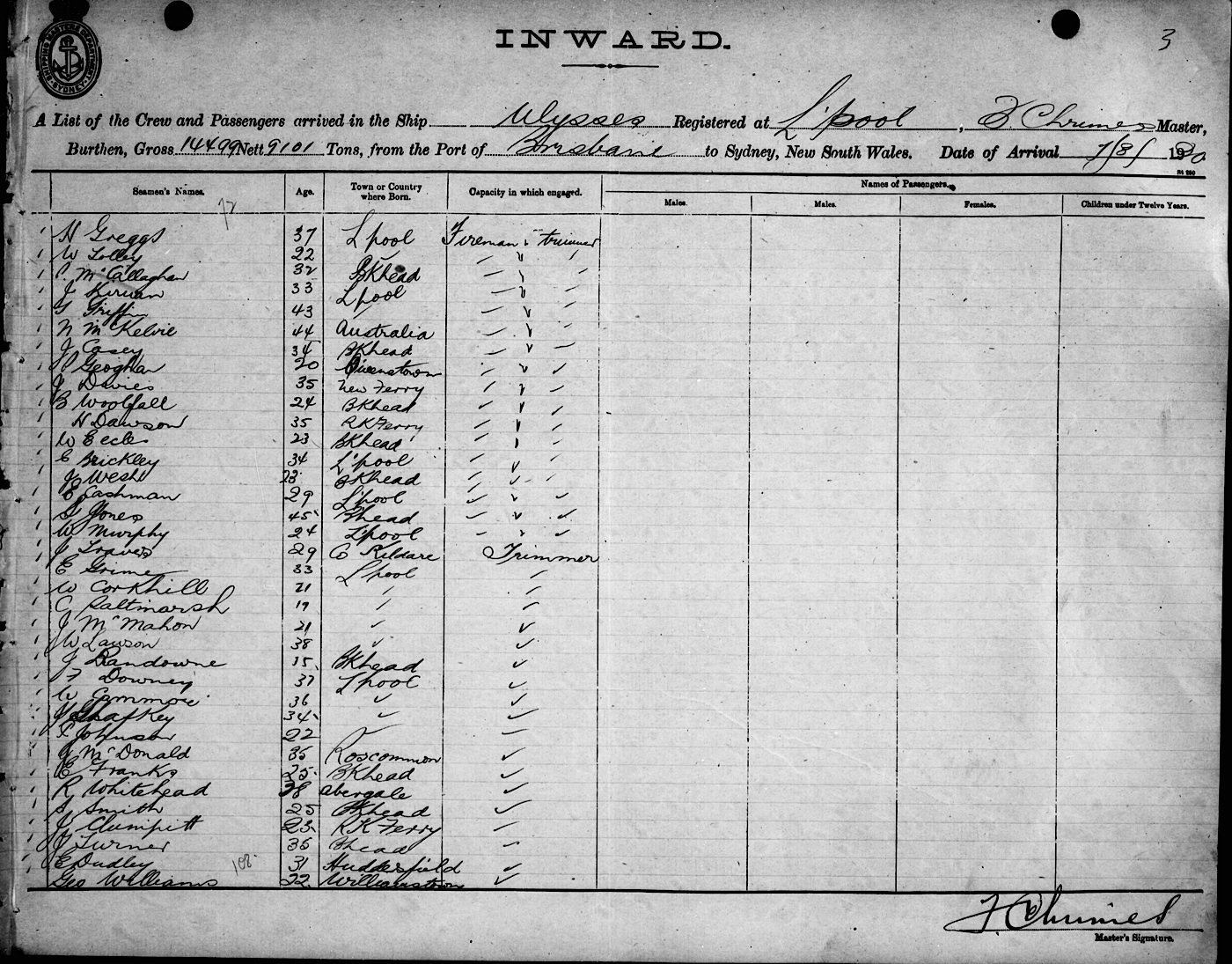 ULYSSESOF LIVERPOOL, F. CHRIMES, MASTER, BURTHEN 14499/9101 TONS FROM THE PORT OF BRISBANE TO SYDNEY, NEW SOUTH WALES, 7TH MARCH 1920 |