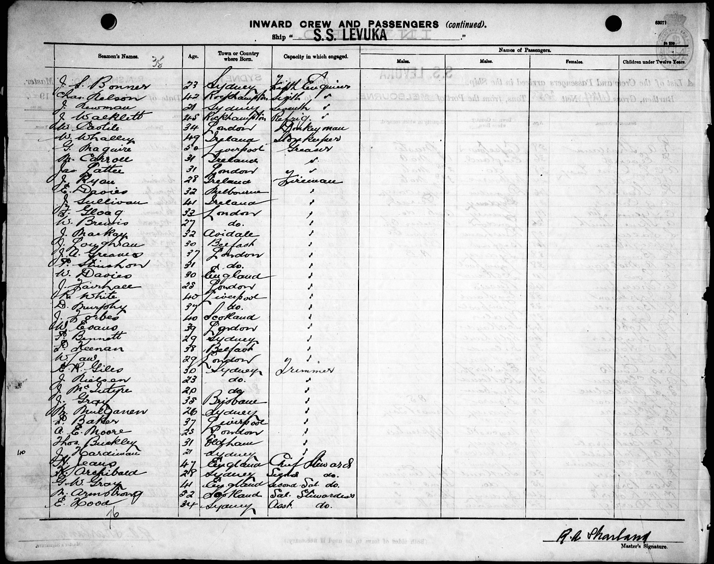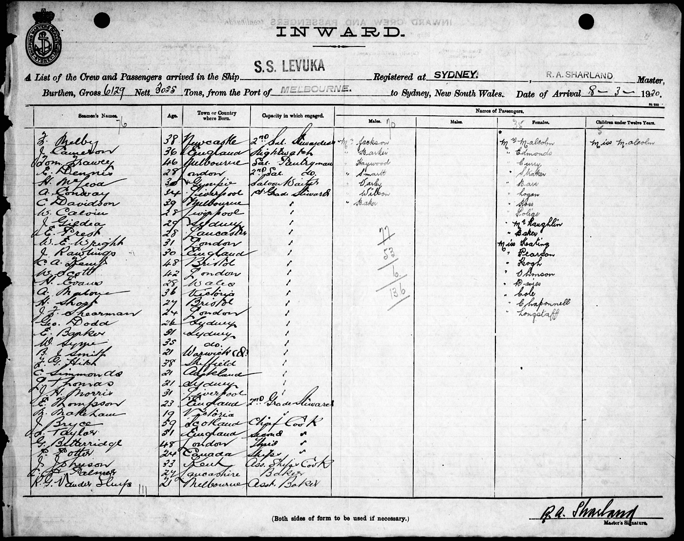 Mariners and ships in Australian Waters | LEVUKAOF SYDNEY, R. A. SHARLAND, MASTER, BURTHEN 6129/3055 TONS FROM THE PORT OF MELBOURNE TO SYDNEY, NEW SOUTH WALES, 8TH MARCH 1920 |