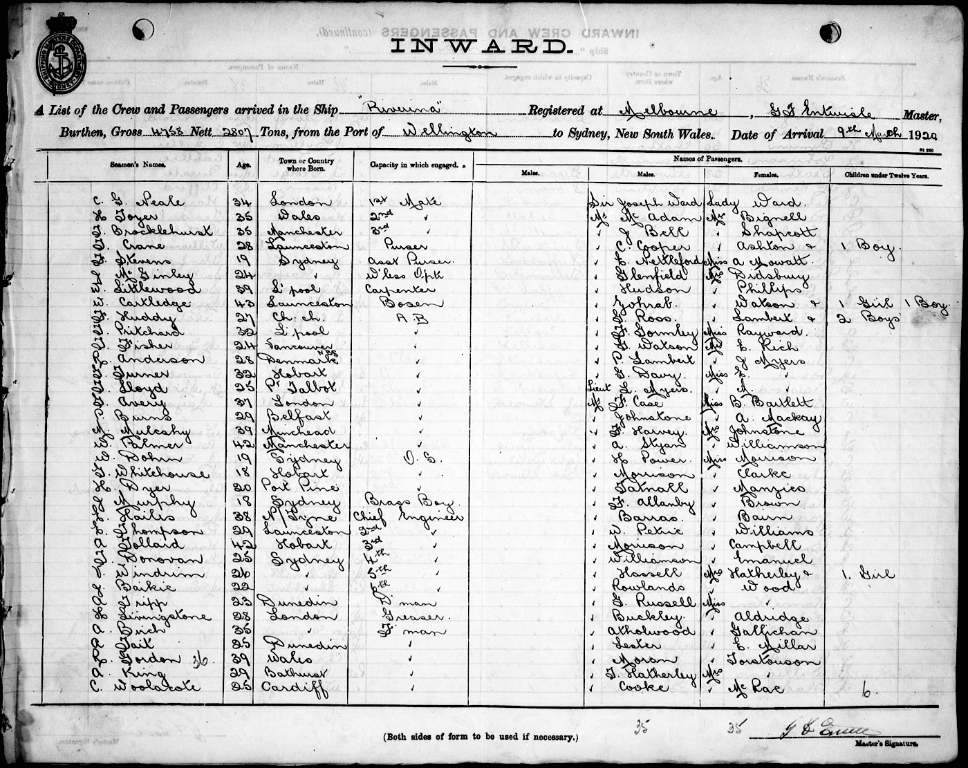 RIVERINAOF MELBOURNE, G. F. ENTWISLE, MASTER, BURTHEN 4758/2807 TONS FROM THE PORT OF WELLINGTON TO SYDNEY, NEW SOUTH WALES, 9TH MARCH 1920 |