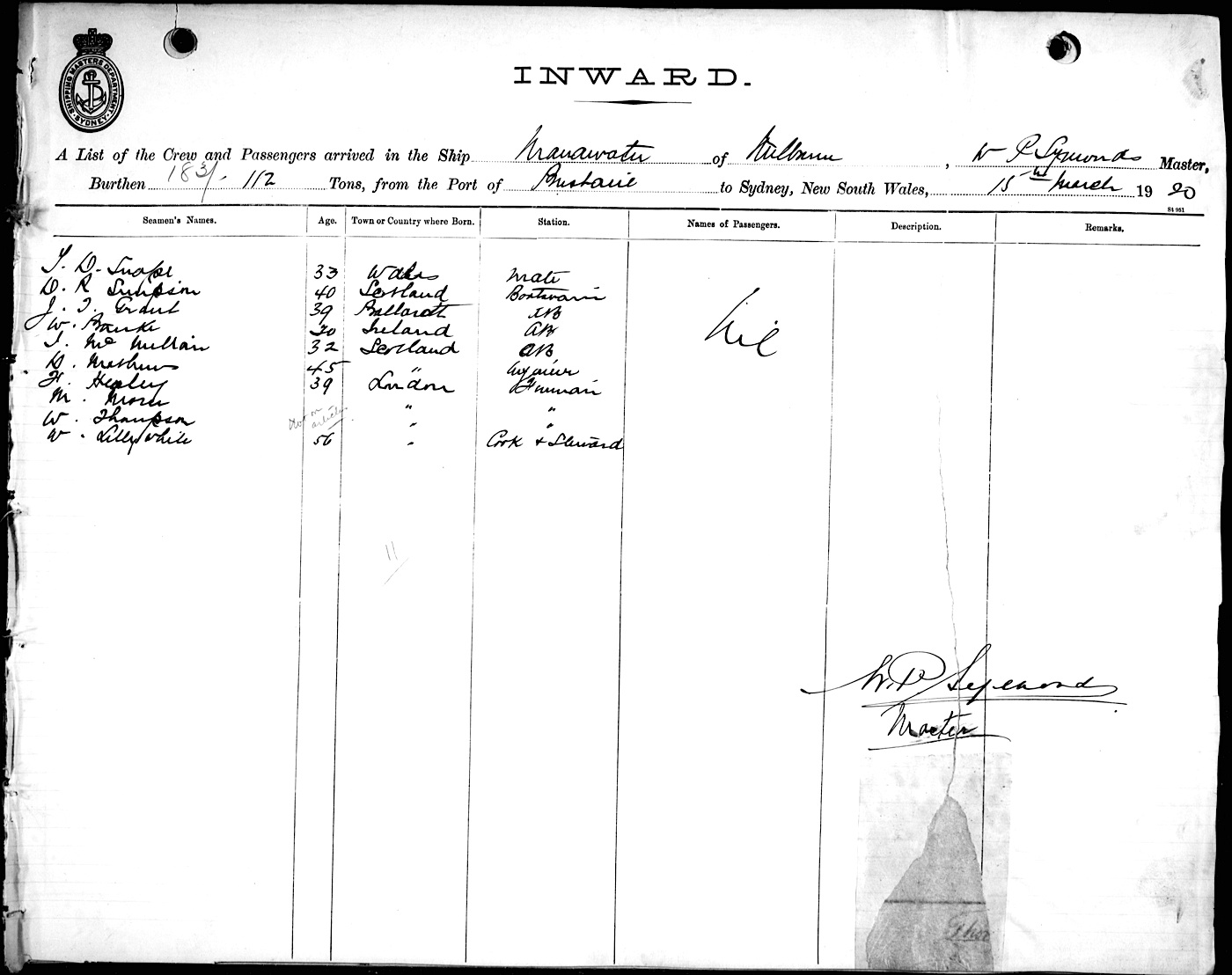 MANAWATUOF MELBOURNE, W. P. SYMONDS, MASTER, BURTHEN 183/112 TONS FROM THE PORT OF BRISBANE TO SYDNEY, NEW SOUTH WALES, 15TH MARCH 1920 |