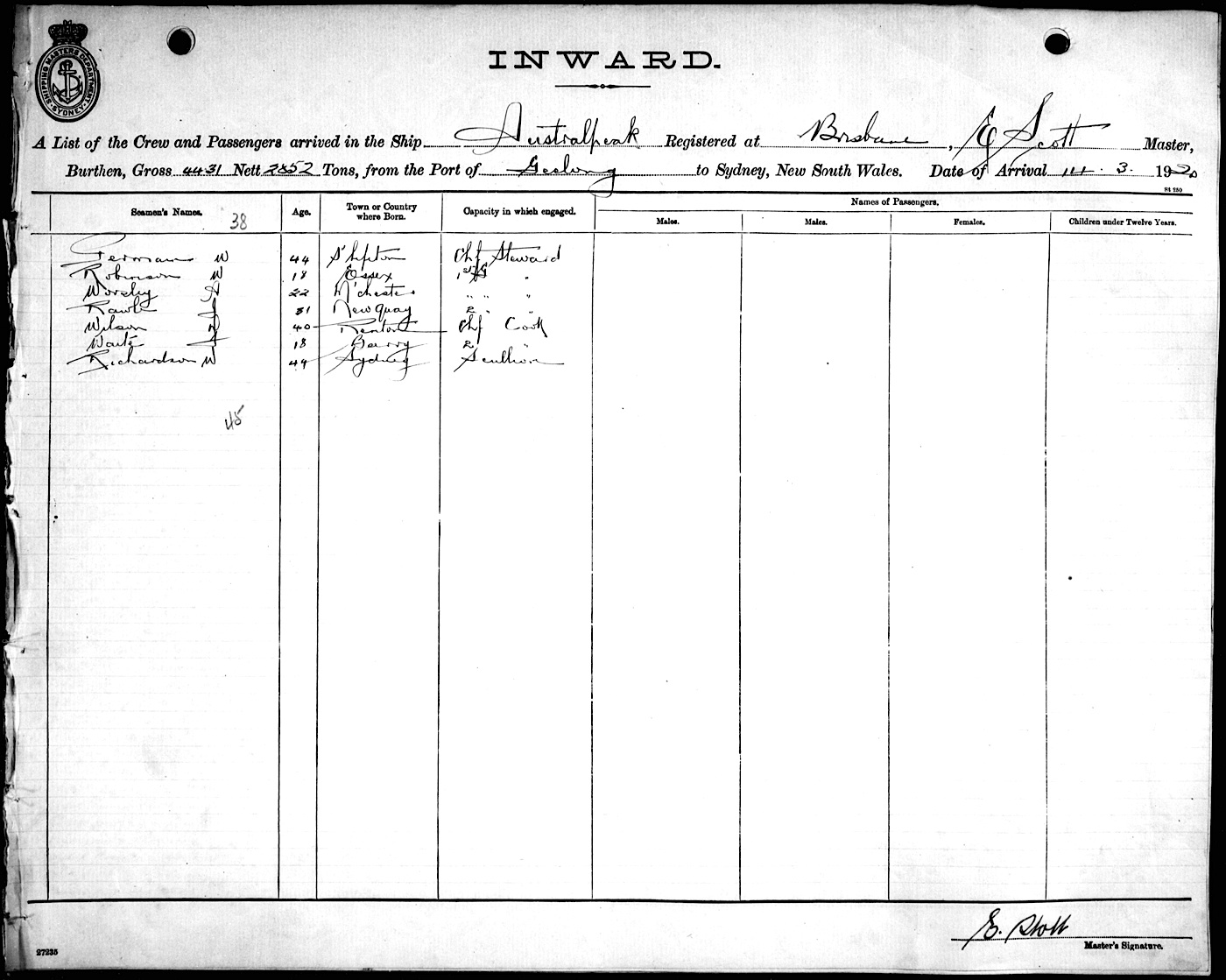 AUSTRALPEAKOF BRISBANE, E. SCOTT, MASTER, BURTHEN 4431/2852 TONS FROM THE PORT OF GEELONG TO SYDNEY, NEW SOUTH WALES, 14TH MARCH 1920 |