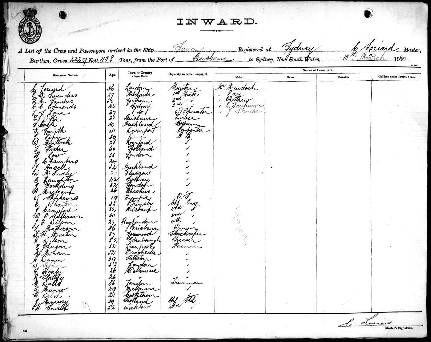 SUVAOF SYDNEY, C. LORIARD, MASTER, BURTHEN 2229/1158 TONS FROM THE PORT OF BRISBANE TO SYDNEY, NEW SOUTH WALES, 15TH MARCH 1920 |