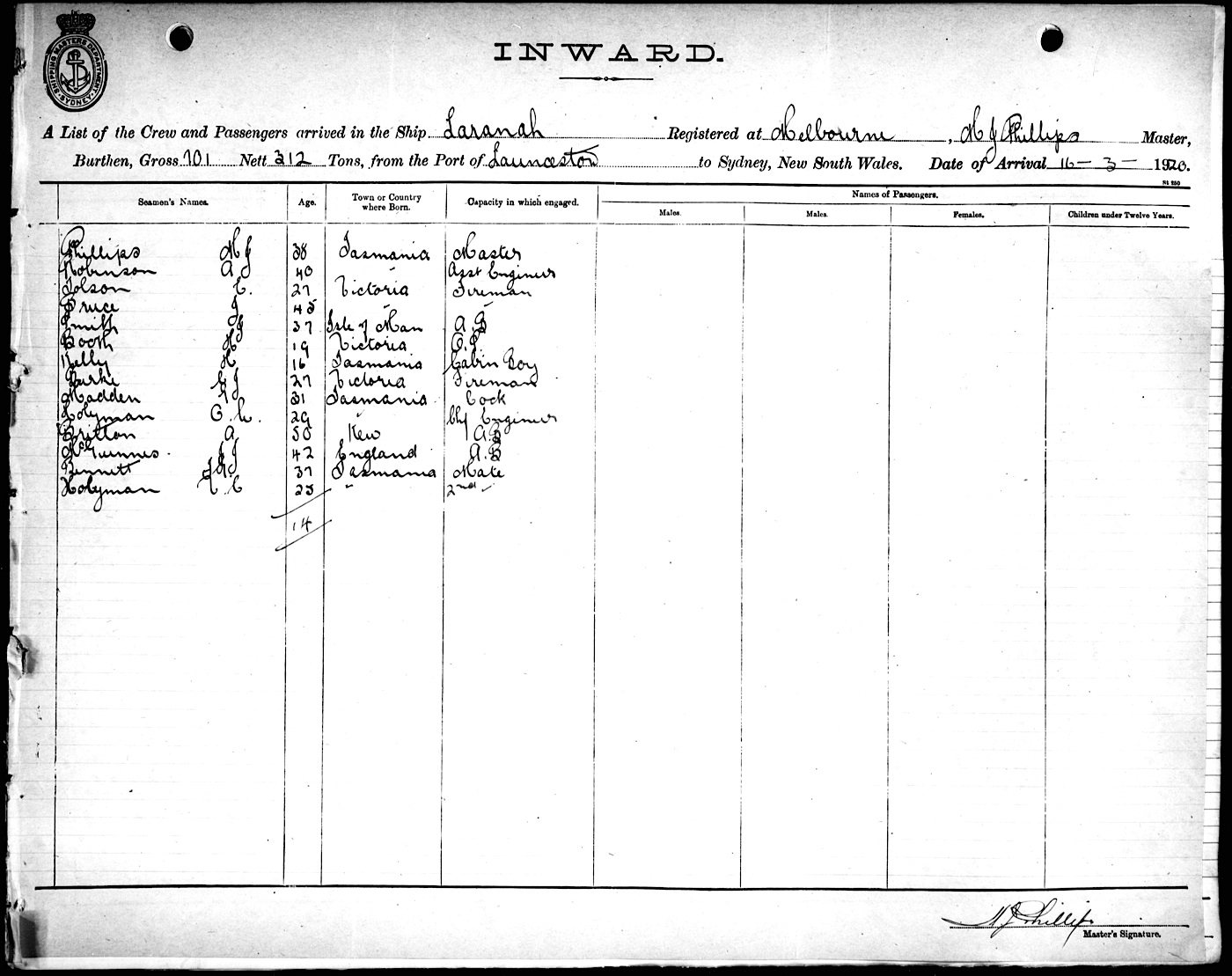 LARANAHOF MELBOURNE, M. J. PHILLIPS, MASTER, BURTHEN 701/312 TONS FROM THE PORT OF LAUNCESTON TO SYDNEY, NEW SOUTH WALES, 16TH MARCH 1920 |