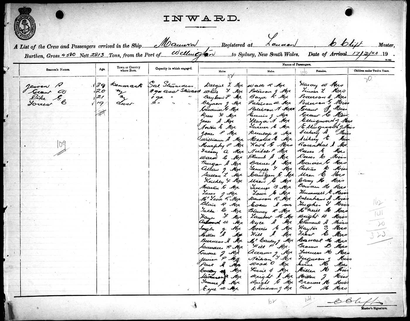 MANUKAOF LONDON, C. CLIFT, MASTER, BURTHEN 4580/2813 TONS FROM THE PORT OF WELLINGTON TO SYDNEY, NEW SOUTH WALES, 17TH MARCH 1920 |
