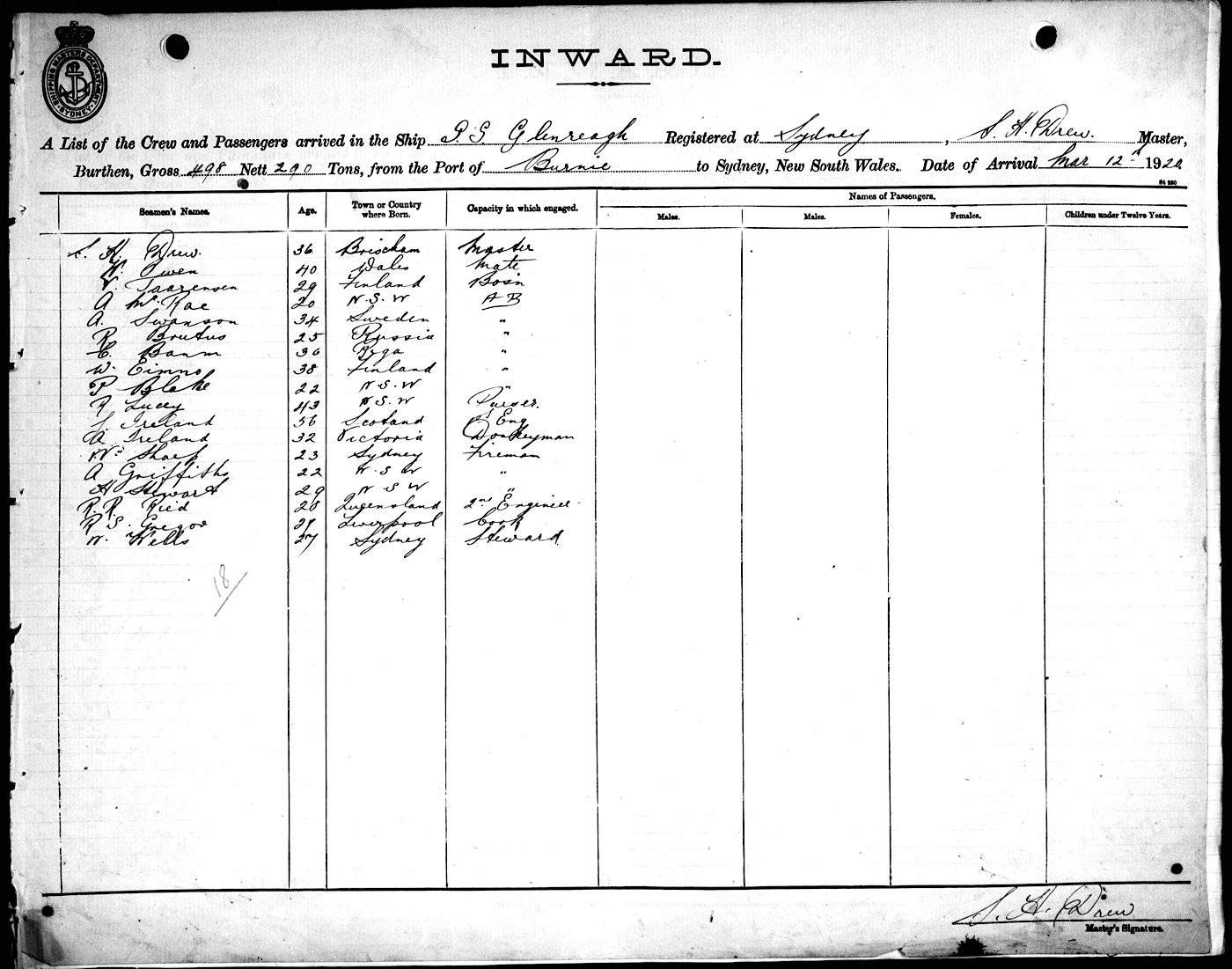 GLENREAGHOF SYDNEY, S. H. DREW, MASTER, BURTHEN 498/290 TONS FROM THE PORT OF BURNIE TO SYDNEY, NEW SOUTH WALES, 12TH MARCH 1920 |