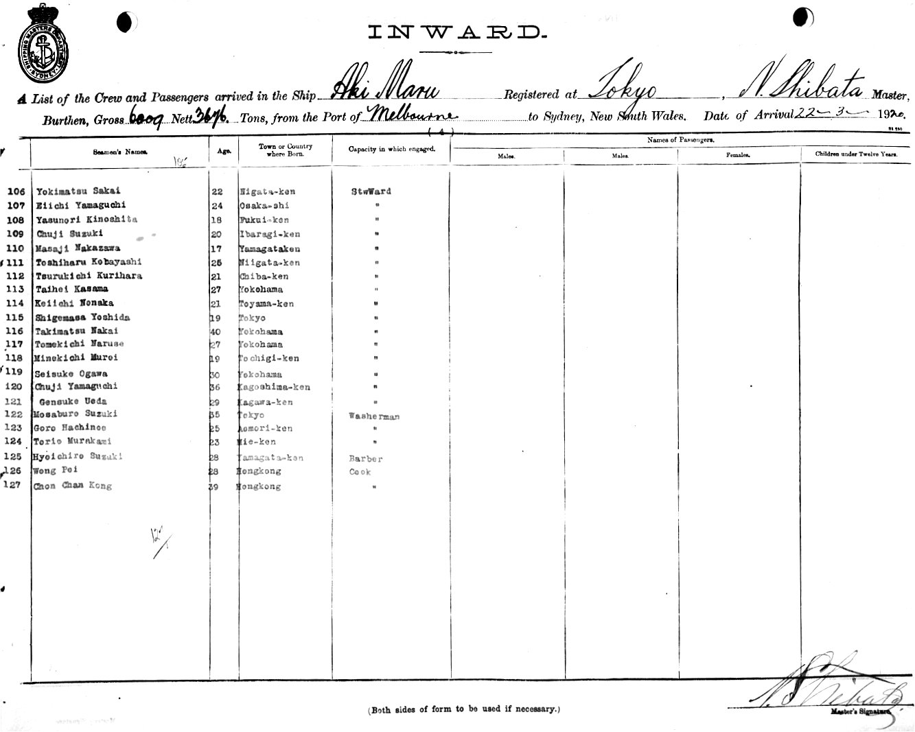 AKI MARUOF TOKYO, NOBUJO SHBATA MASTER, BURTHEN GROSS 6009. 27 NETT 3676. 22 TONS FROM THE PORT OF MELBOURNE TO SYDNEY, NEW SOUTH WALES, 21ST MARCH 1920 |