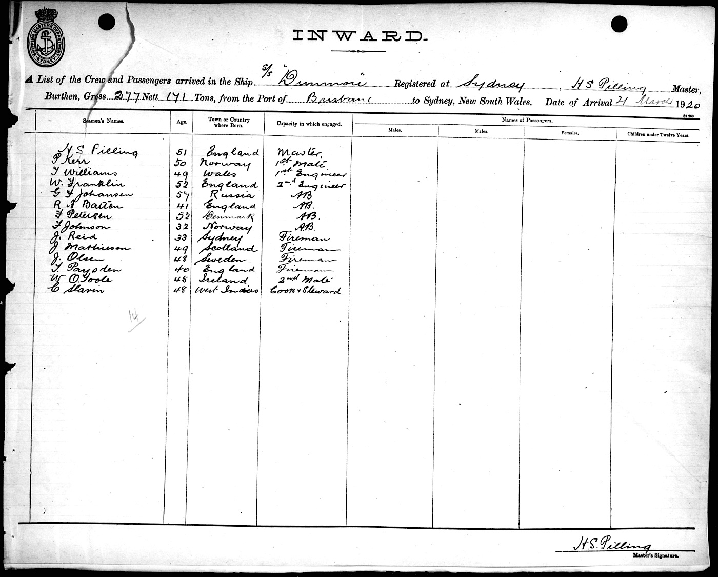 DUNMOREOF SYDNEY, H. S. PILLING, MASTER, BURTHEN 277/171 TONS FROM THE PORT OF BRISBANE TO SYDNEY, NEW SOUTH WALES, 21ST MARCH 1920 |
