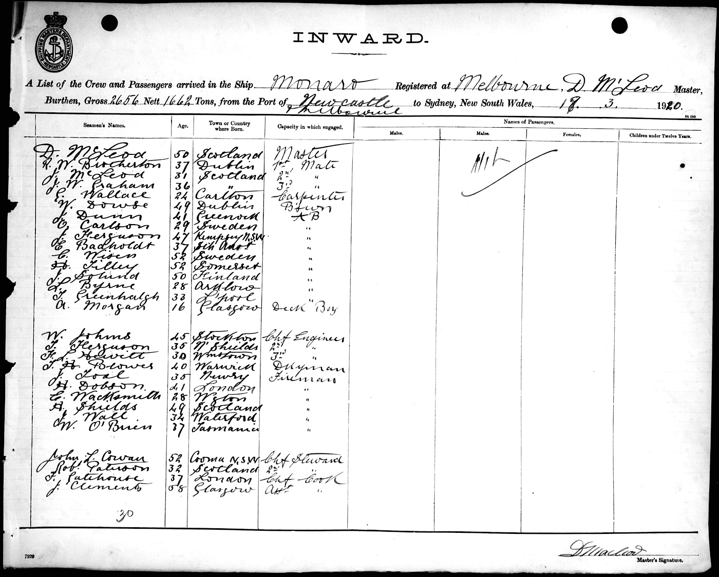 Mariners and ships in Australian Waters | MONAROOF MELBOURNE, D. MCLEOD, MASTER, BURTHEN 2656/1662 TONS FROM THE PORTS OF NEWCASTLE & MELBOURNE TO SYDNEY, NEW SOUTH WALES, 18TH MARCH 1920 |