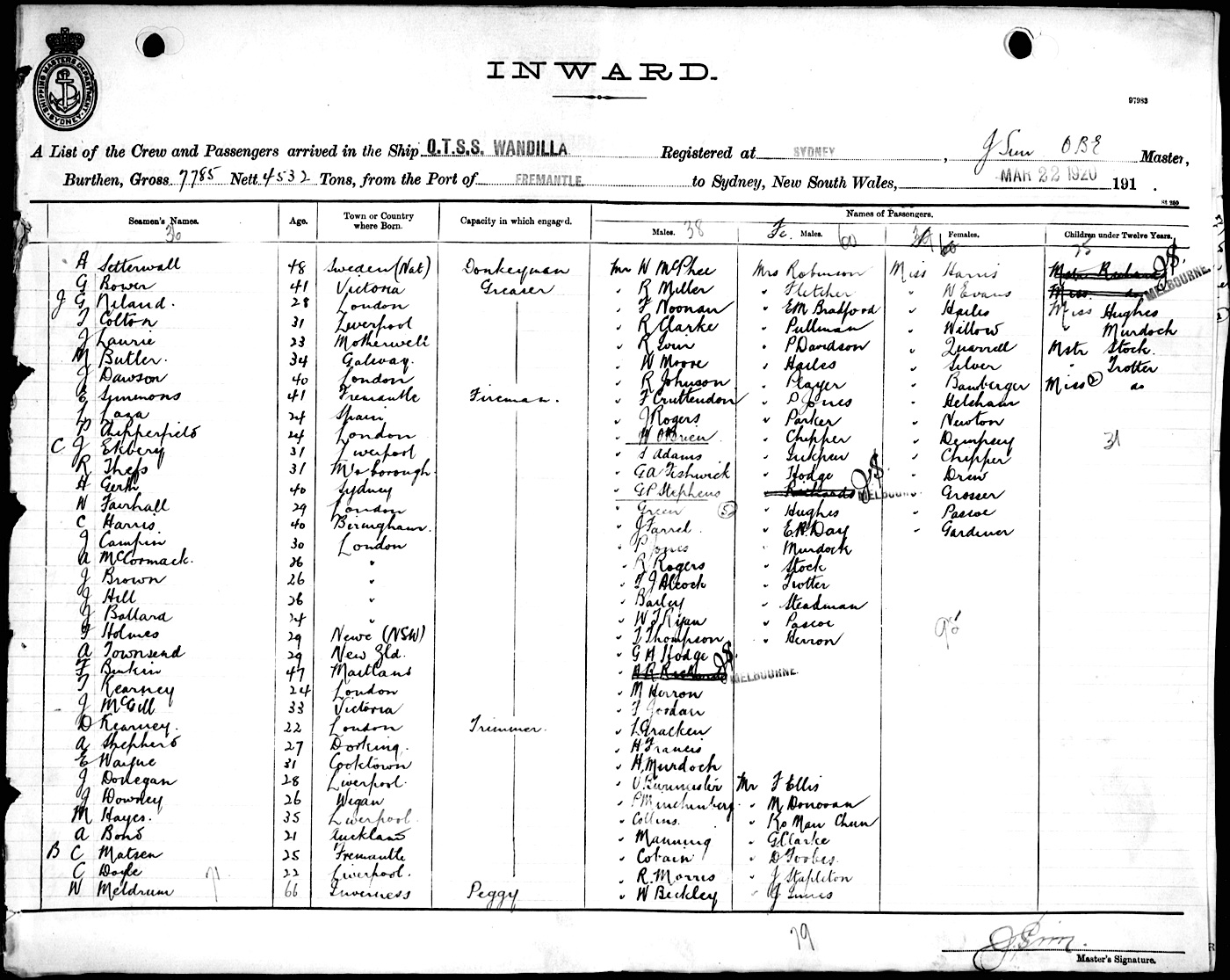 Mariners and ships in Australian Waters | WANDILLAOF SYDNEY, J. SIM, O.B.E., MASTER, BURTHEN 7785/4532 TONS FROM THE PORT OF FREMANTLE TO SYDNEY, NEW SOUTH WALES, 22ND MARCH 1920 |