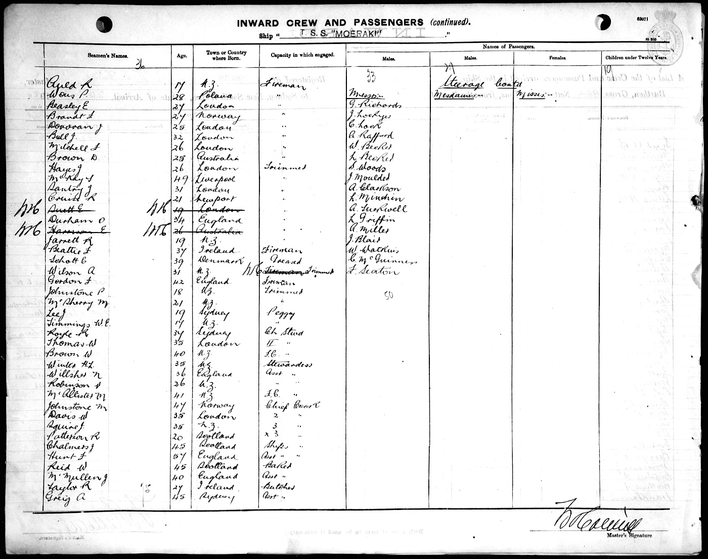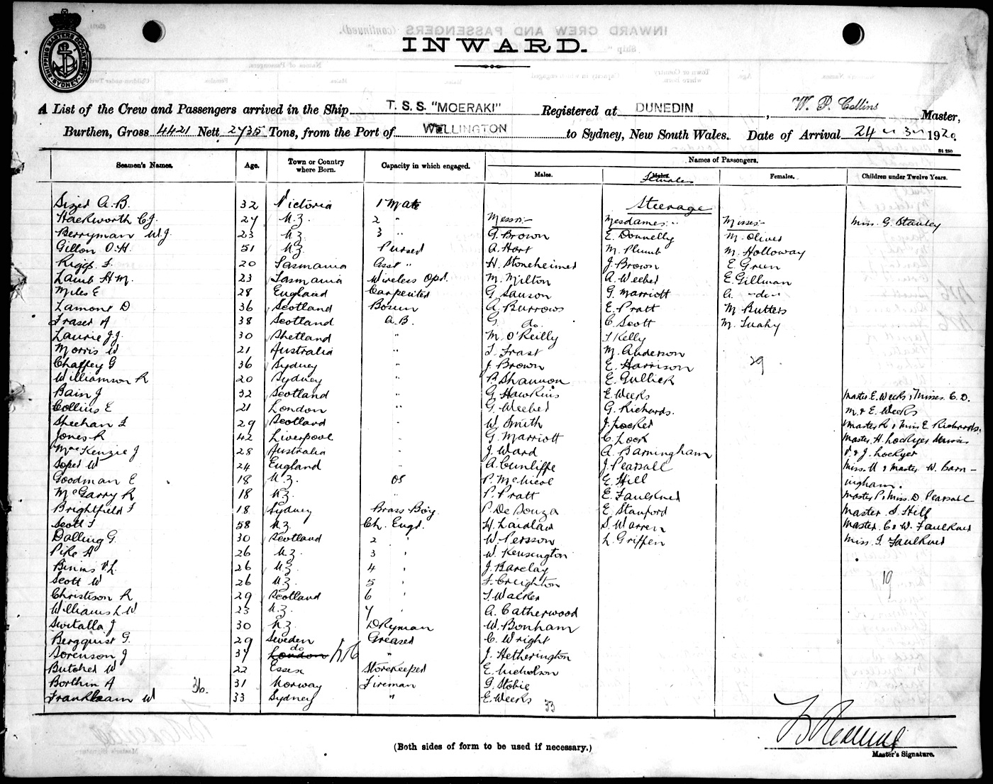 MOERAKIOF DUNEDIN, W. P. COLLINS, MASTER, BURTHEN 4421/2735 TONS FROM THE PORT OF WELLINGTON TO SYDNEY, NEW SOUTH WALES, 24TH MARCH 1920 |