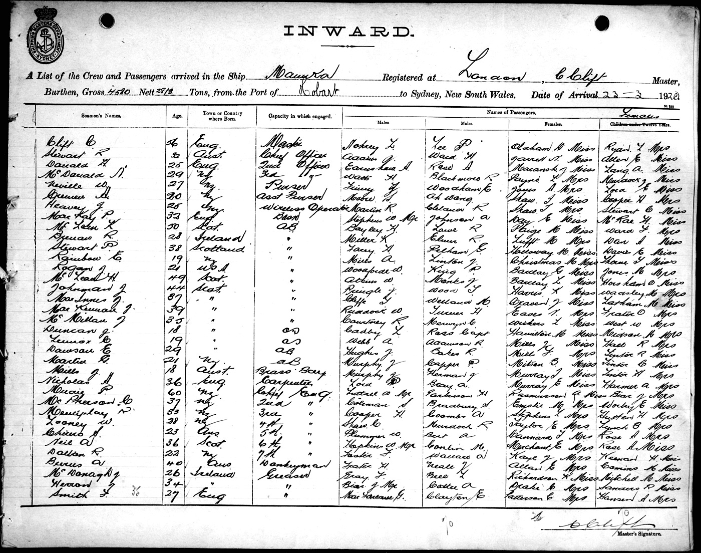 MANUKAOF LONDON, C. CLIFT, MASTER, BURTHEN 4580/2813 TONS FROM THE PORT OF HOBART TO SYDNEY, NEW SOUTH WALES, 23RD MARCH 1920 |
