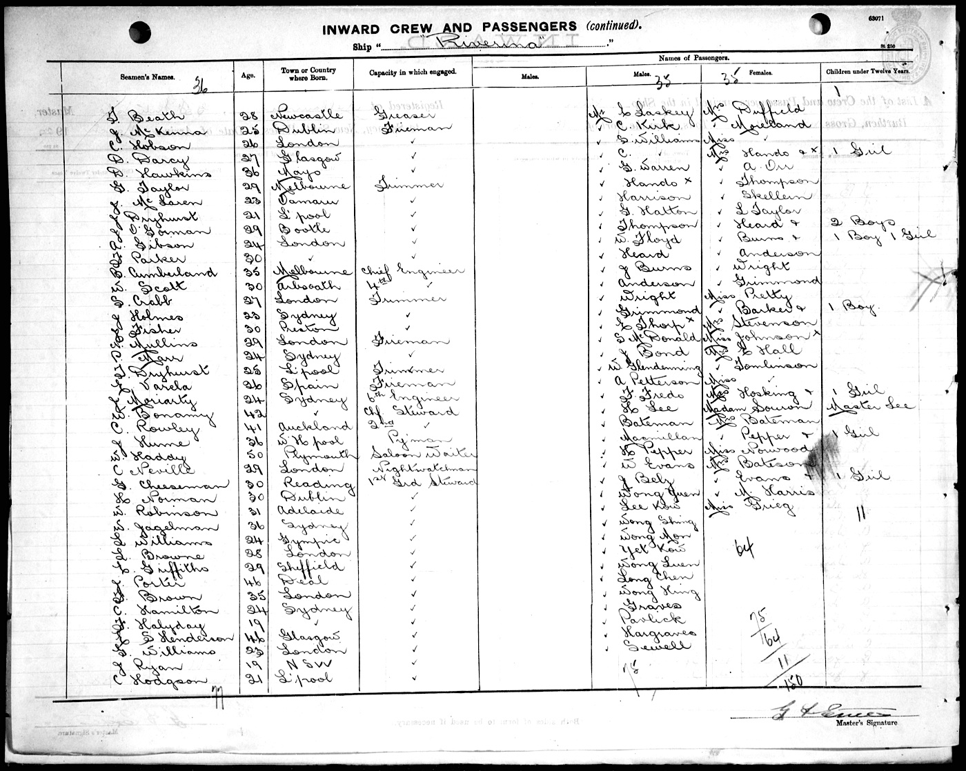Source: State Records Authority of New South Wales: Shipping Master's Office; Passengers Arriving 1855 - 1922; NRS13278, [X443] reels 2109 & 2110. Transcribed by Lester Hamilton. Proofread by Lyn & Maurie. You may view/print a scan of the original list - a monitor set to high resolution is recommended for clarity. Use your back button to return. |