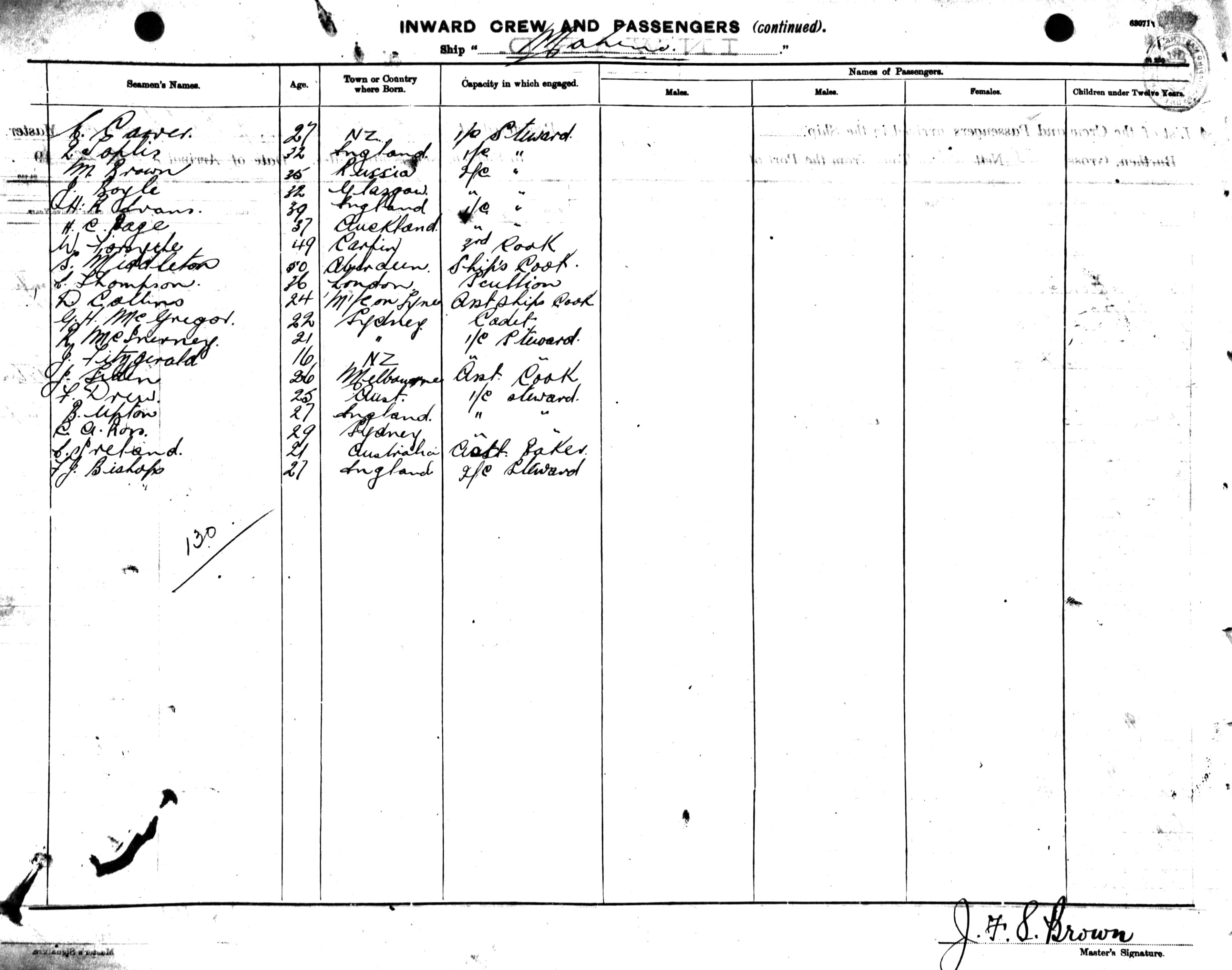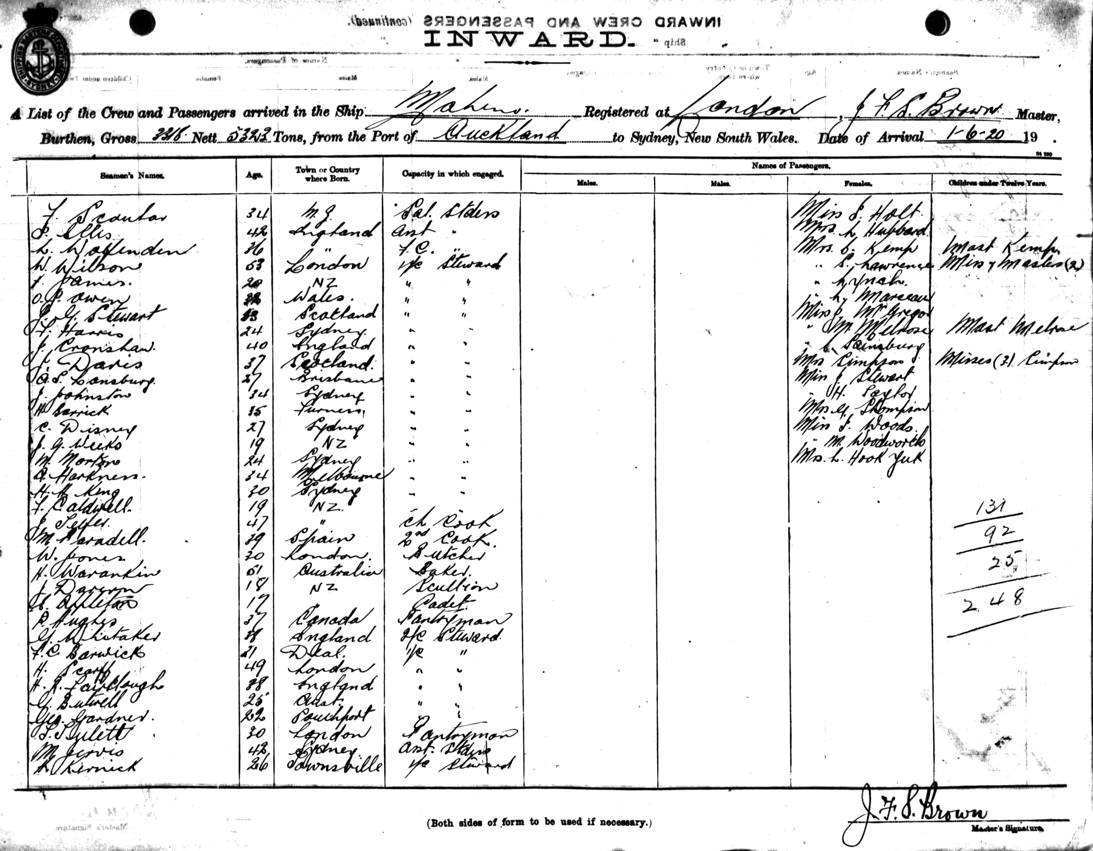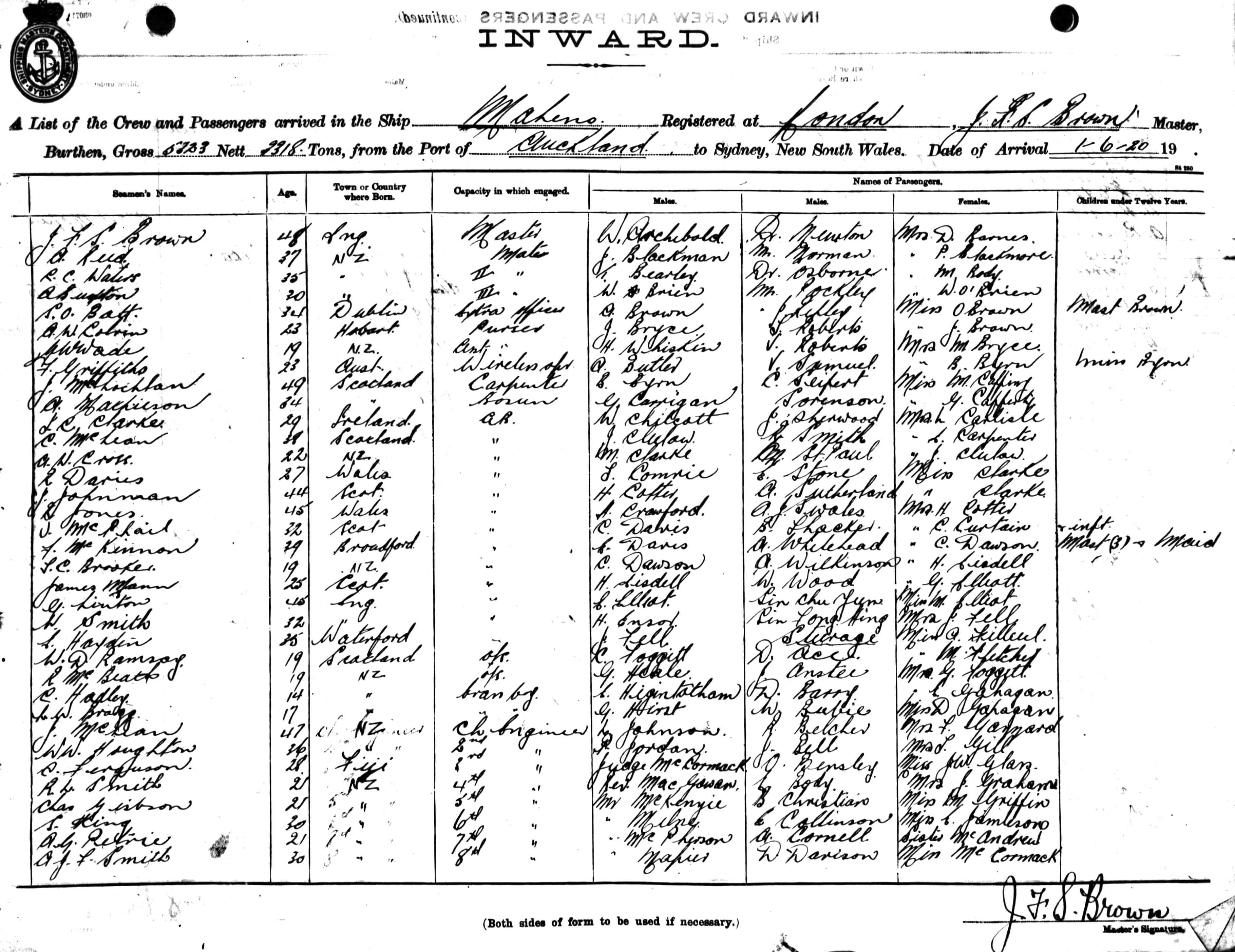 MAHENOOF LONDON, J.F.S. BROWN, MASTER, BURTHEN 5323 / 2318 TONS FROM THE PORT OF AUCKLAND TO SYDNEY, NEW SOUTH WALES, 1ST JUNE 1920 |