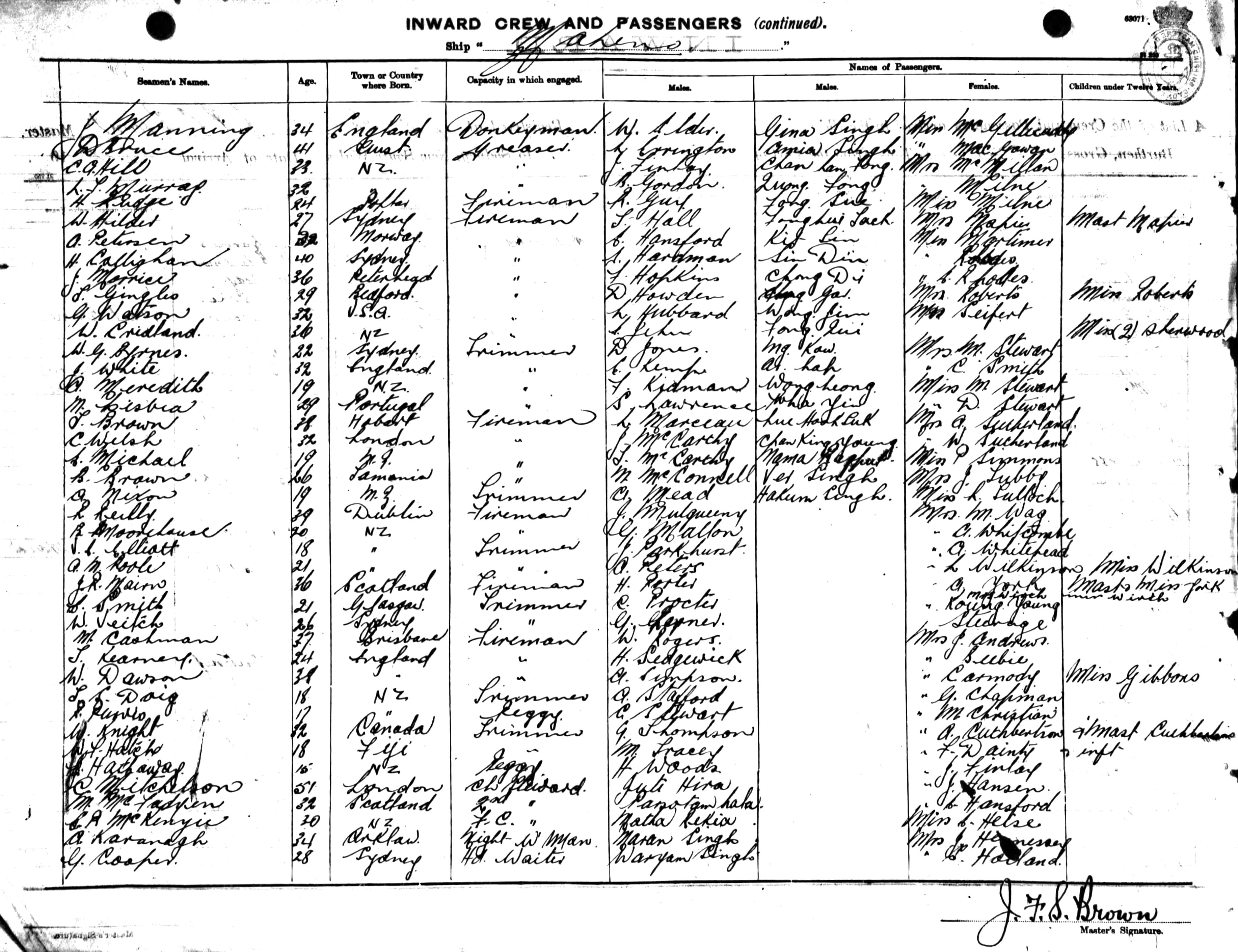 Source: State Records Authority of New South Wales: Shipping Master's Office; Passengers Arriving 1855 - 1922; NRS13278, [X444] reel 2110 & 2111. Transcribed by Nerryle Scriven. Proofread by Lyn & Maurie. You may view/print a scan of the original list - a monitor set to high resolution is recommended for clarity. Use your back button to return. |