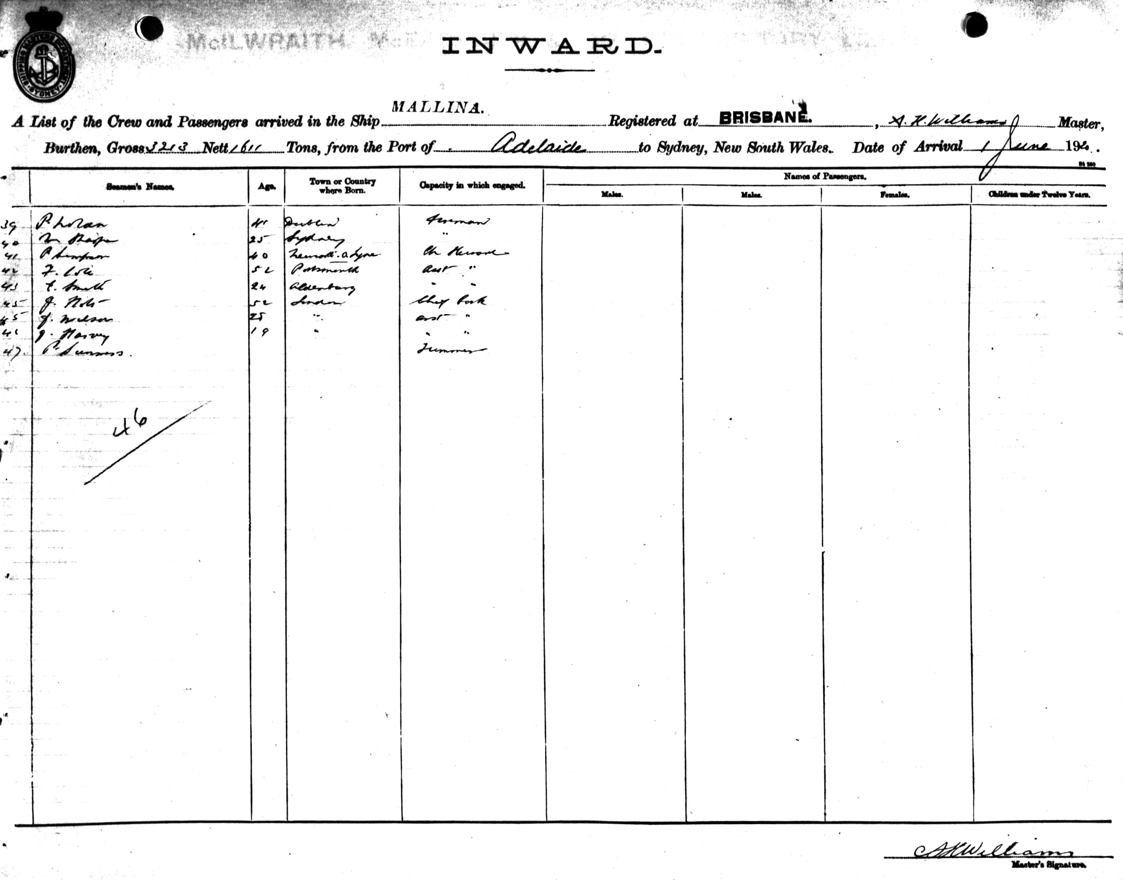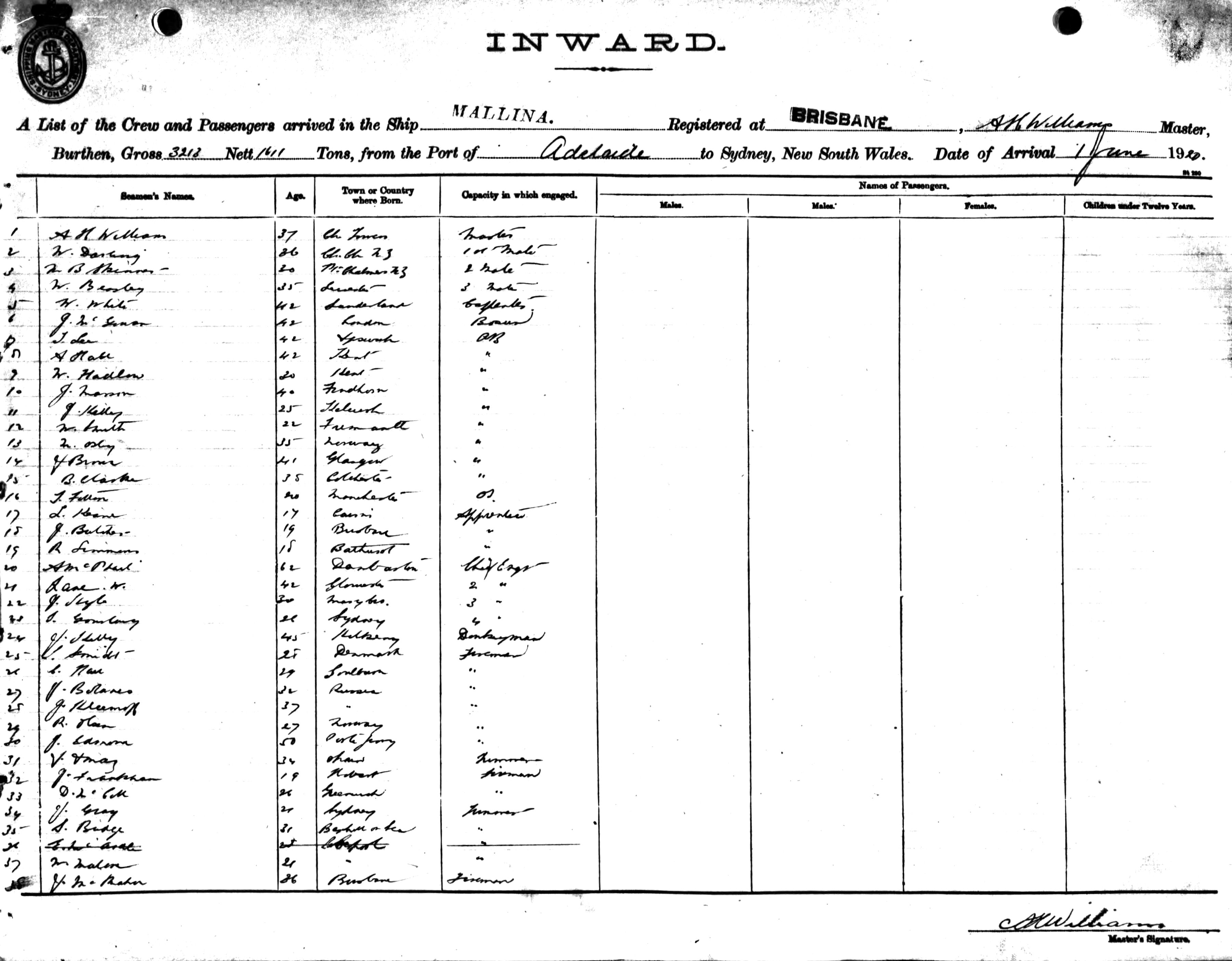 MALLINAOF BRISBANE, A.H. WILLIAMS, MASTER, BURTHEN, 3213 / 1611 TONS FROM THE PORT OF ADELAIDE TO SYDNEY, NEW SOUTH WALES, 1ST JUNE 1920 |