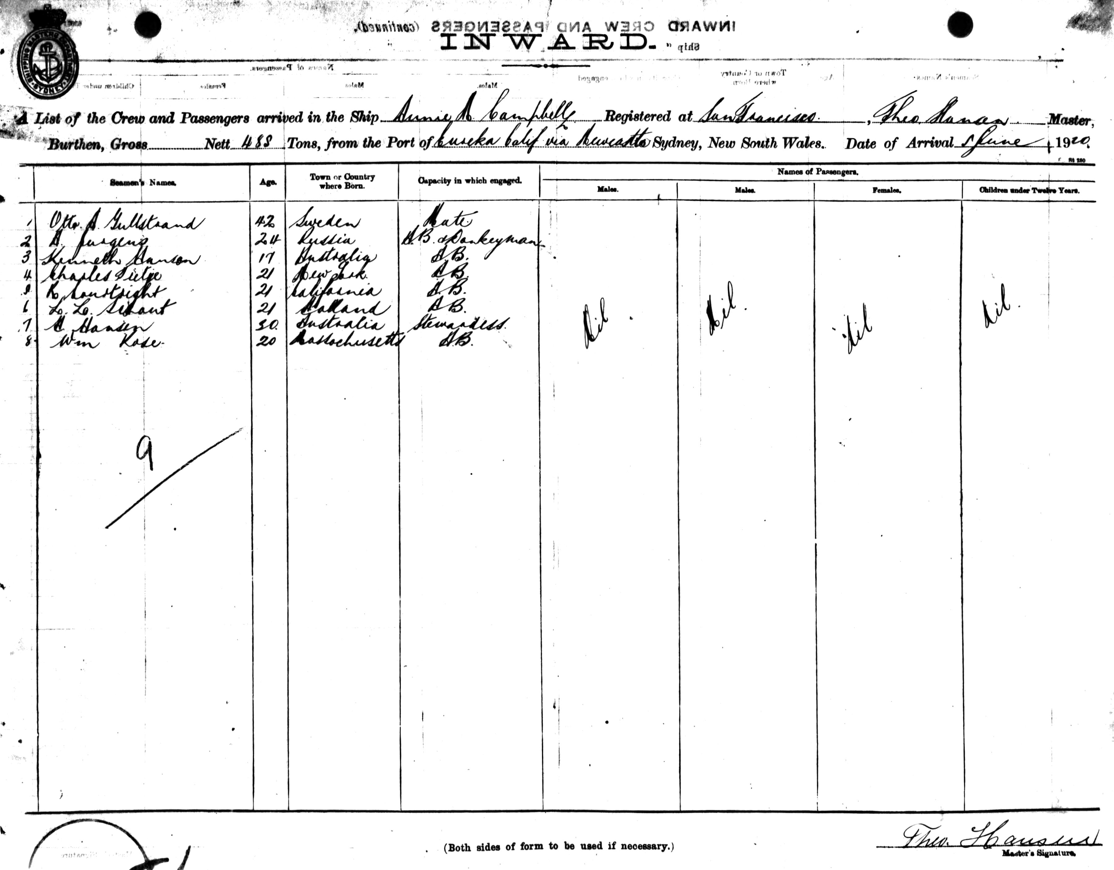 ANNIE M CAMPBELLOF SAN FRANCISCO, THEO HANSEN, MASTER, BURTHEN 488 TONS FROM THE PORT OF EUREKA, CALIFORNIA VIA NEWCASTLE TO SYDNEY, NEW SOUTH WALES, 5TH JUNE 1920 |