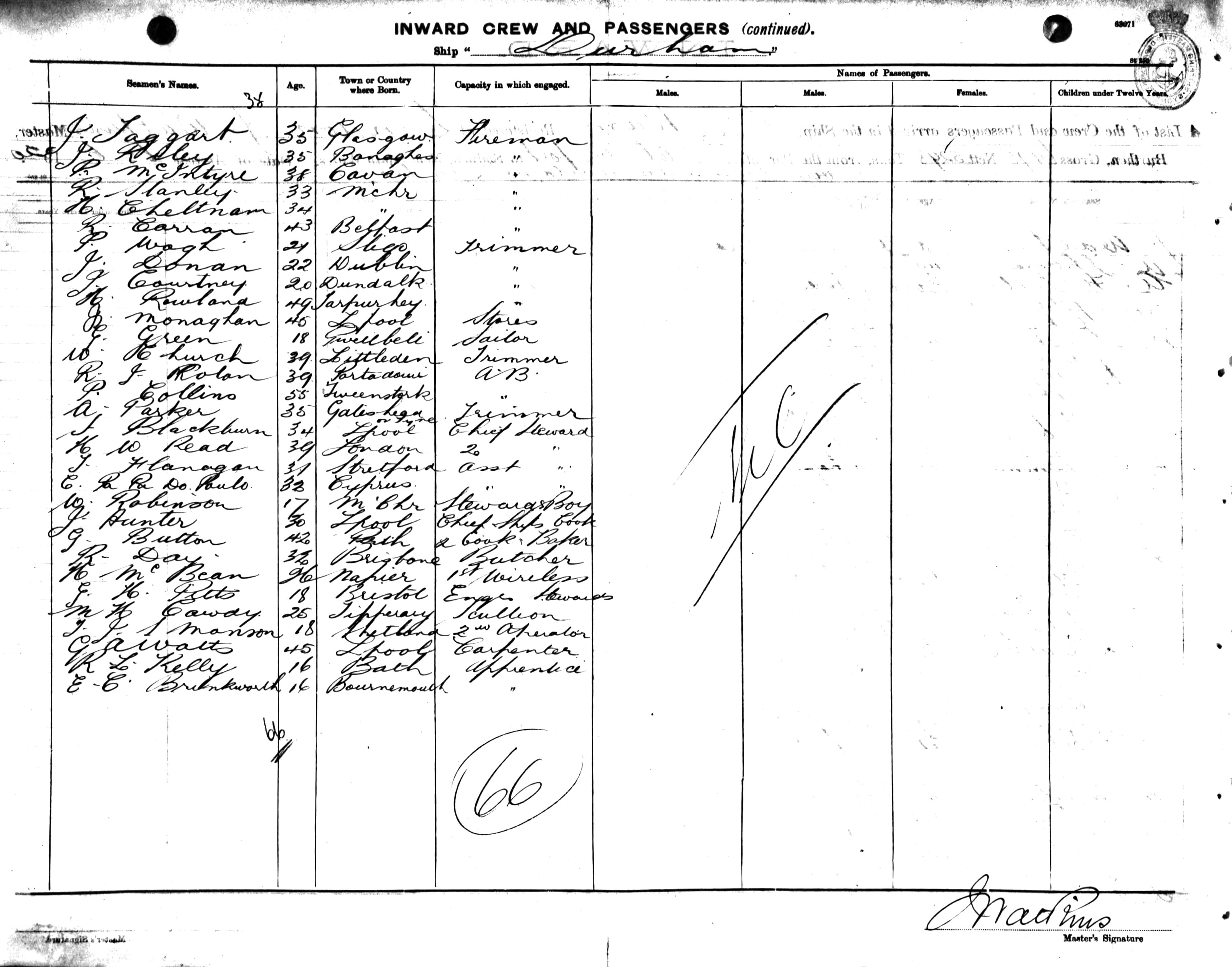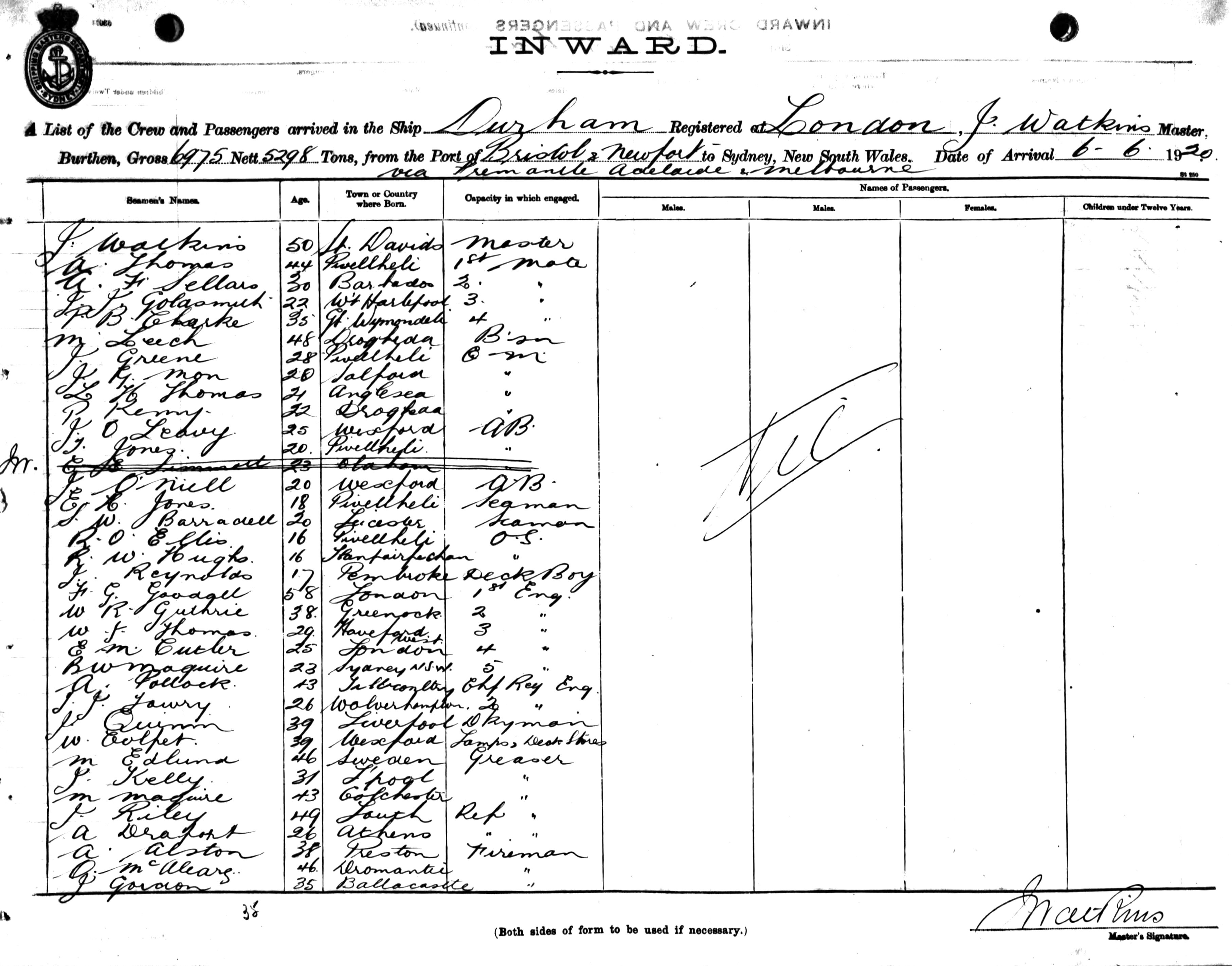 DURHAMOF LONDON, J. WATKINS, MASTER, BURTHEN 6975 / 5298 TONS FROM THE PORTS OF BRISTOL & NEWPORT VIA FREMANTLE, ADELAIDE & MELBOURNE TO SYDNEY, NEW SOUTH WALES, 6TH JUNE 1920 |