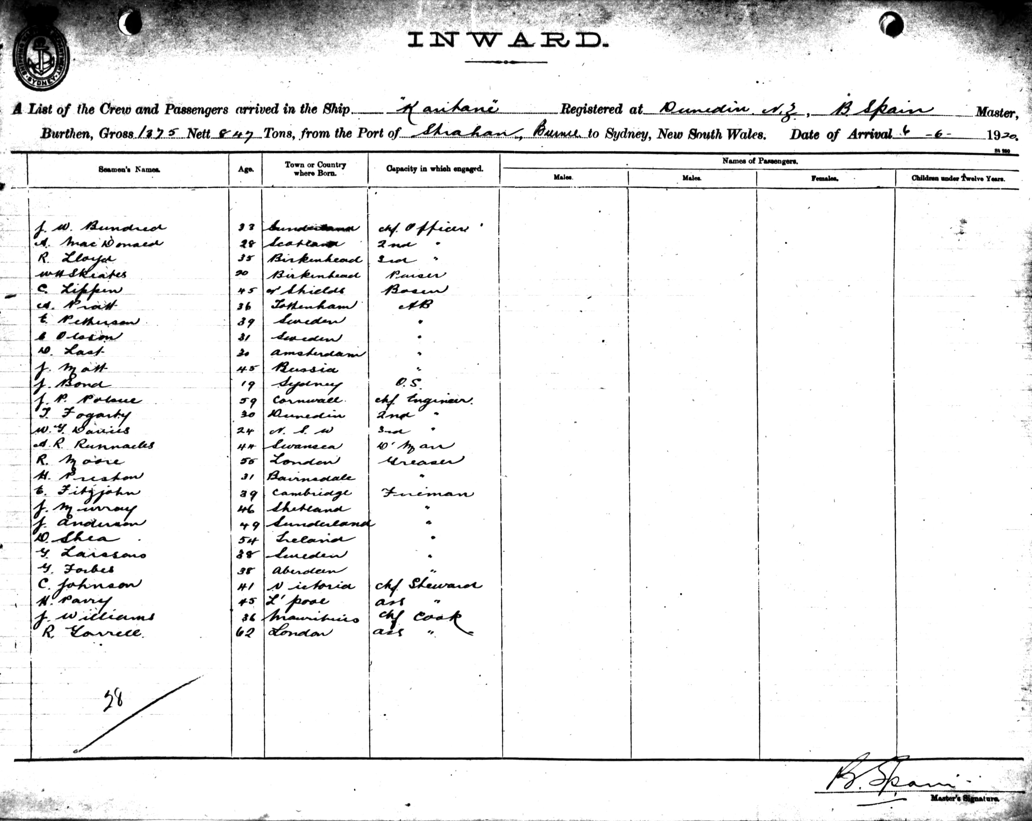 KARITANEOF DUNEDIN, N.Z., B. SPAIN, MASTER, BURTHEN 1375 / 847 TONS FROM THE PORTS OF STRAHAN & BURNIE TO SYDNEY, NEW SOUTH WALES, 6TH JUNE 1920 |