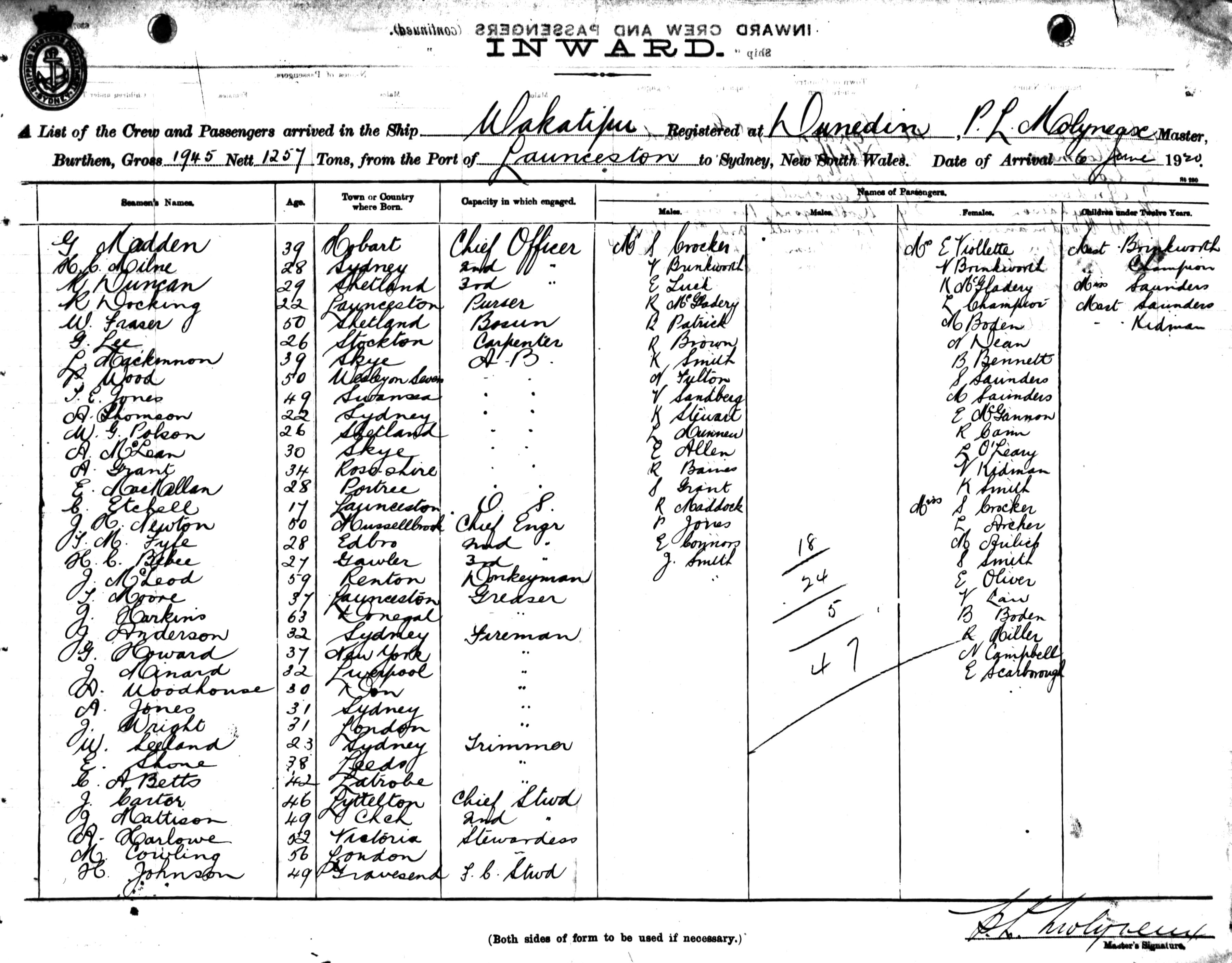 WAKATIPUOF DUNEDIN, P.L. MOLYNEAUX, MASTER, BURTHEN 1945 / 1257 TONS FROM the PORT OF LAUNCESTON TO SYDNEY, NEW SOUTH WALES, 6TH JUNE 1920 |