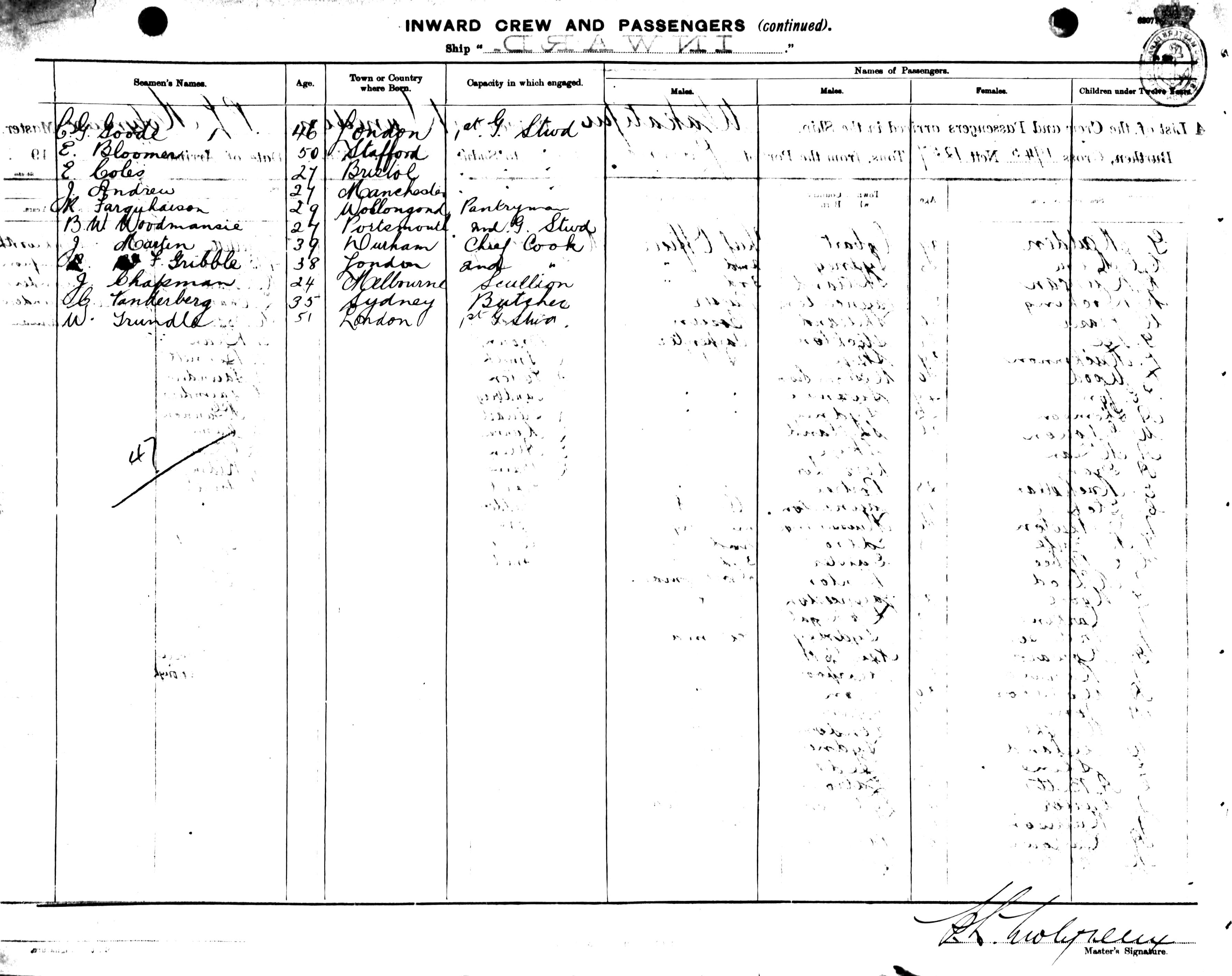 Source: State Records Authority of New South Wales: Shipping Master's Office; Passengers Arriving 1855 - 1922; NRS13278, [X444] reel 2110 & 2111. Transcribed by Nerryle Scriven. Proofread by Lyn & Maurie. You may view/print a scan of the original list - a monitor set to high resolution is recommended for clarity. Use your back button to return. |