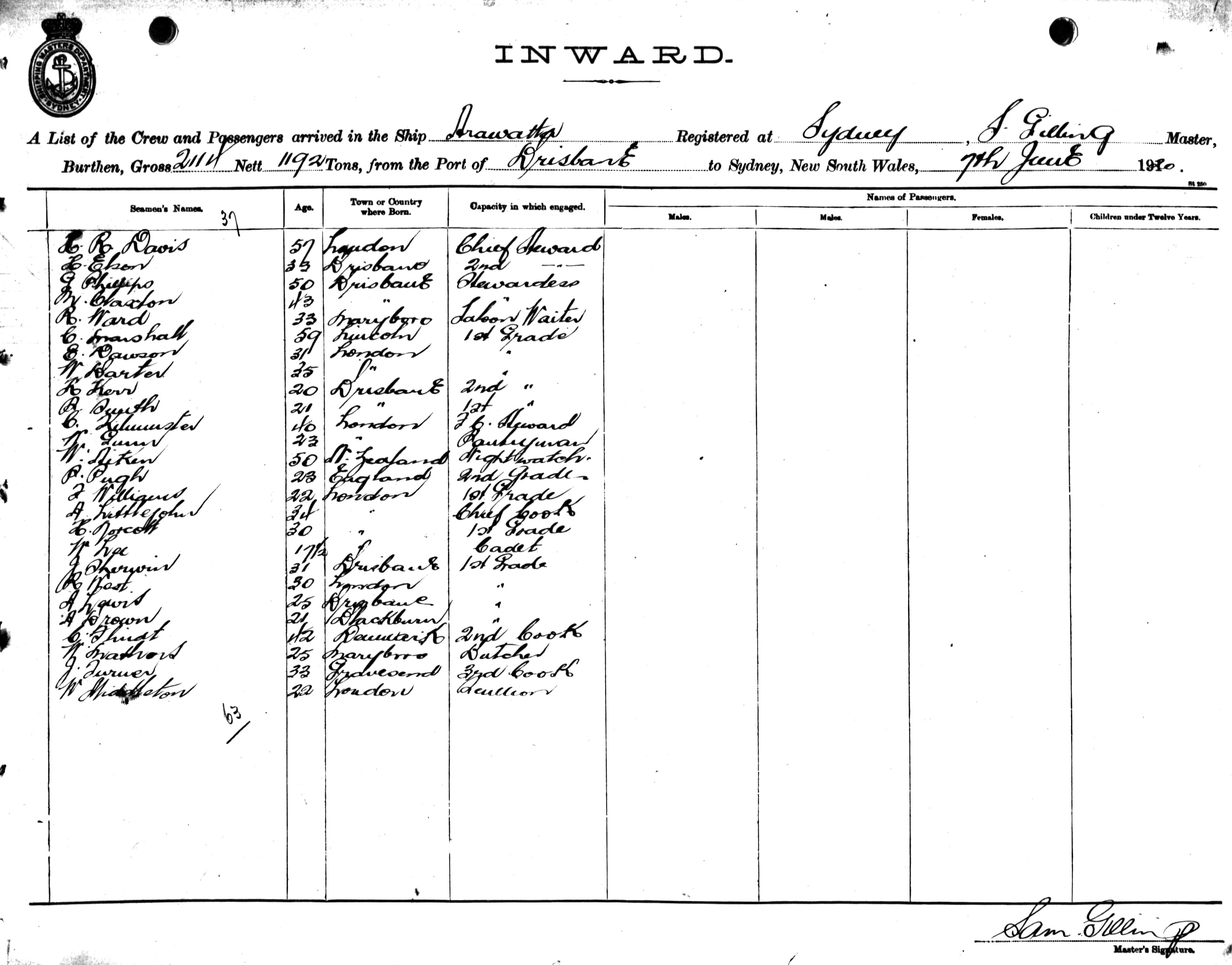 ARAWATTAOF SYDNEY, S. GILLING, MASTER, BURTHEN 2114 / 1192 TONS FROM THE PORT OF BRISBANE & QUEENSLAND PORTS TO SYDNEY, NEW SOUTH WALES, 7TH JUNE 1920 |