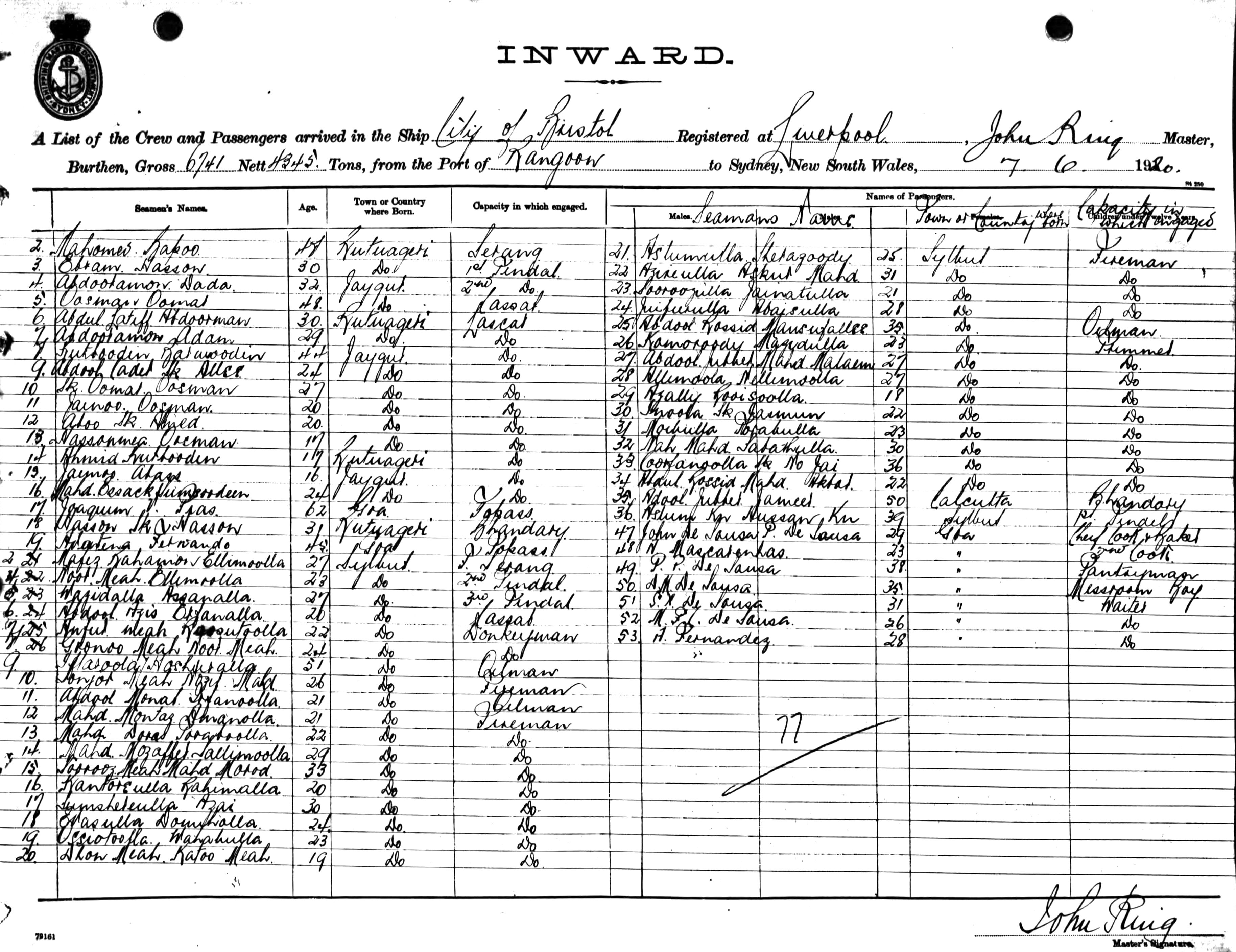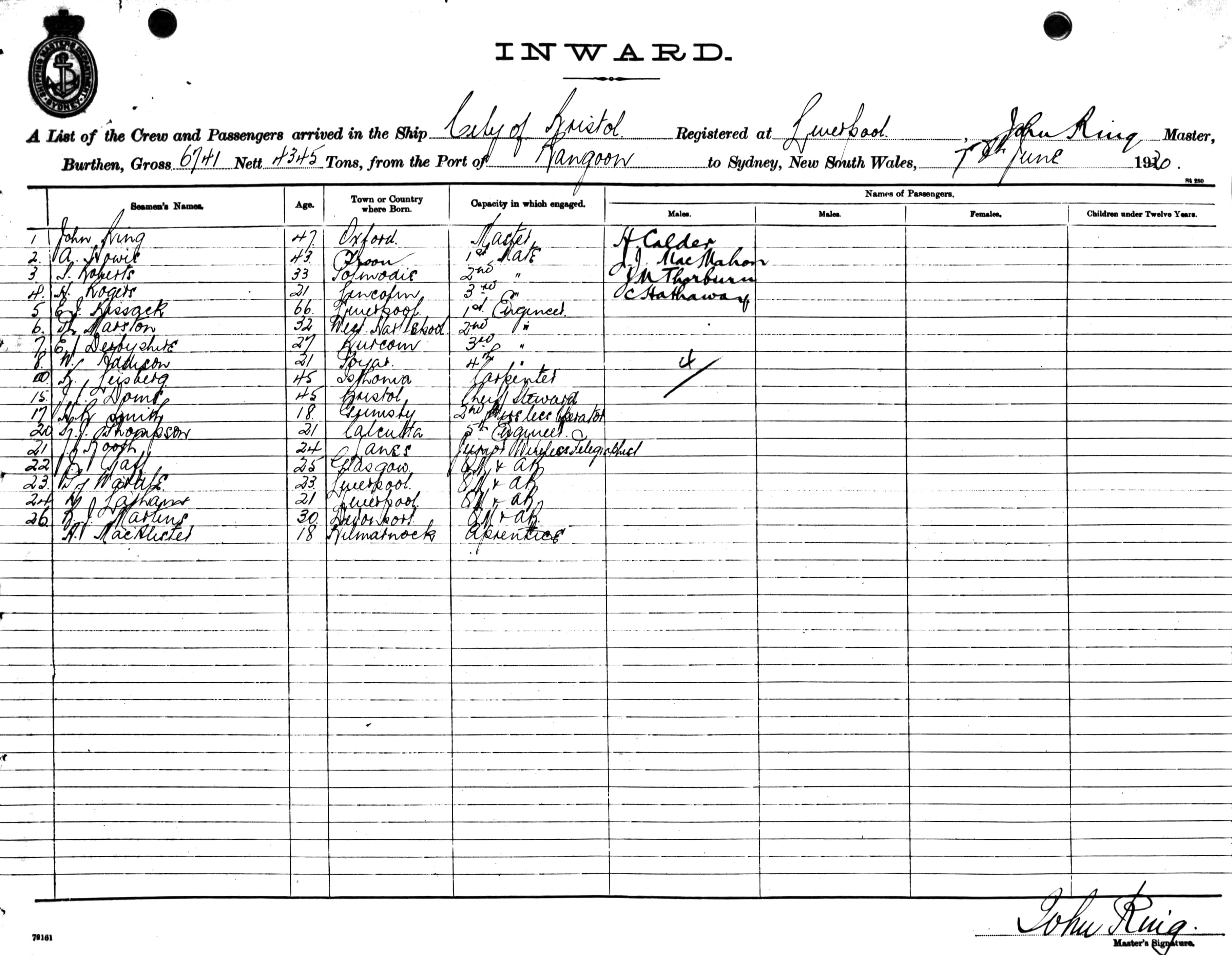 CITY OF BRISTOLOF LIVERPOOL, JOHN RING, MASTER, BURTHEN, 6741 / 4345 TONS FROM THE PORT OF RANGOON TO SYDNEY, NEW SOUTH WALES, 7TH JUNE, 1920 |