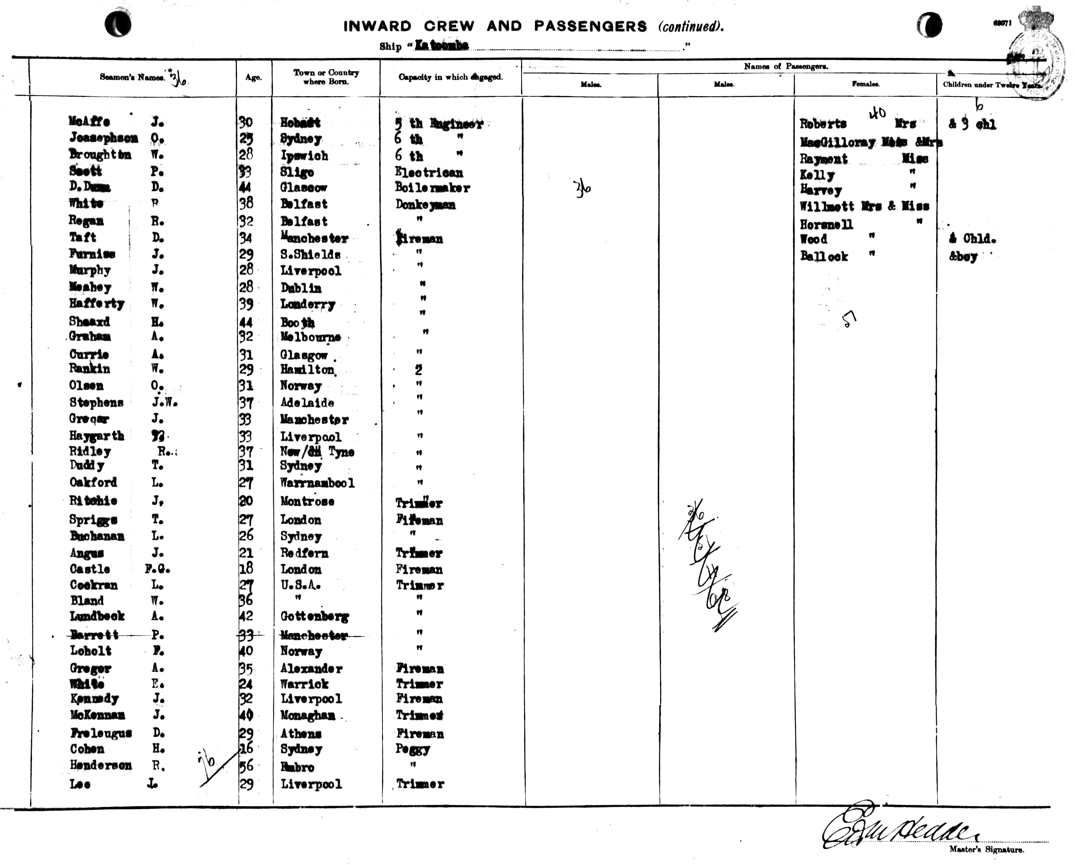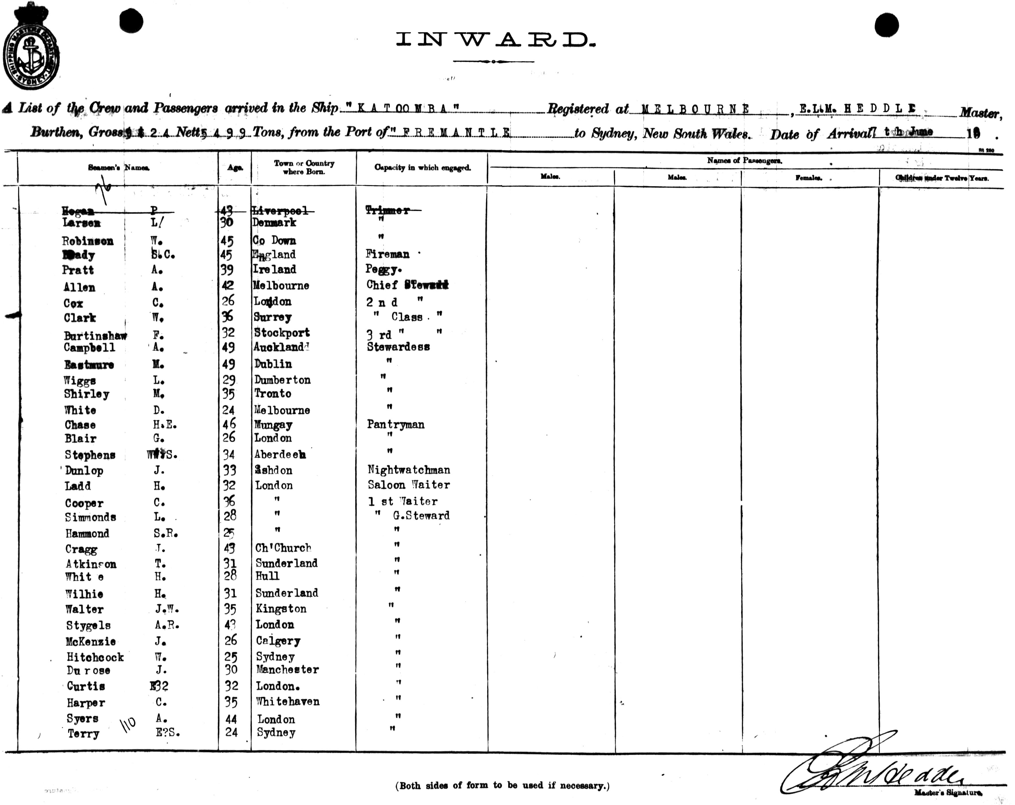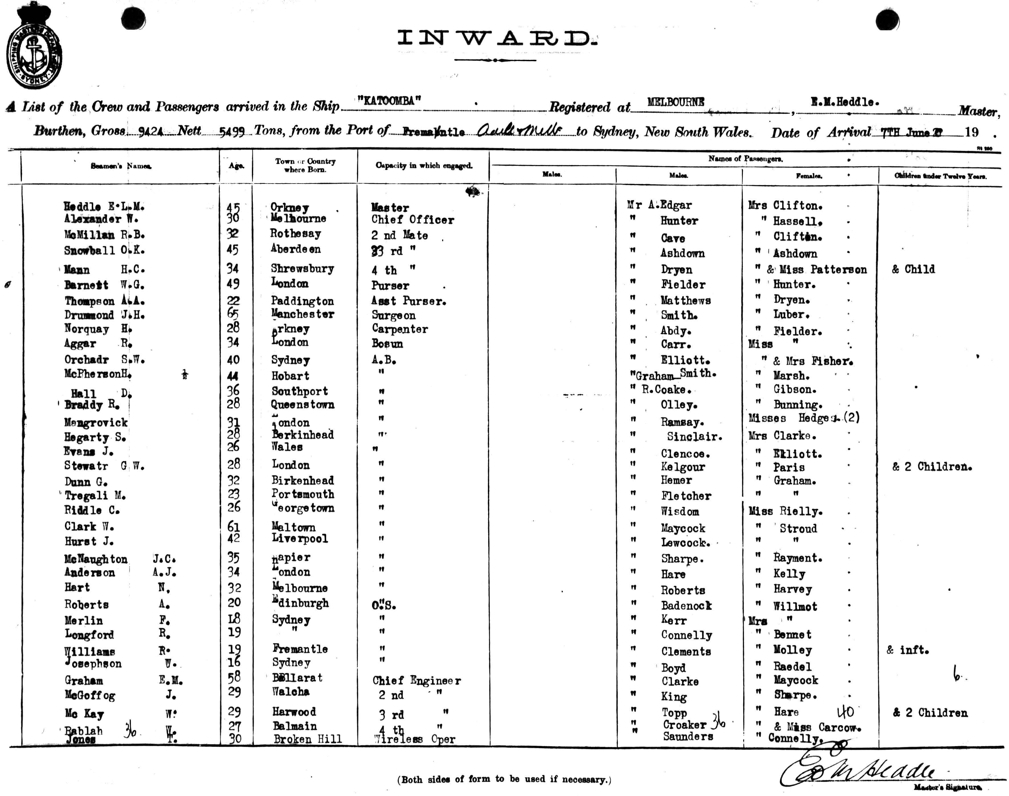 KATOOMBAOF MELBOURNE, E.M. HEDDLE, MASTER, BURTHEN 9424 / 5499 TONS FROM THE PORT OF FREMANTLE, ADELAIDE & MELBOURNE TO SYDNEY, NEW SOUTH WALES, 7TH JUNE 1920 |
