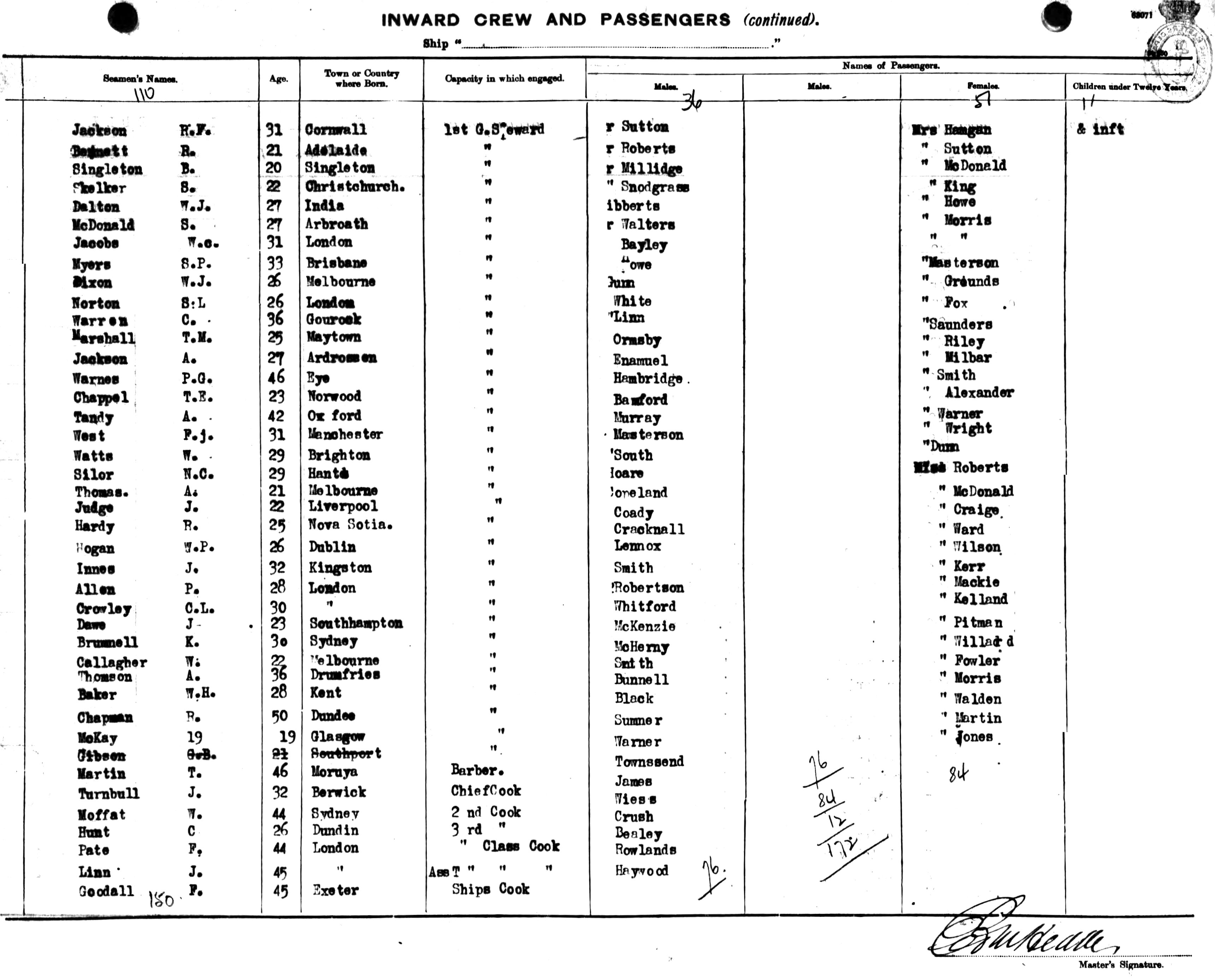 Source: State Records Authority of New South Wales: Shipping Master's Office; Passengers Arriving 1855 - 1922; NRS13278, [X444] reel 2110 & 2111. Transcribed by Nerryle Scriven. Proofread by Lyn & Maurie. You may view/print a scan of the original list - a monitor set to high resolution is recommended for clarity. Use your back button to return. |
