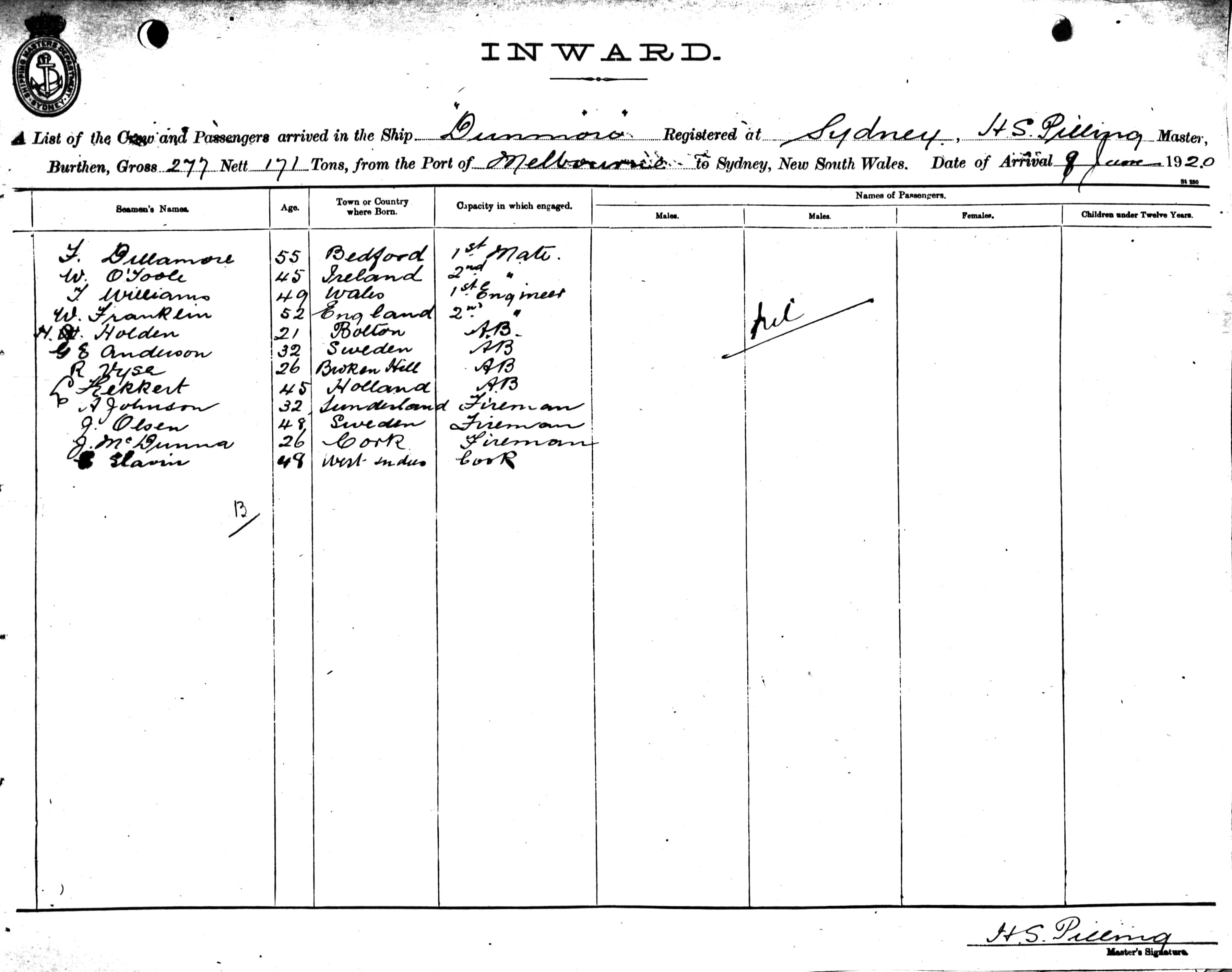 DUNMOREOF SYDNEY, H.S. PILLING, MASTER, BURTHEN 277 / 171 TONS FROM THE PORT OF MELBOURNE TO SYDNEY, NEW SOUTH WALES, 8TH JUNE 1920 |