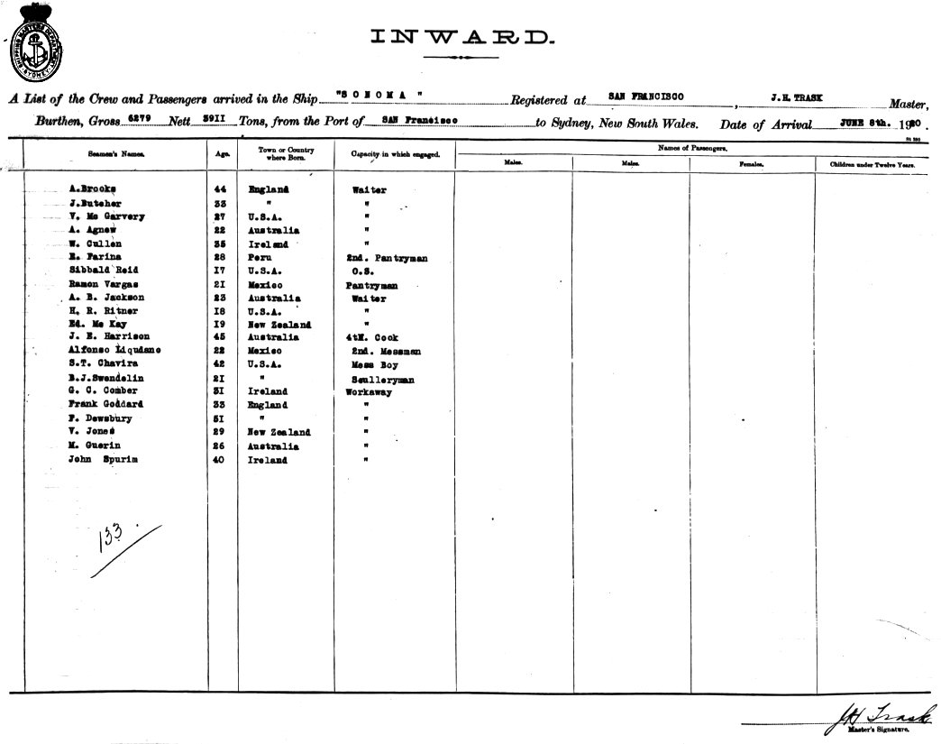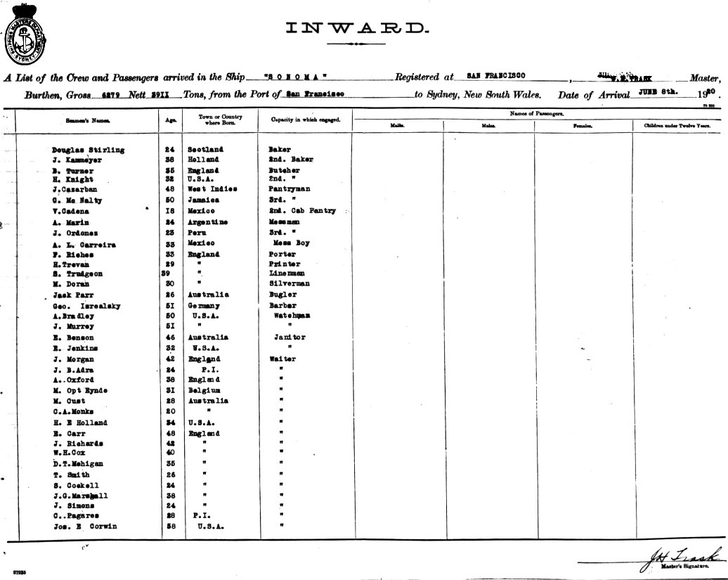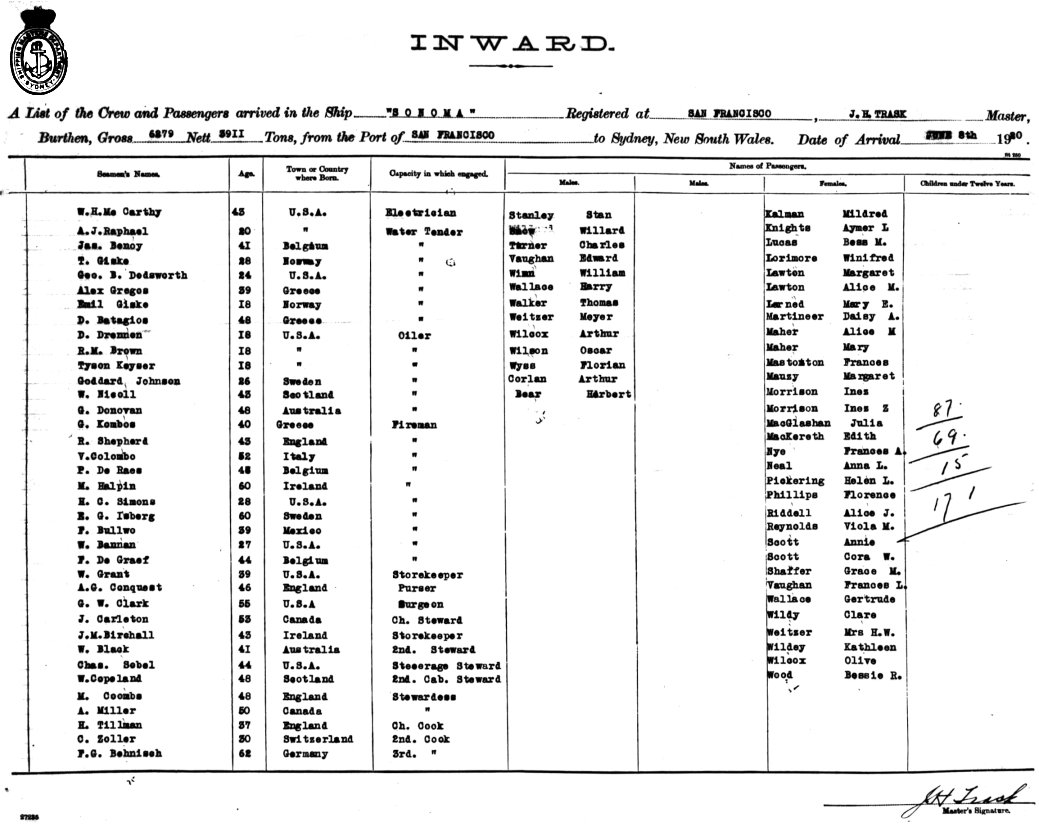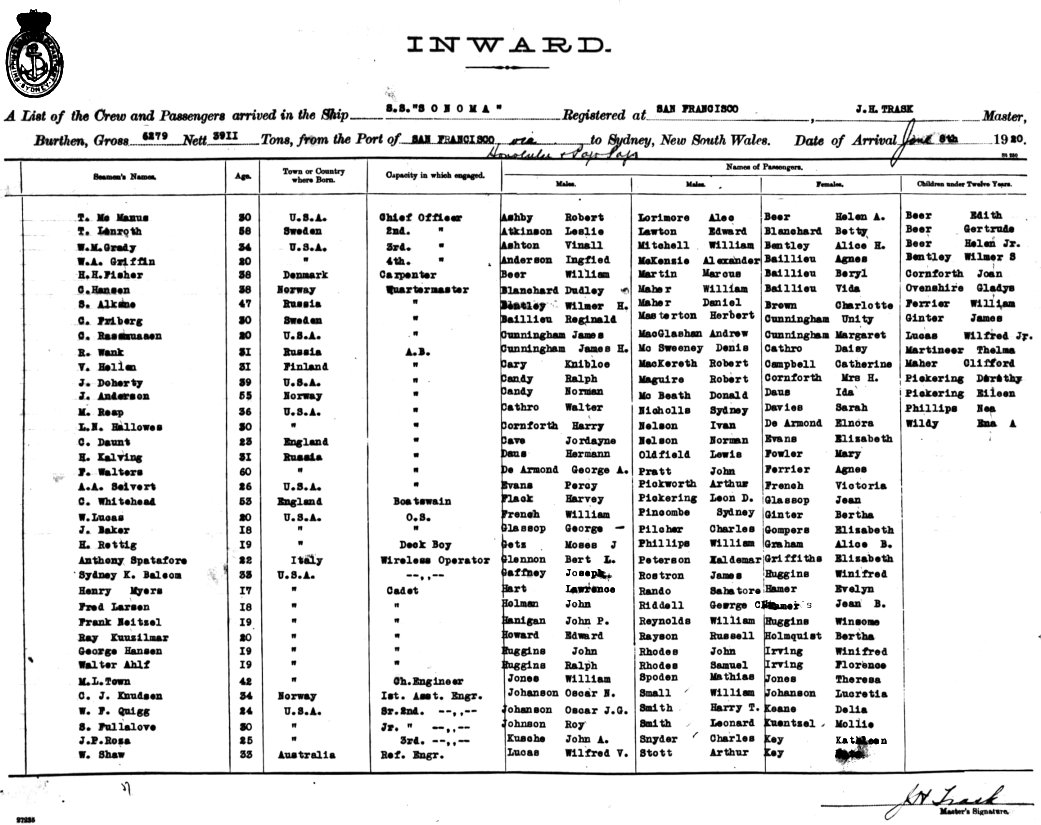 SONOMAOF SAN FRANCISCO, J.M. TRASK, MASTER, BURTHEN 6279 / 3911 TONS FROM THE PORT OF SAN FRANCISCO via HONOLULU & PAGO PAGO TO SYDNEY, NEW SOUTH WALES, 9TH JUNE 1920 |