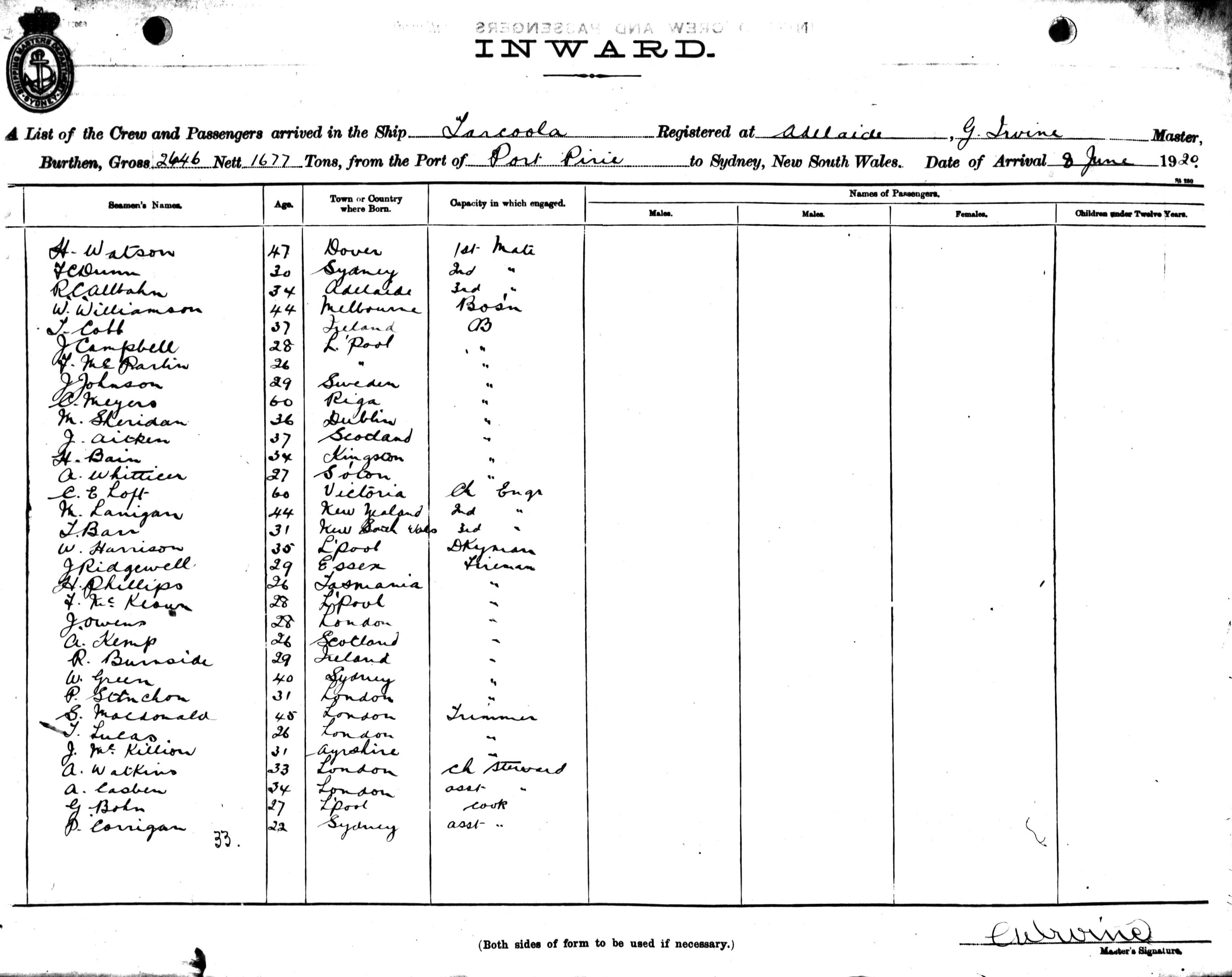 TARCOOLAOF ADELAIDE, G. IRVINE, MASTER, BURTHEN, 2646 / 1677 TONS FROM THE PORT OF PORT PIRIE TO SYDNEY, NEW SOUTH WALES, 8TH JUNE 1920 |