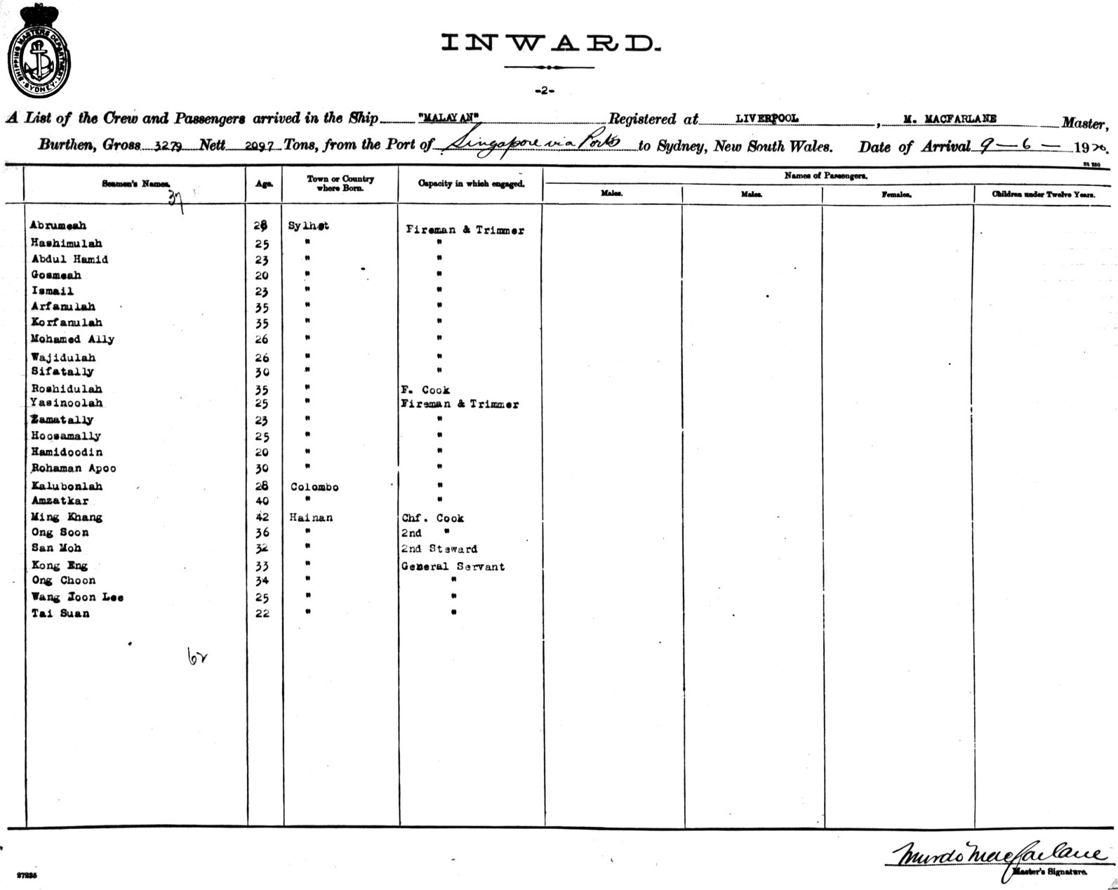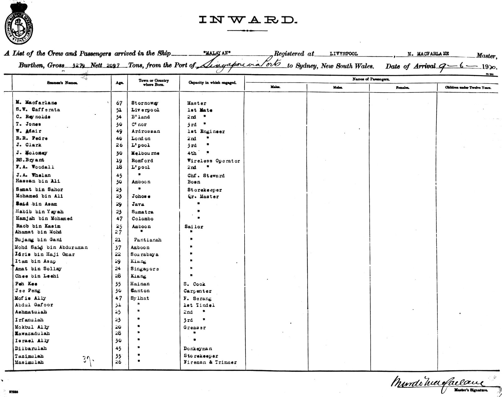MALAYANOF LIVERPOOL, M MACFARLANE, MASTER, BURTHEN 3279 / 2097 TONS FROM THE PORT OF SINGAPORE VIA PORTS TO SYDNEY, NEW SOUTH WALES, 9TH JUNE 1920 |