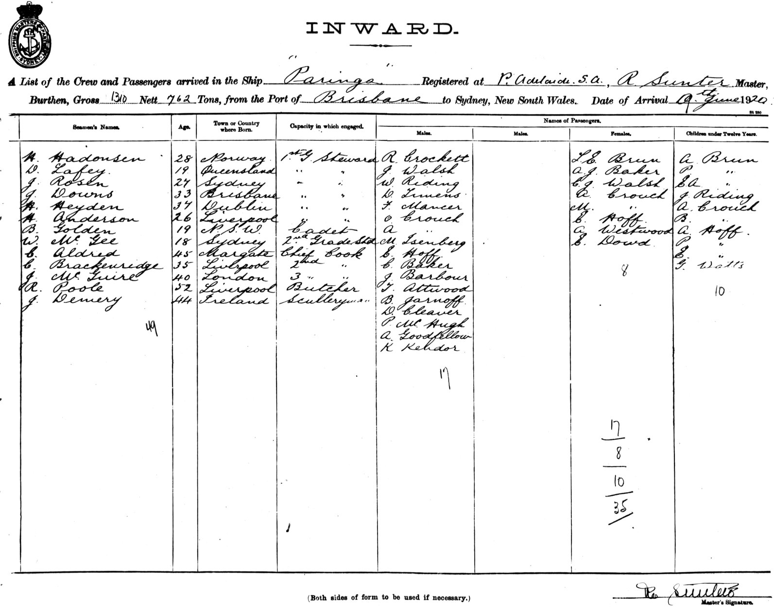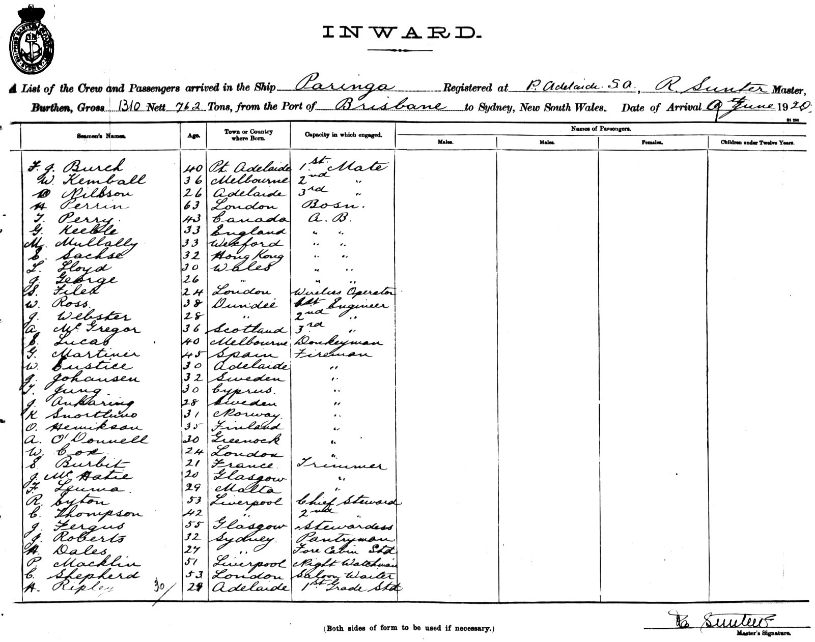 PARINGAOF PORT ADELAIDE, R. SUNTER, MASTER, BURTHEN 1310/762 TONS FROM THE PORT OF BRISBANE TO SYDNEY, NEW SOUTH WALES, 9TH JUNE 1920 |