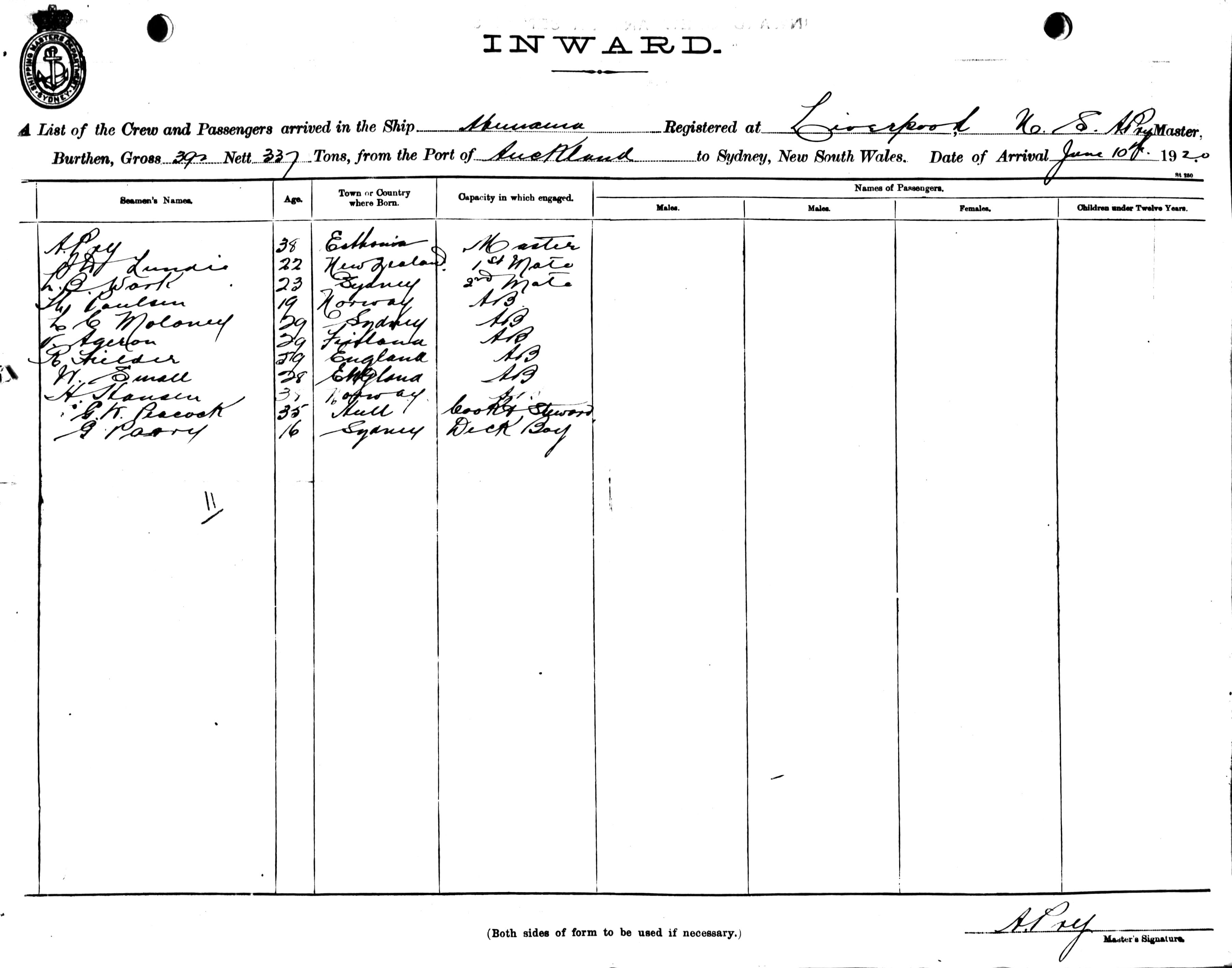 ABEMAMAOF LIVERPOOL, A. PRY, MASTER, BURTHEN 392 / 337 TONS FROM THE PORT OF AUCKLAND TO SYDNEY, NEW SOUTH WALES, 10TH JUNE 1920 |