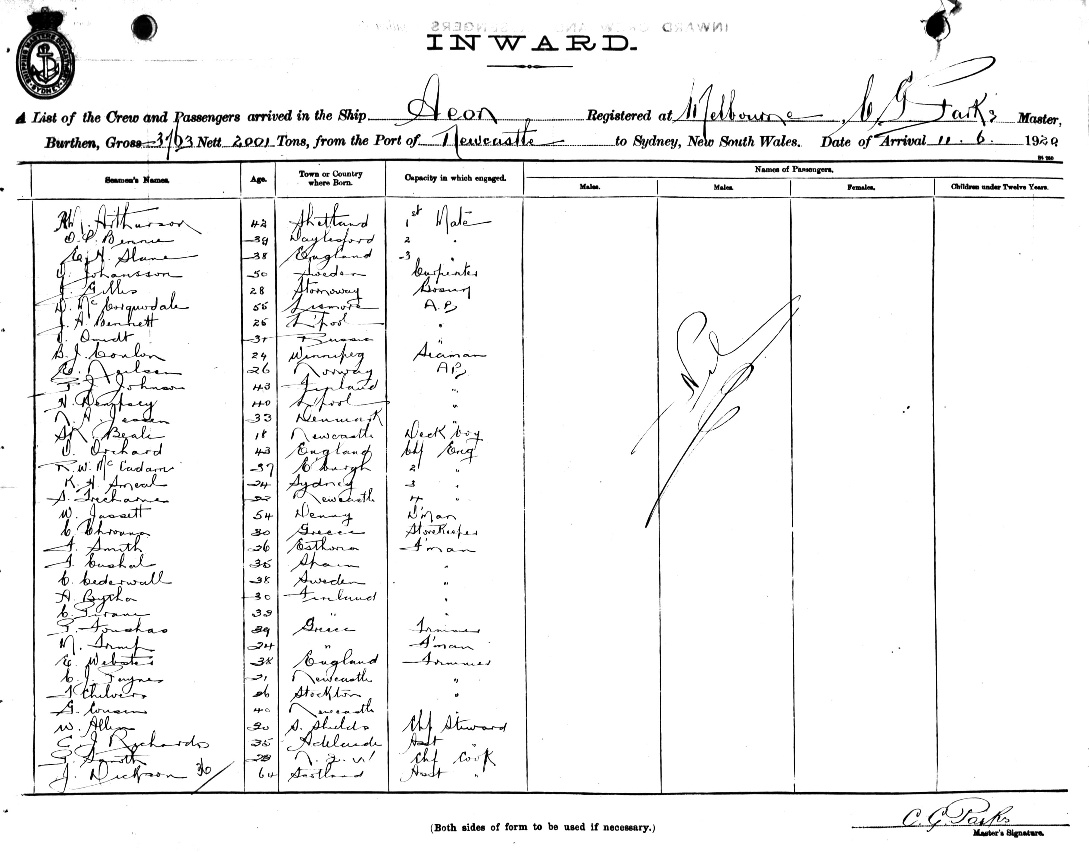 AEONOF MELBOURNE, C.G. STARKS, MASTER, BURTHEN 3763 / 2001 TONS FROM THE PORT OF NEWCASTLE TO SYDNEY, NEW SOUTH WALES, 11TH JUNE 1920 |