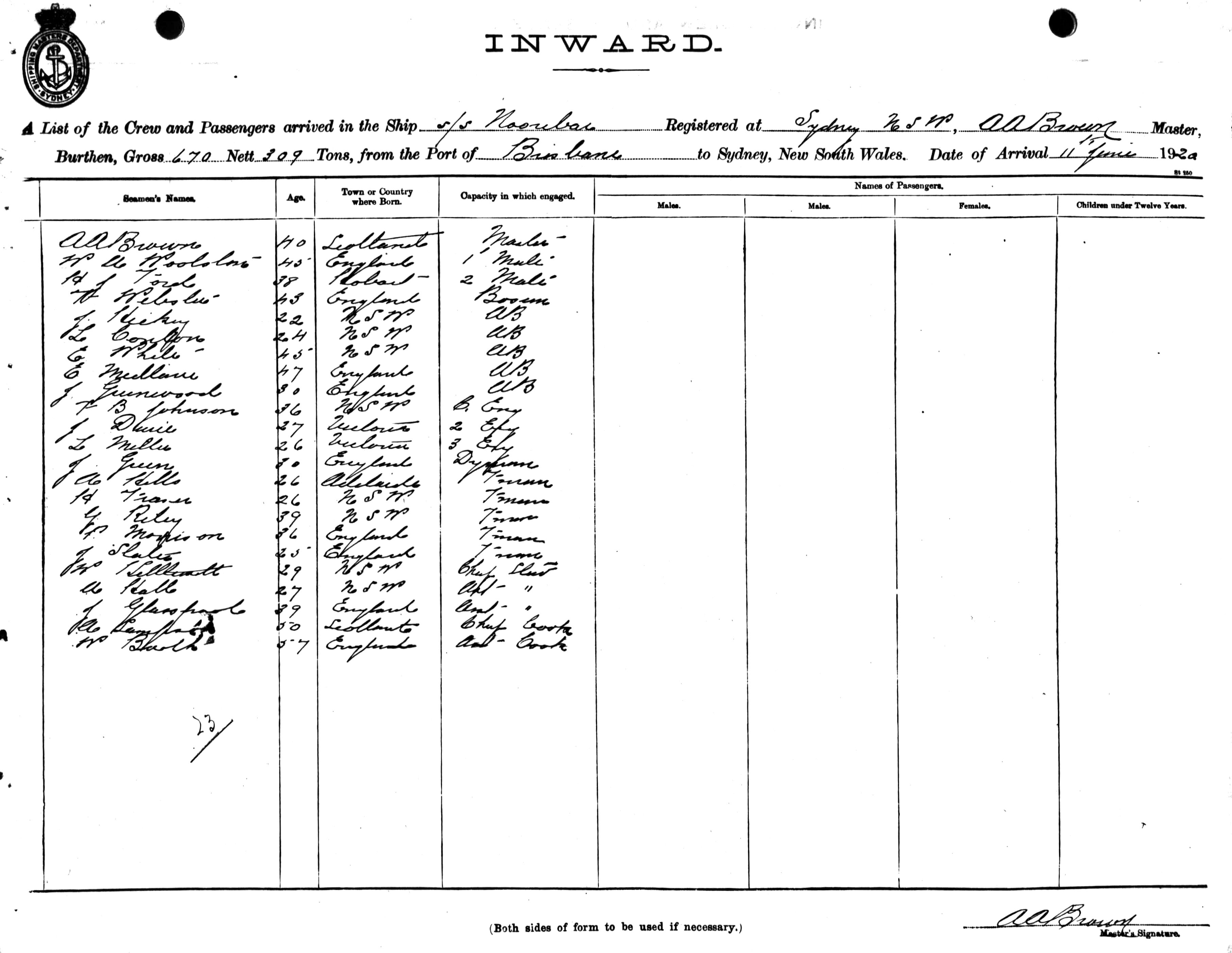 NOOREBAROF SYDNEY, A.A. BROWN, MASTER, BURTHEN 670 / 309 TONS FROM THE PORT OF BRISBANE TO SYDNEY, NEW SOUTH WALES, 11TH JUNE 1920 |