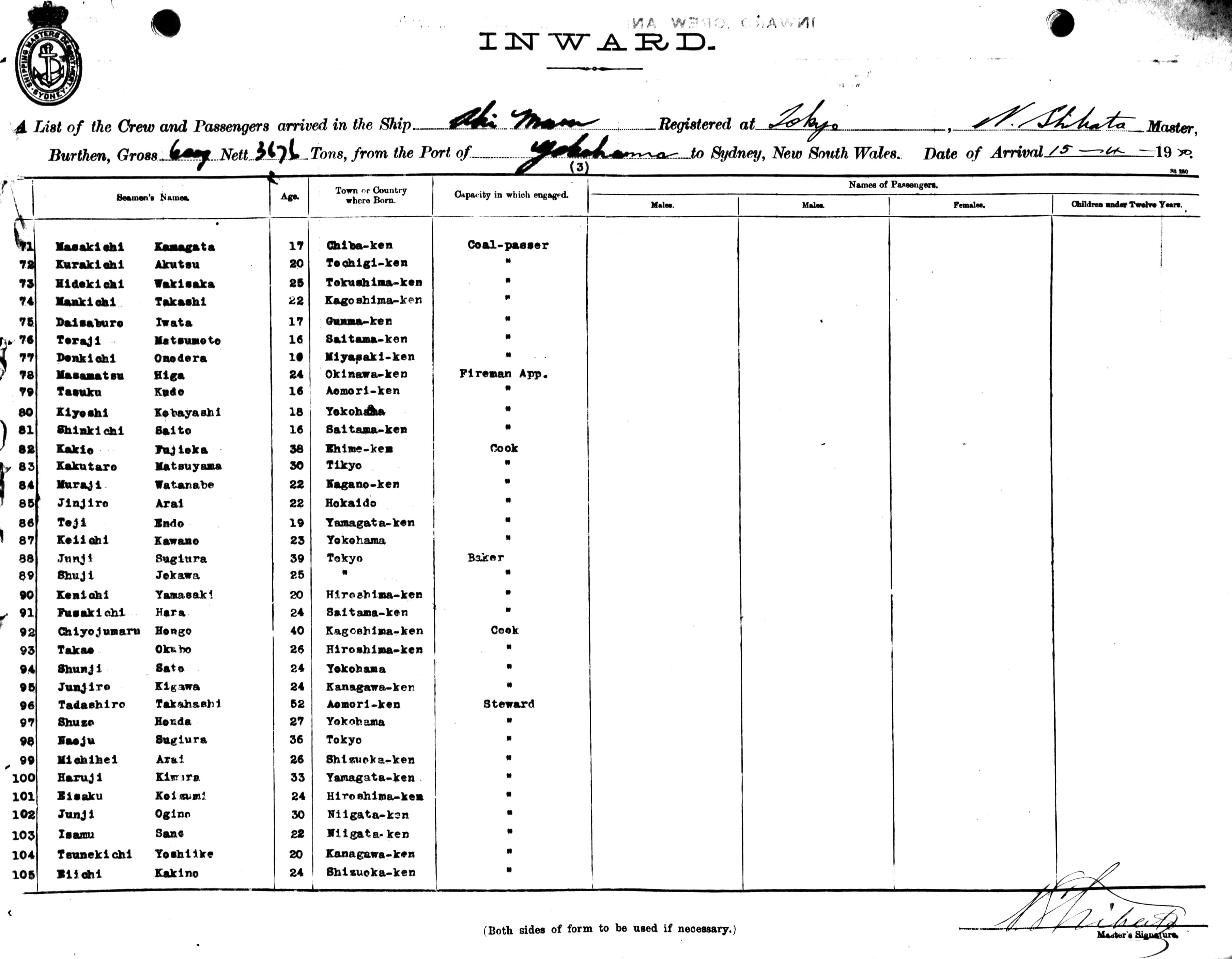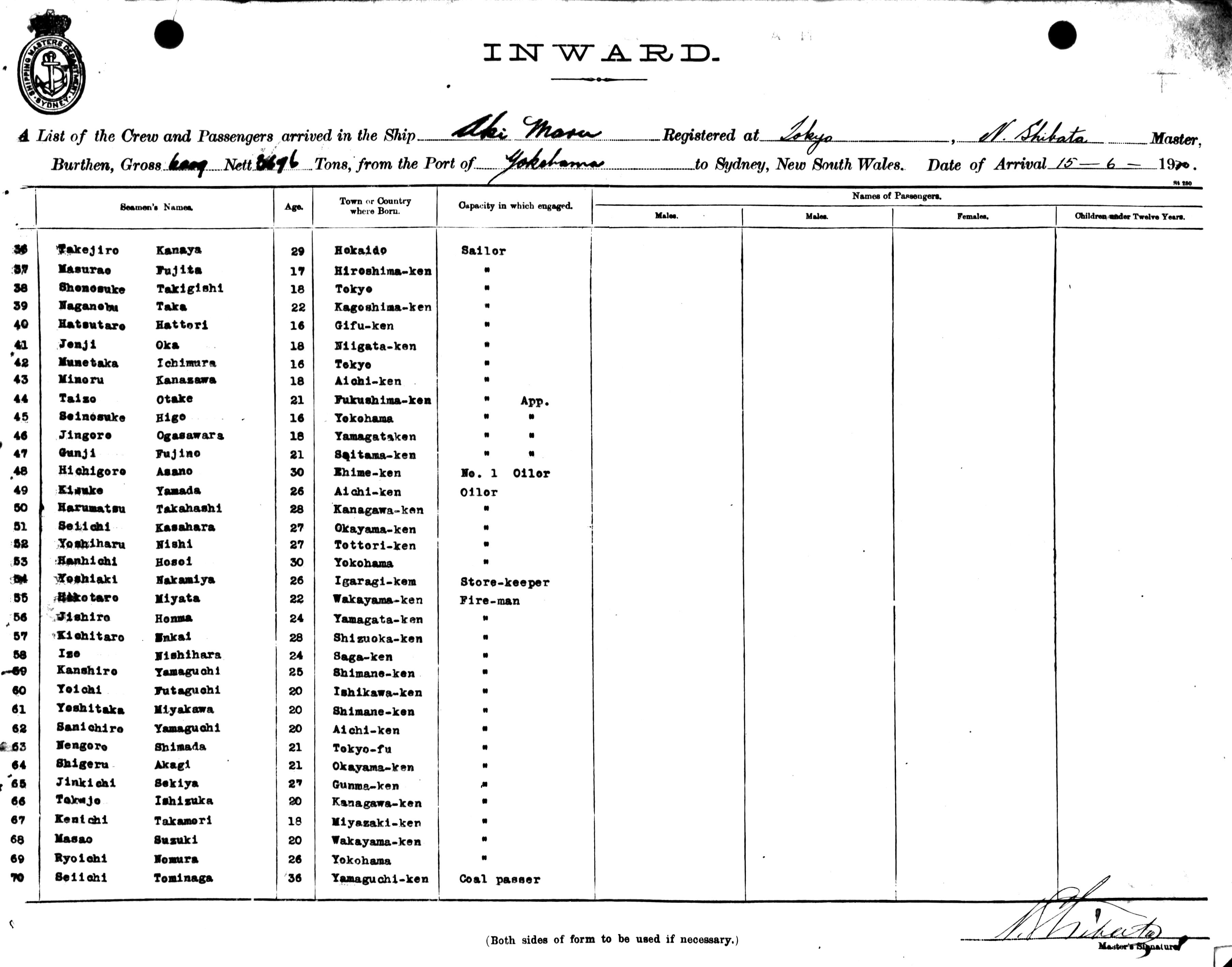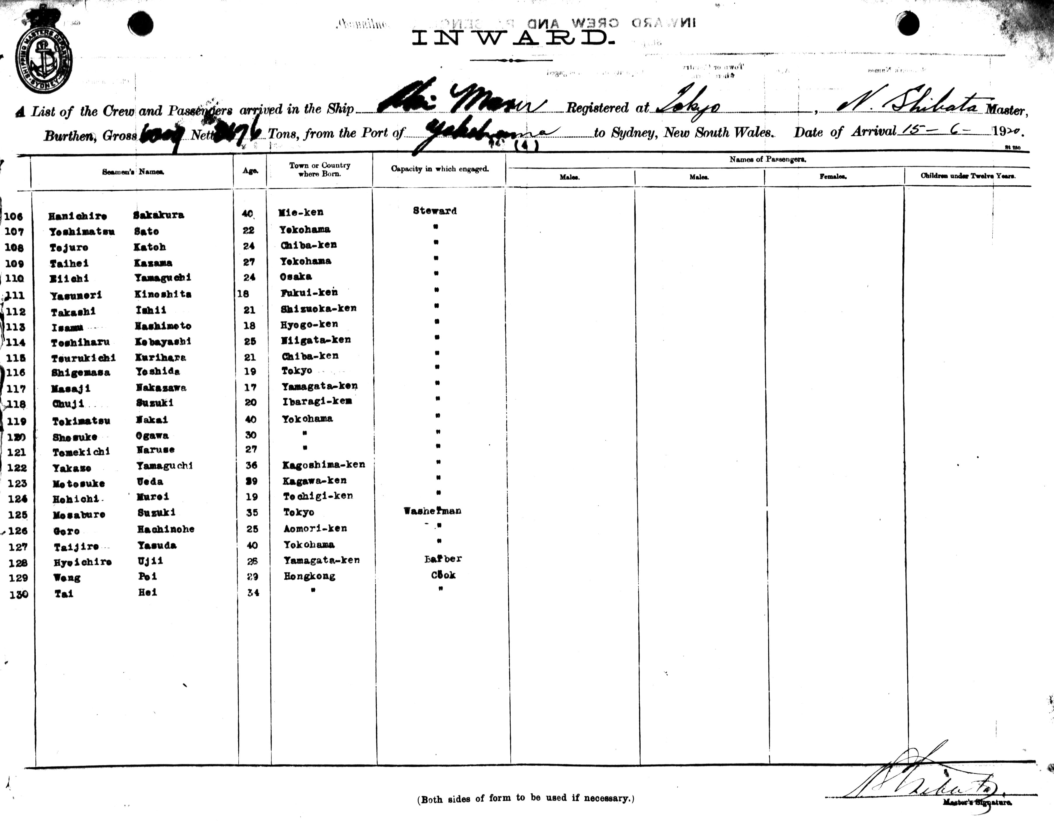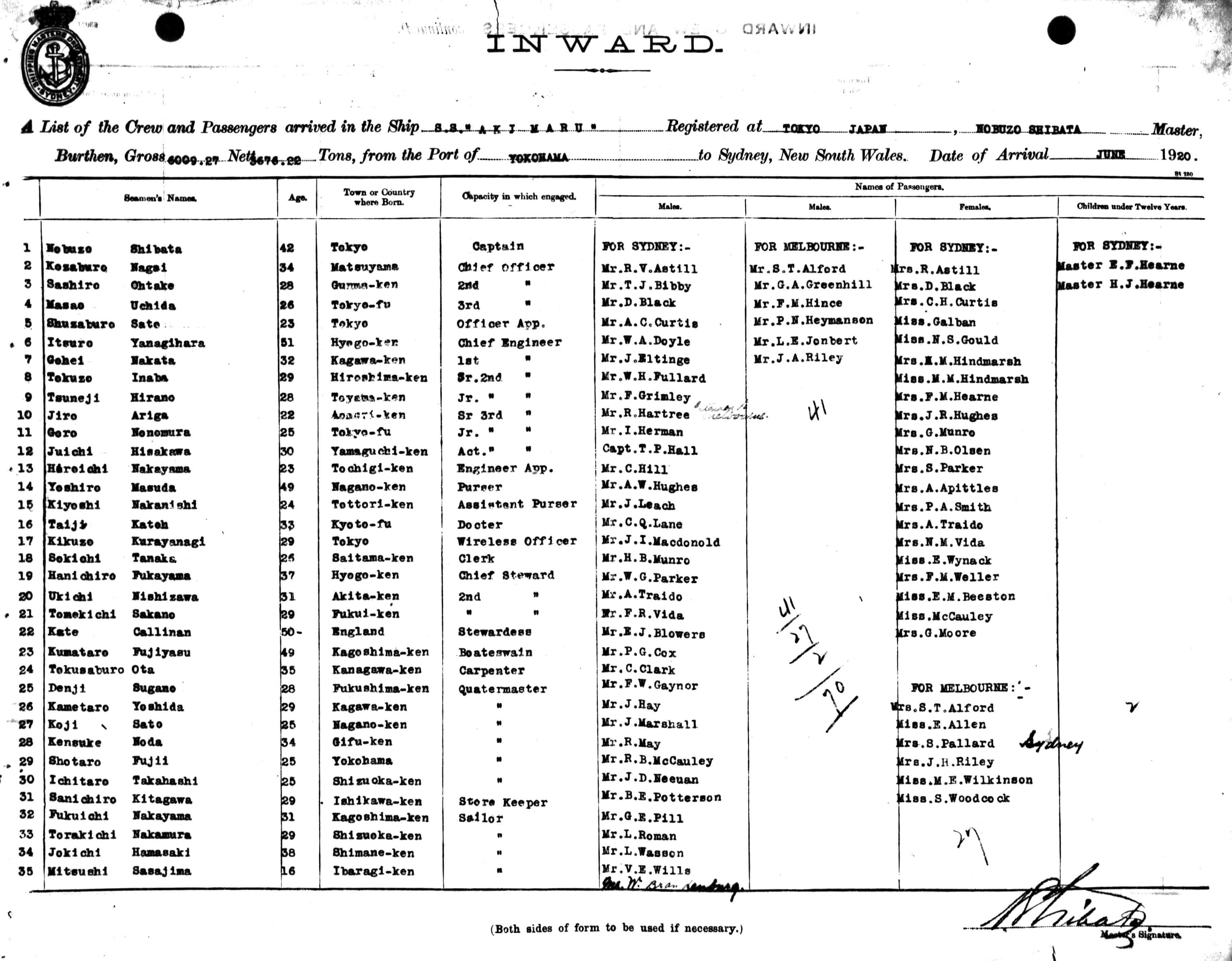 AKI MARUOF TOKYO, JAPAN, NOBUZO SHIBATA, MASTER, BURTHEN 6009 / 3676 TONS FROM THE PORT OF YOKOHAMA TO SYDNEY, NEW SOUTH WALES, (14TH) JUNE 1920 |