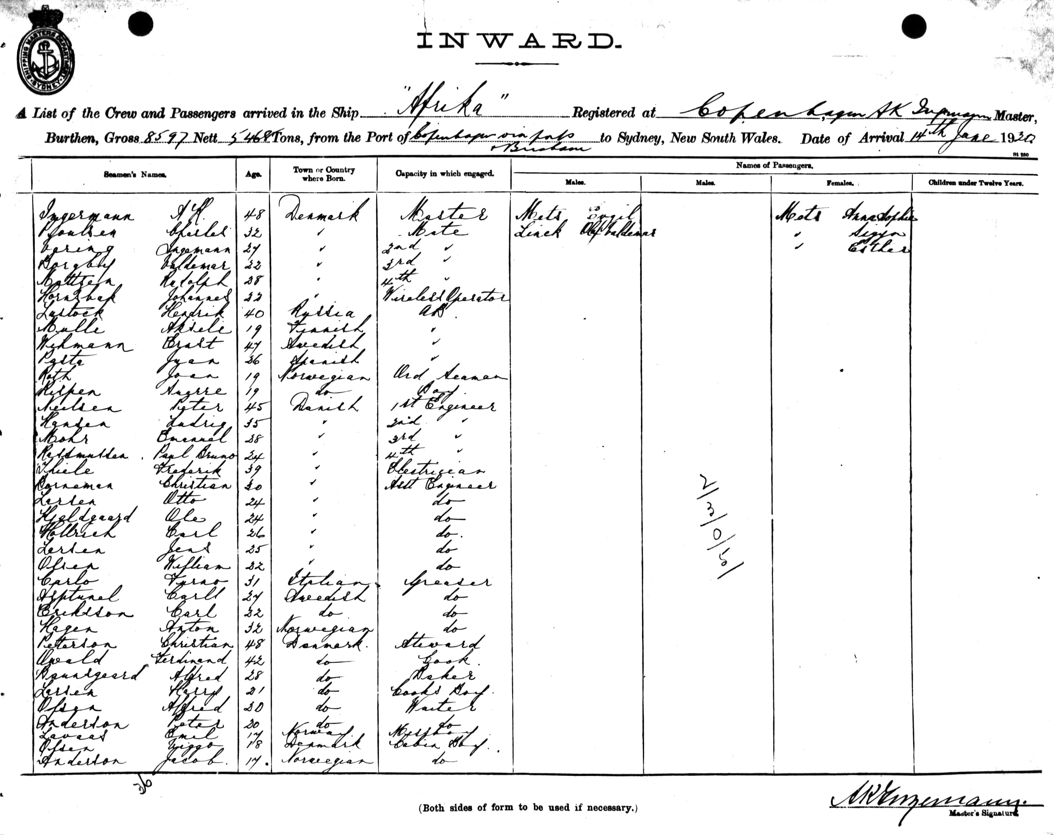 AFRIKAOF COPENHAGEN, A. J. INGEMANN, MASTER, BURTHEN 8597/5468 TONS FROM THE PORT OF COPENHAGEN via PORTS & BRISBANE TO SYDNEY, NEW SOUTH WALES, 14TH JUNE 1920 |