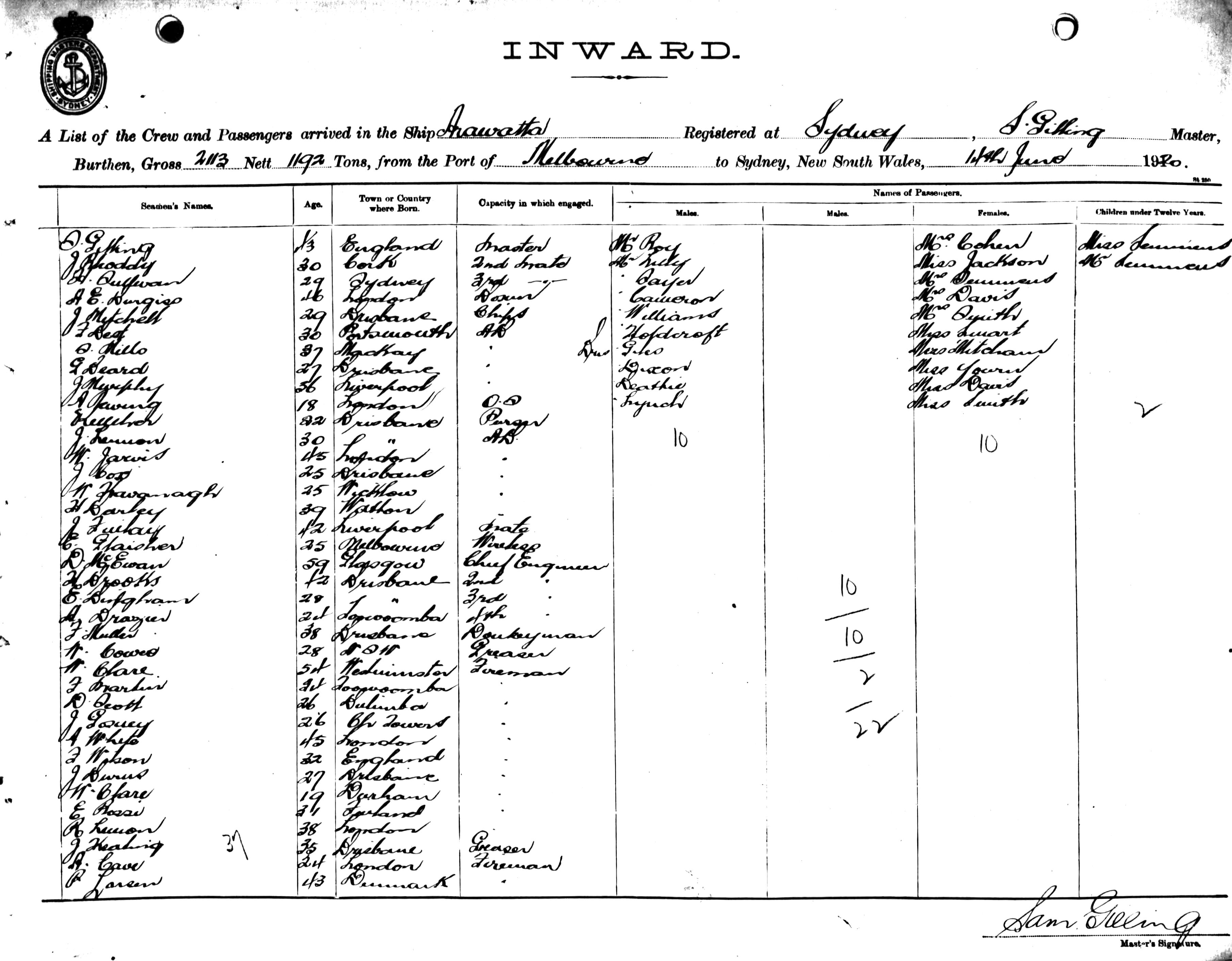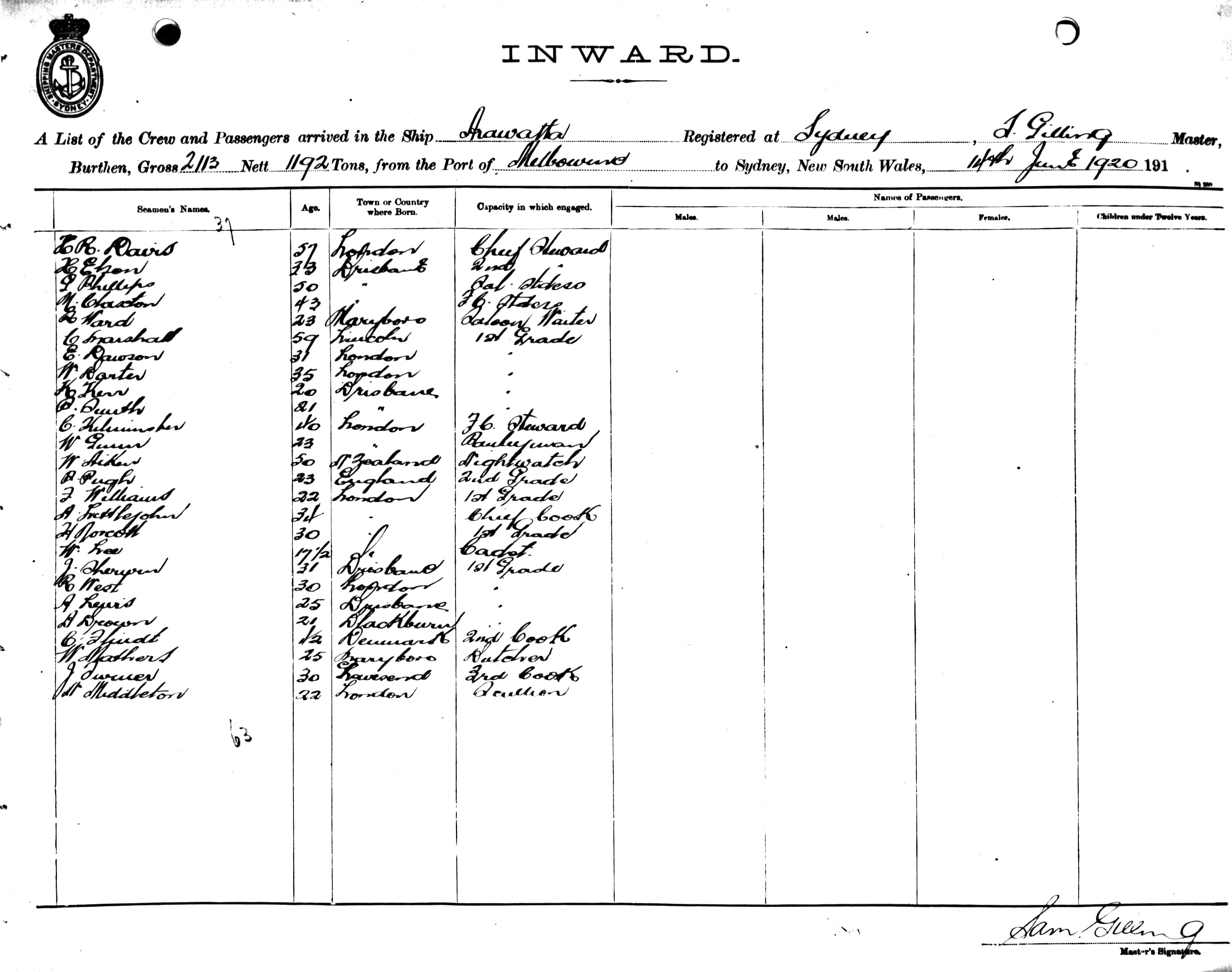 ARAWATTAOF SYDNEY, S. GILLING, MASTER, BURTHEN 2113/1192 TONS FROM THE PORT OF MELBOURNE TO SYDNEY, NEW SOUTH WALES, 14TH JUNE 1920 |