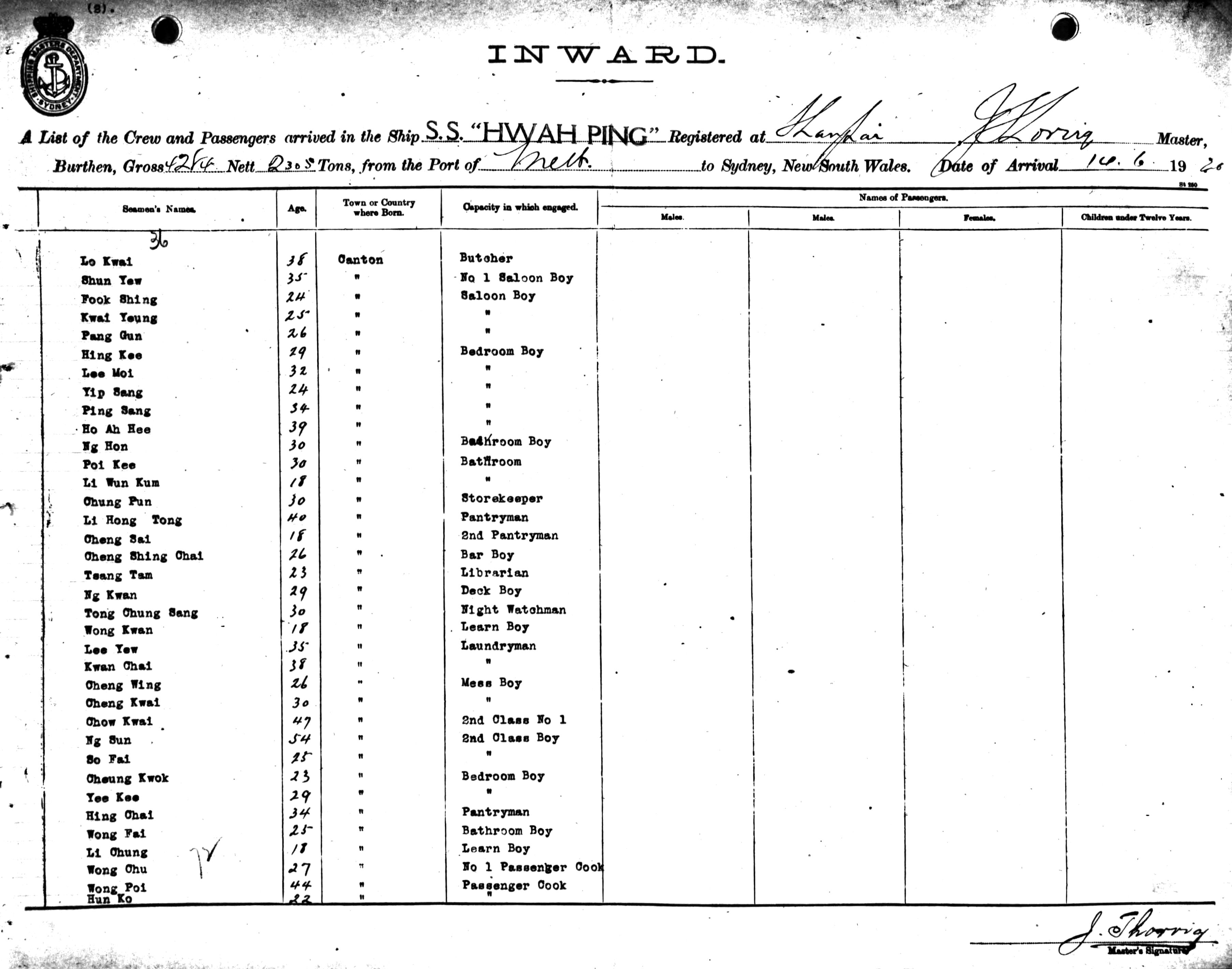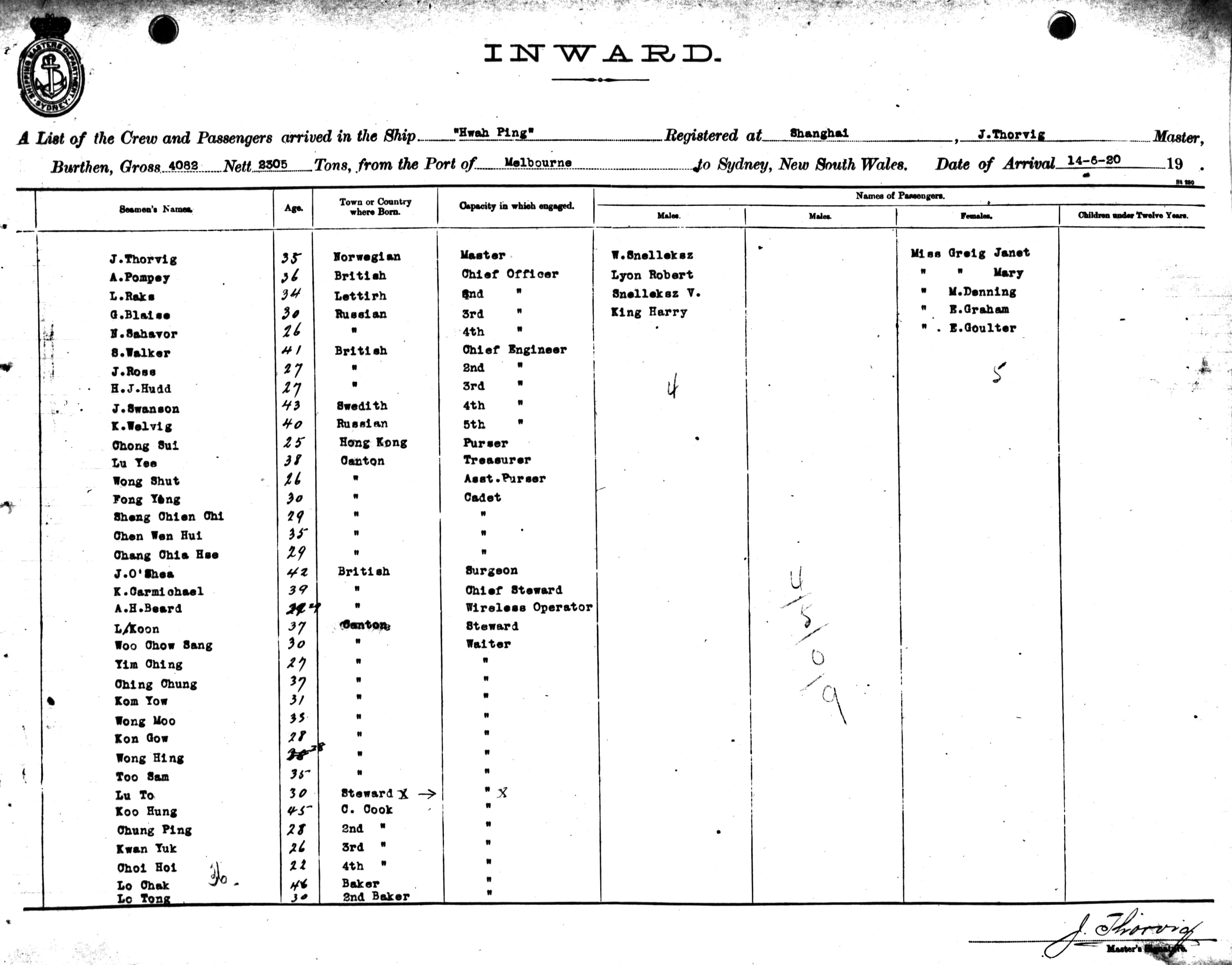 HWAH PINGOF SHANGHAI, J. THORVIG, MASTER, BURTHEN 4082/2305 TONS FROM THE PORT OF MELBOURNE TO SYDNEY, NEW SOUTH WALES, 14TH JUNE 1920 |