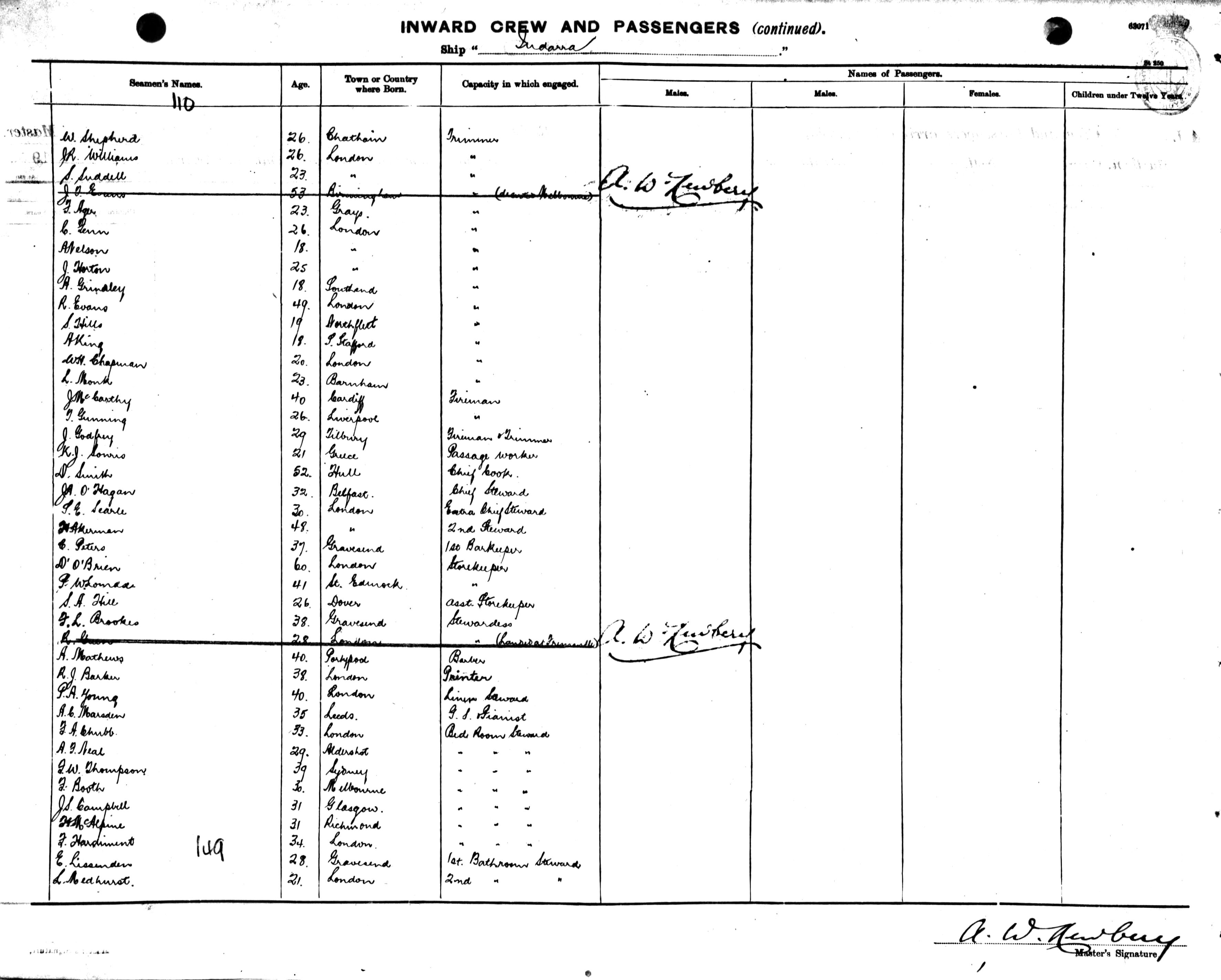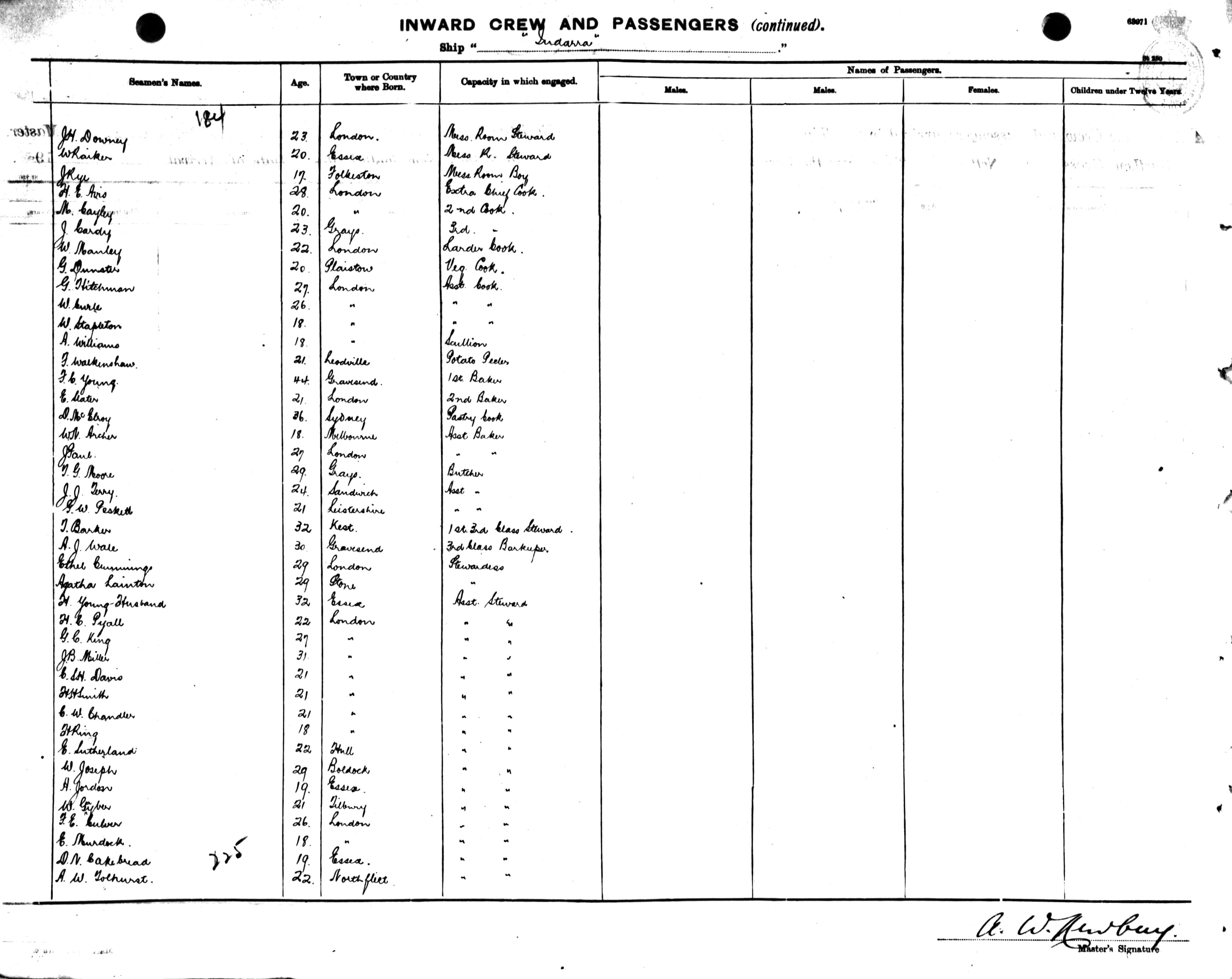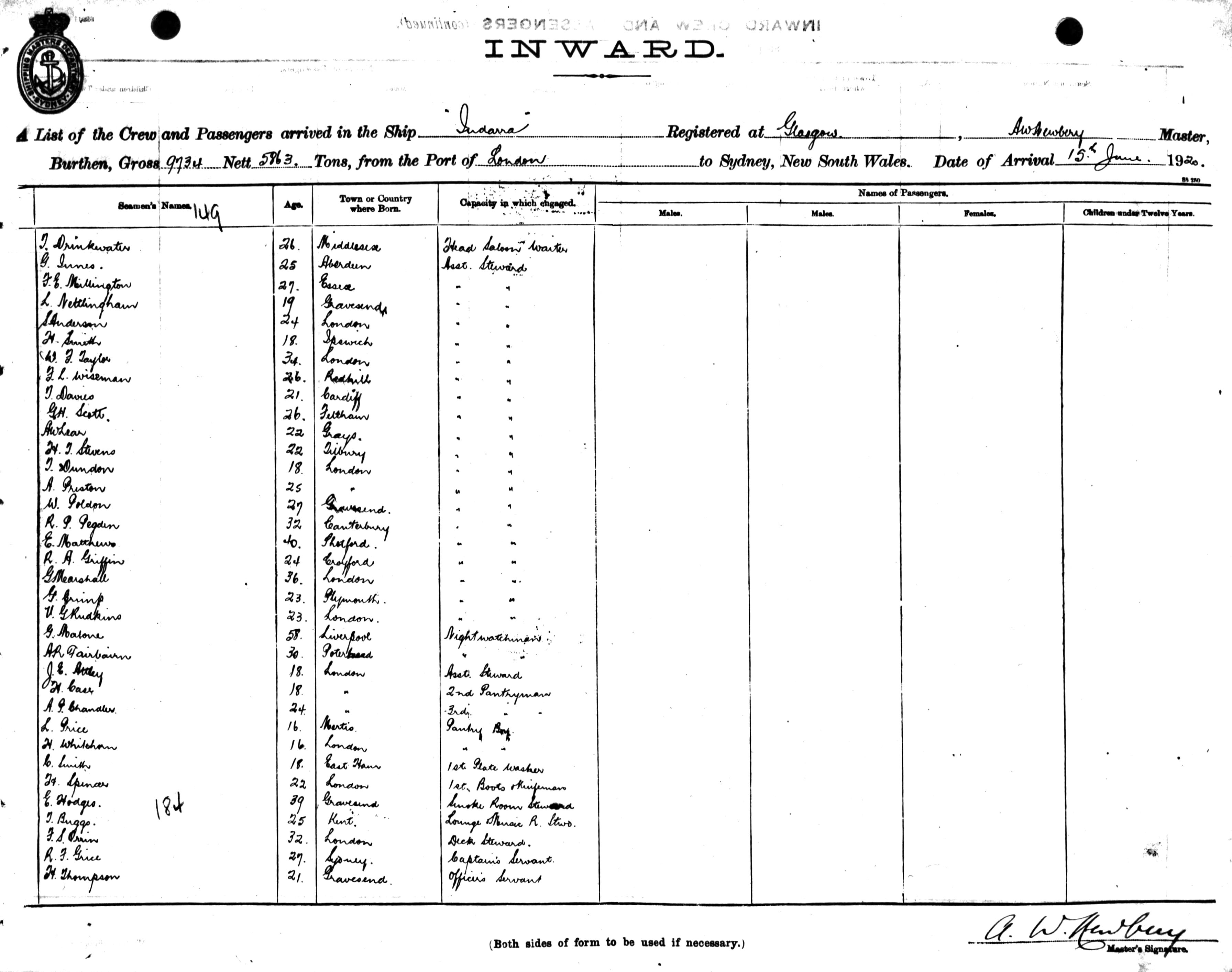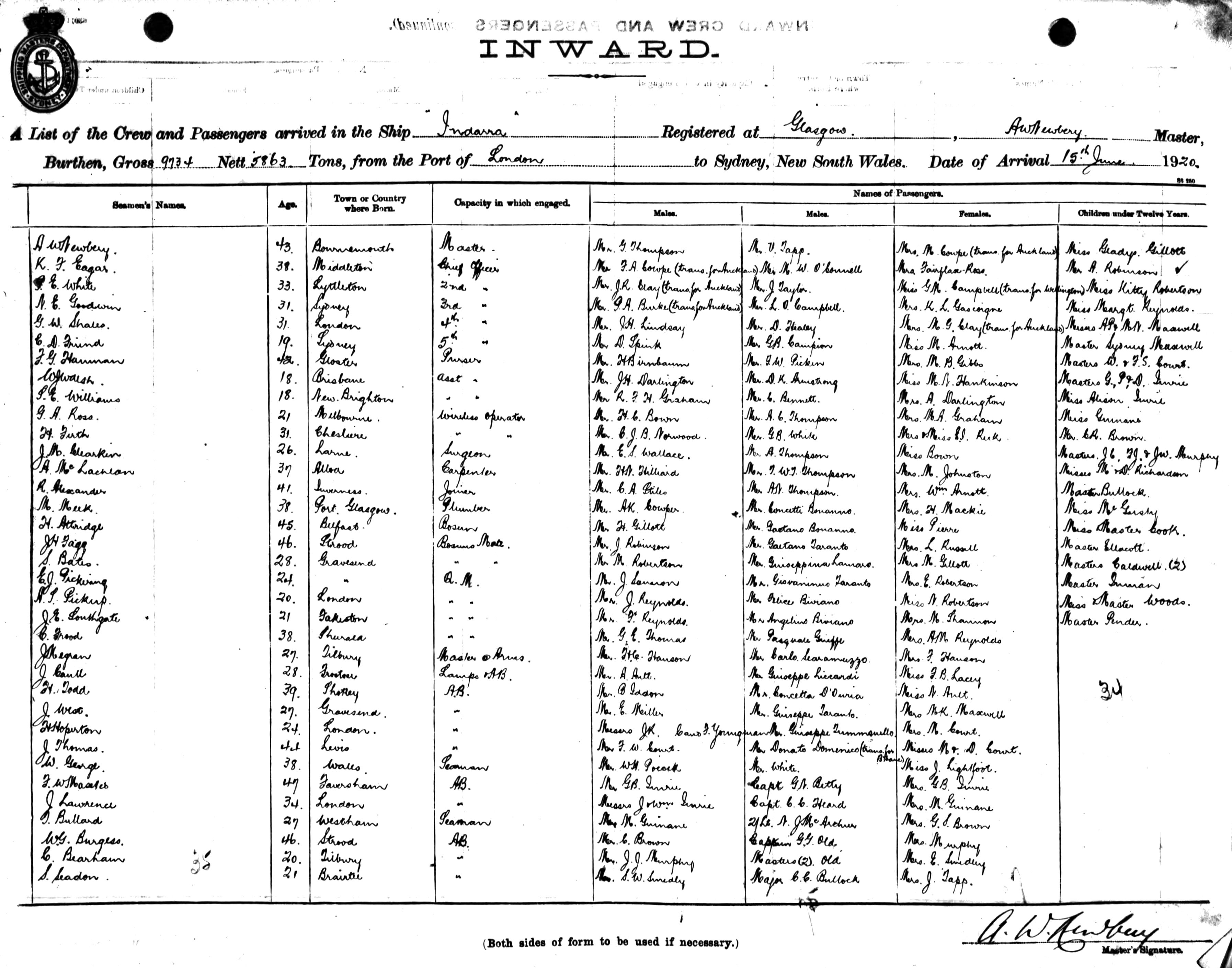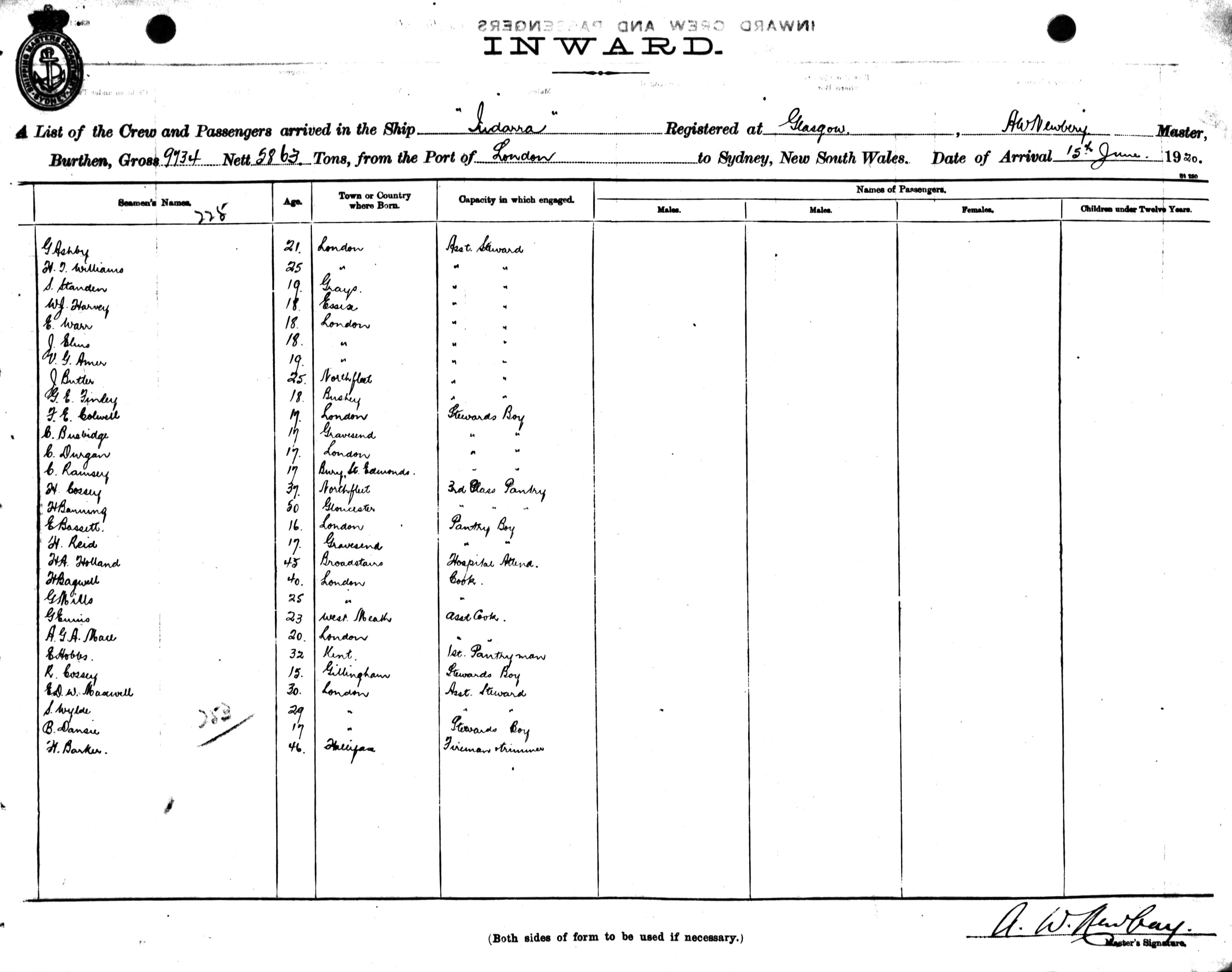INDARRAOF GLASGOW, A. W. NEWBERY, MASTER, BURTHEN 9734/5863 TONS FROM THE PORT OF LONDON TO SYDNEY, NEW SOUTH WALES, 15TH JUNE 1920 |