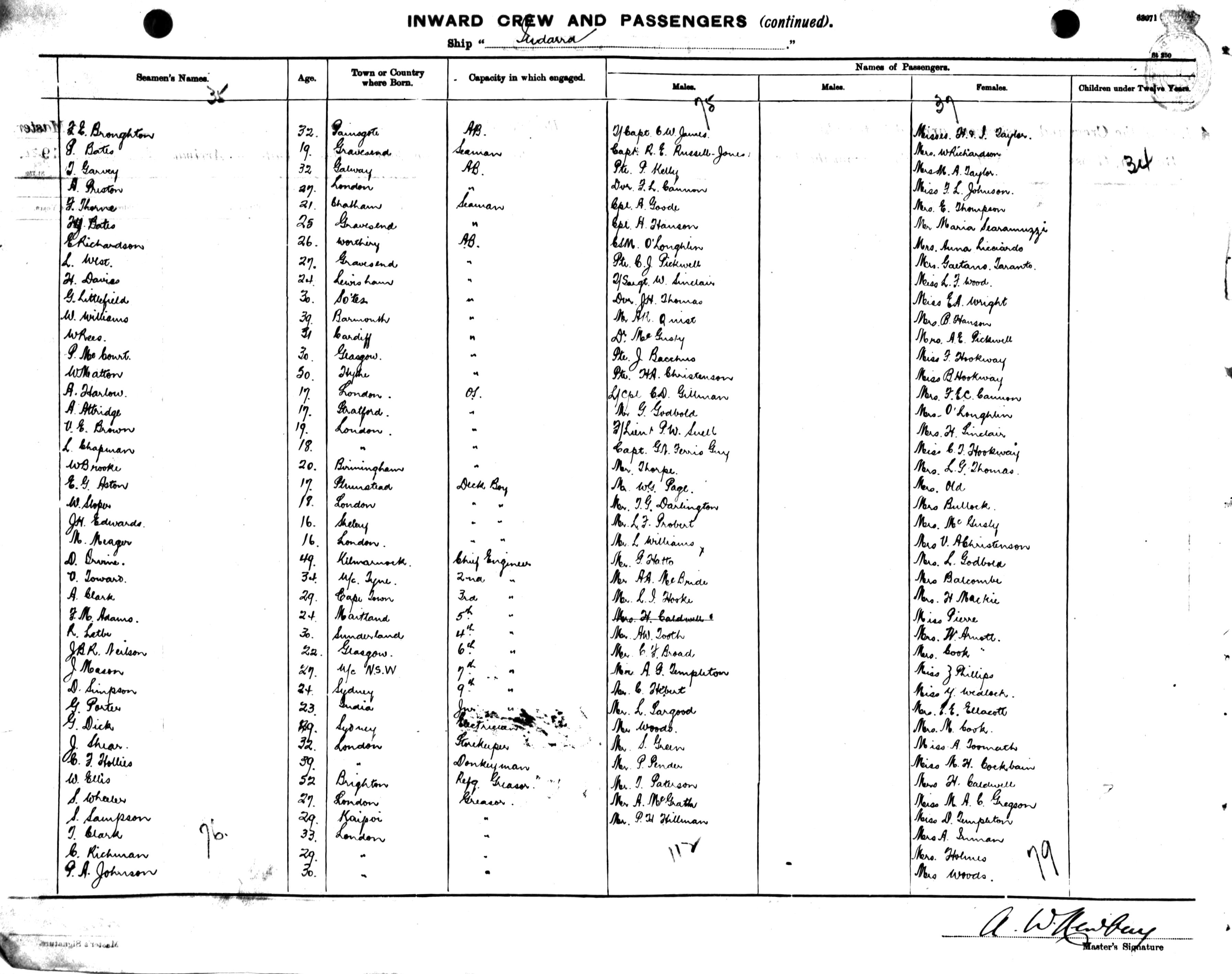 Source: State Records Authority of New South Wales: Shipping Master's Office; Passengers Arriving 1855 - 1922; NRS13278, [X444] reel 2110 & 2111. Transcribed by Lyn & Maurie. You may view/print a scan of the original list - a monitor set to high resolution is recommended for clarity. Use your back button to return. |