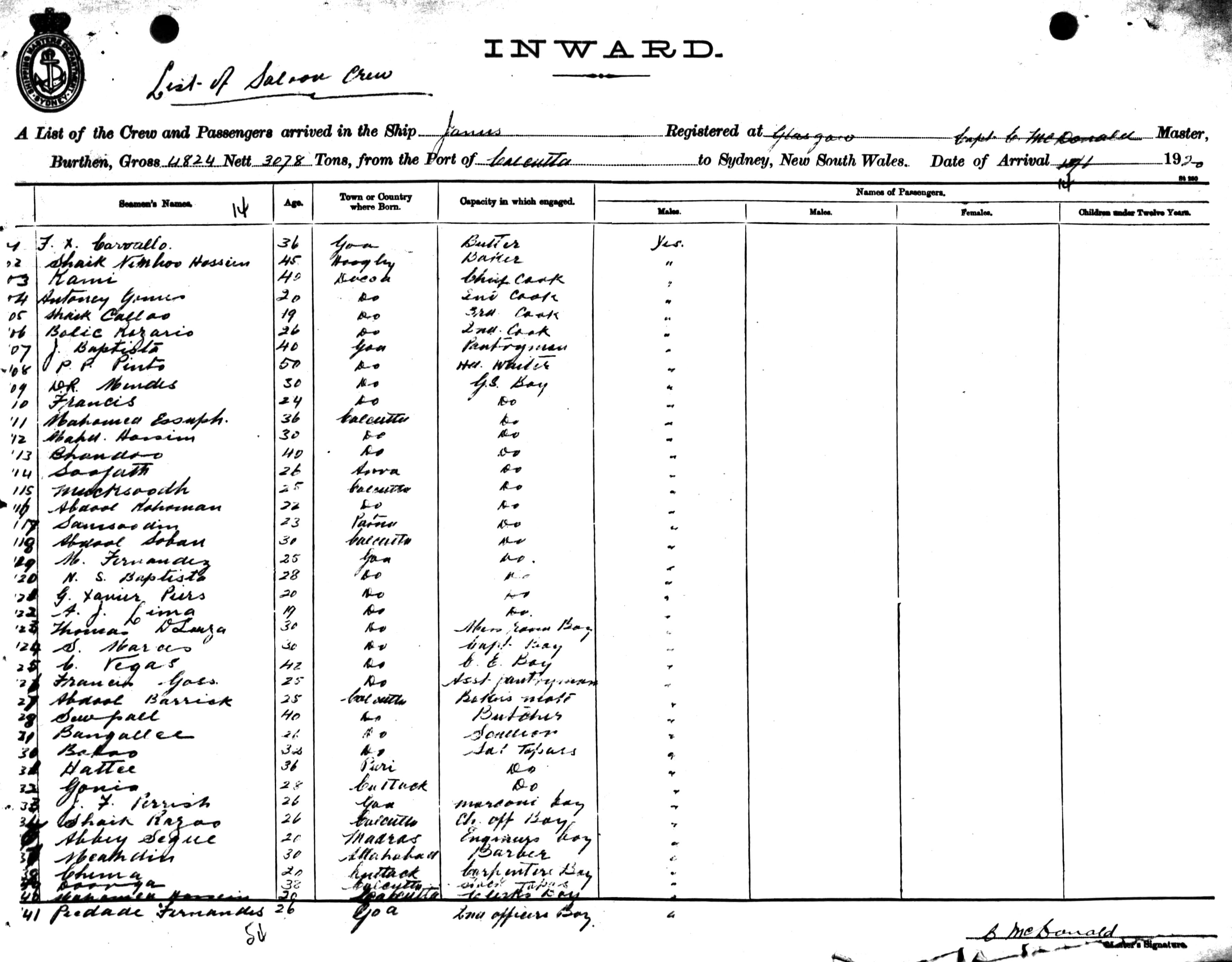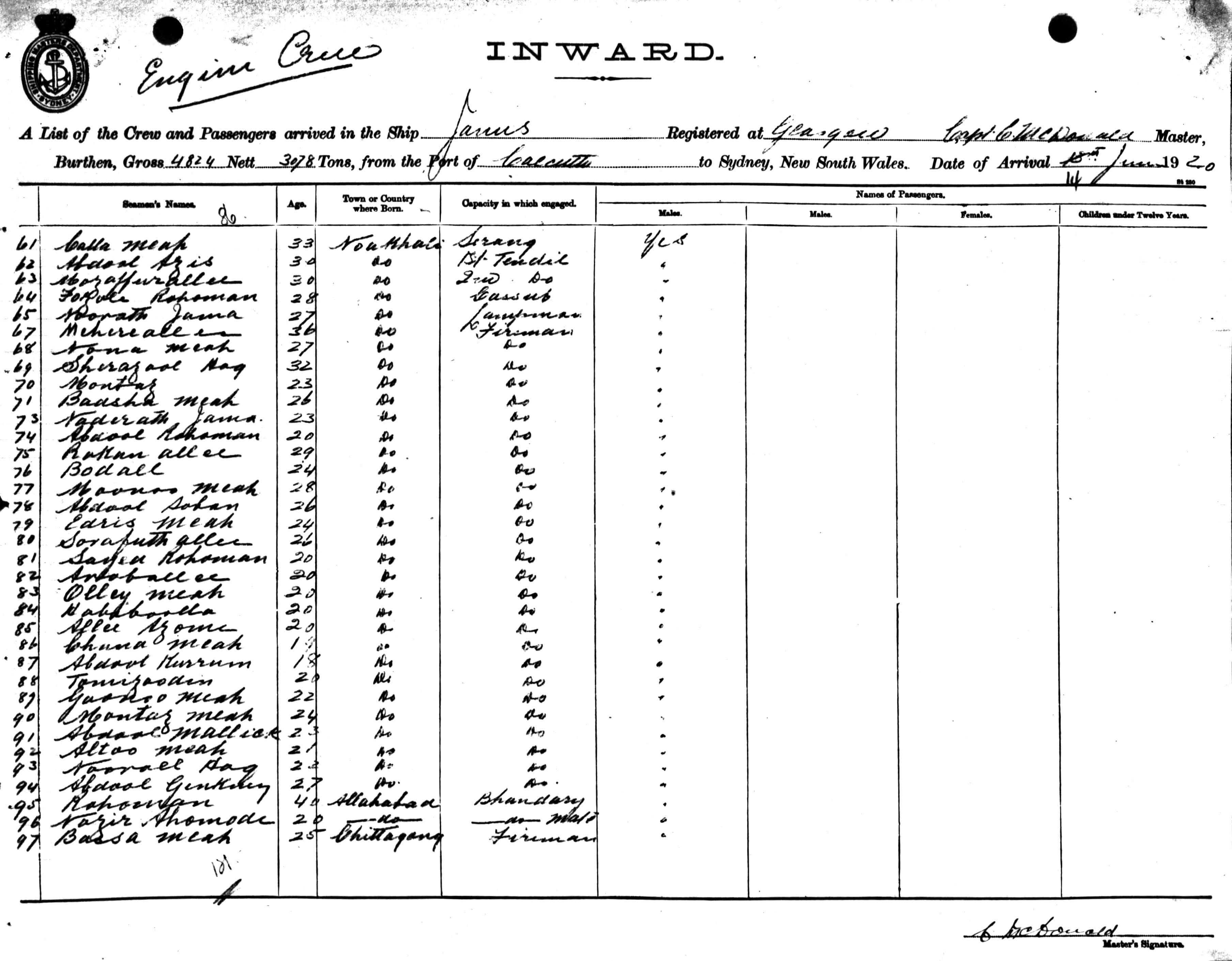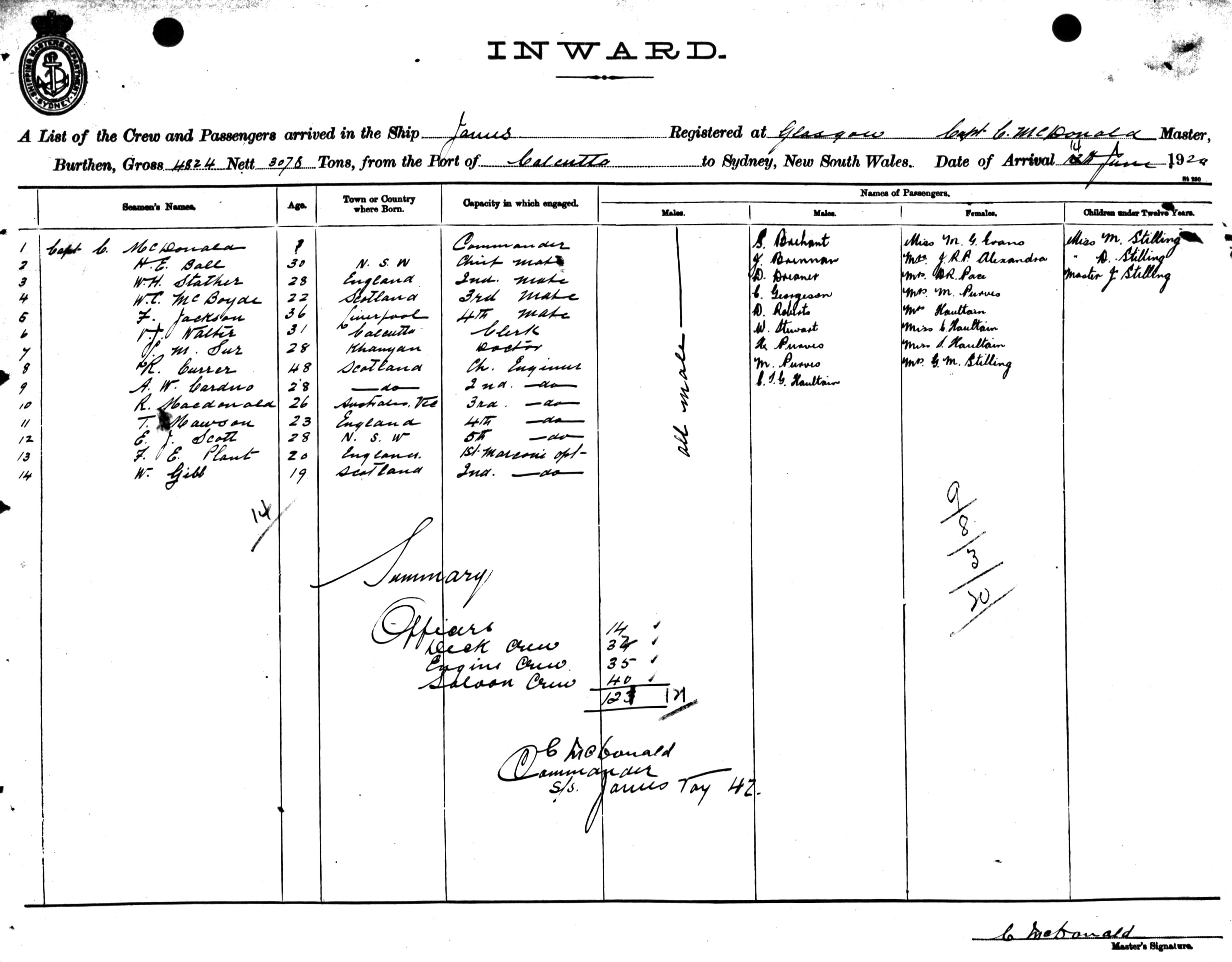 JANUSOF GLASGOW, C. MCDONALD, MASTER, BURTHEN 4824/3078 TONS FROM THE PORT OF CALCUTTA TO SYDNEY, NEW SOUTH WALES, 14TH JUNE 1920 |