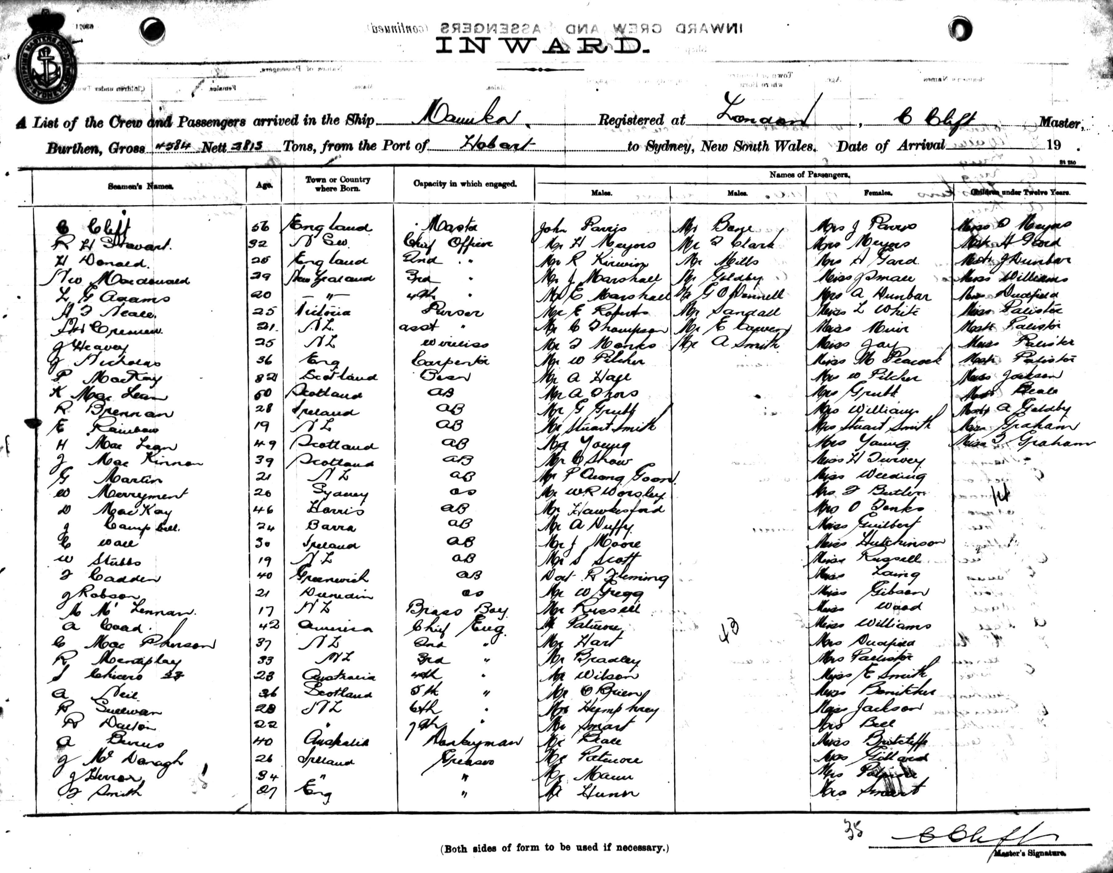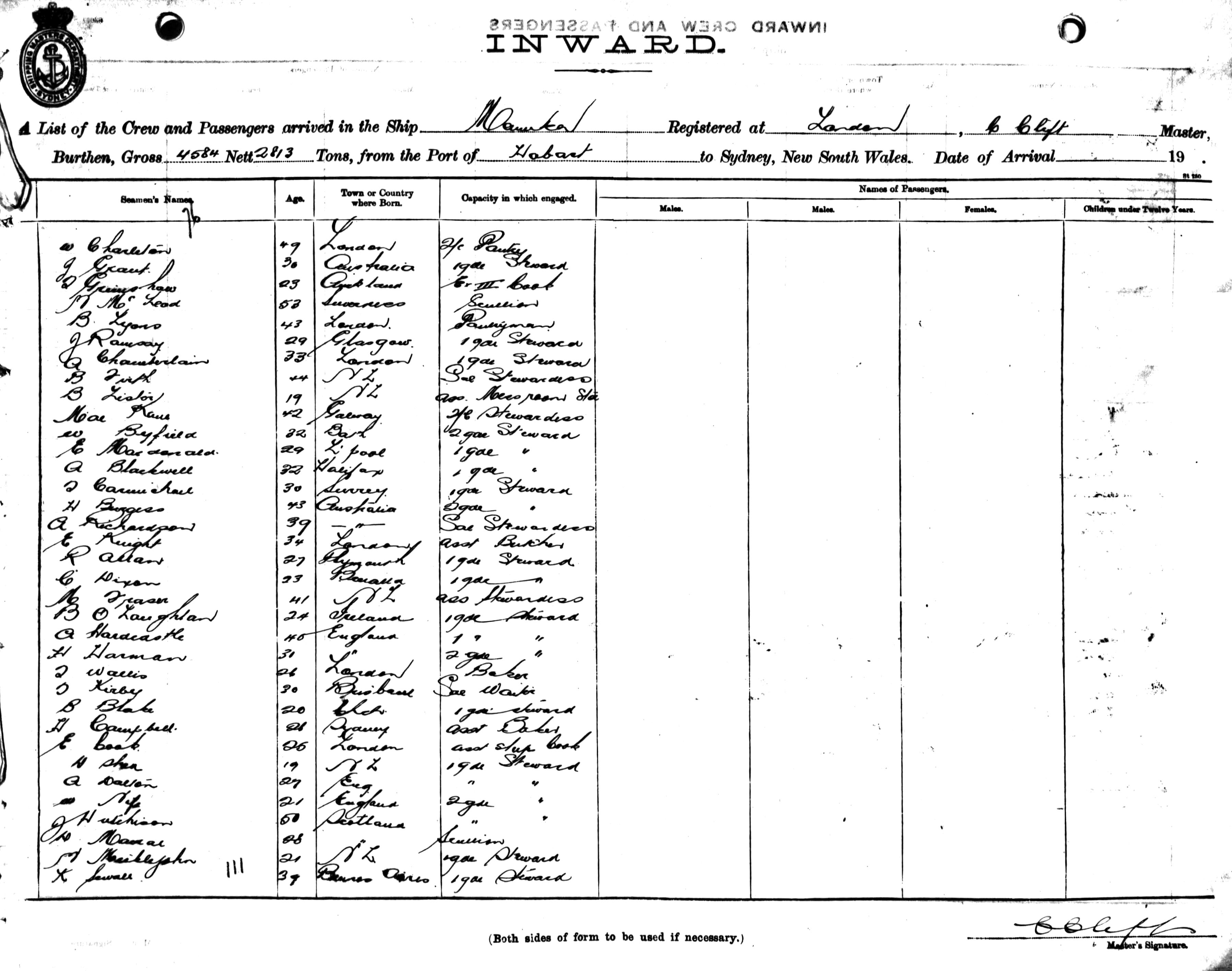 MANUKAOF LONDON, C. CLIFT, MASTER, BURTHEN 4584/2813 TONS FROM THE PORT OF HOBART TO SYDNEY, NEW SOUTH WALES, (14TH JUNE 1920)