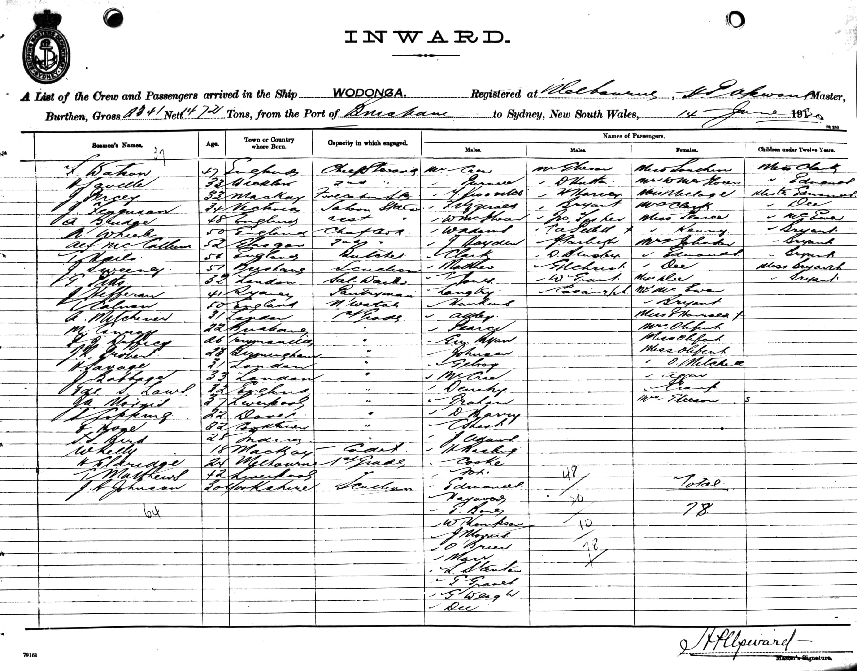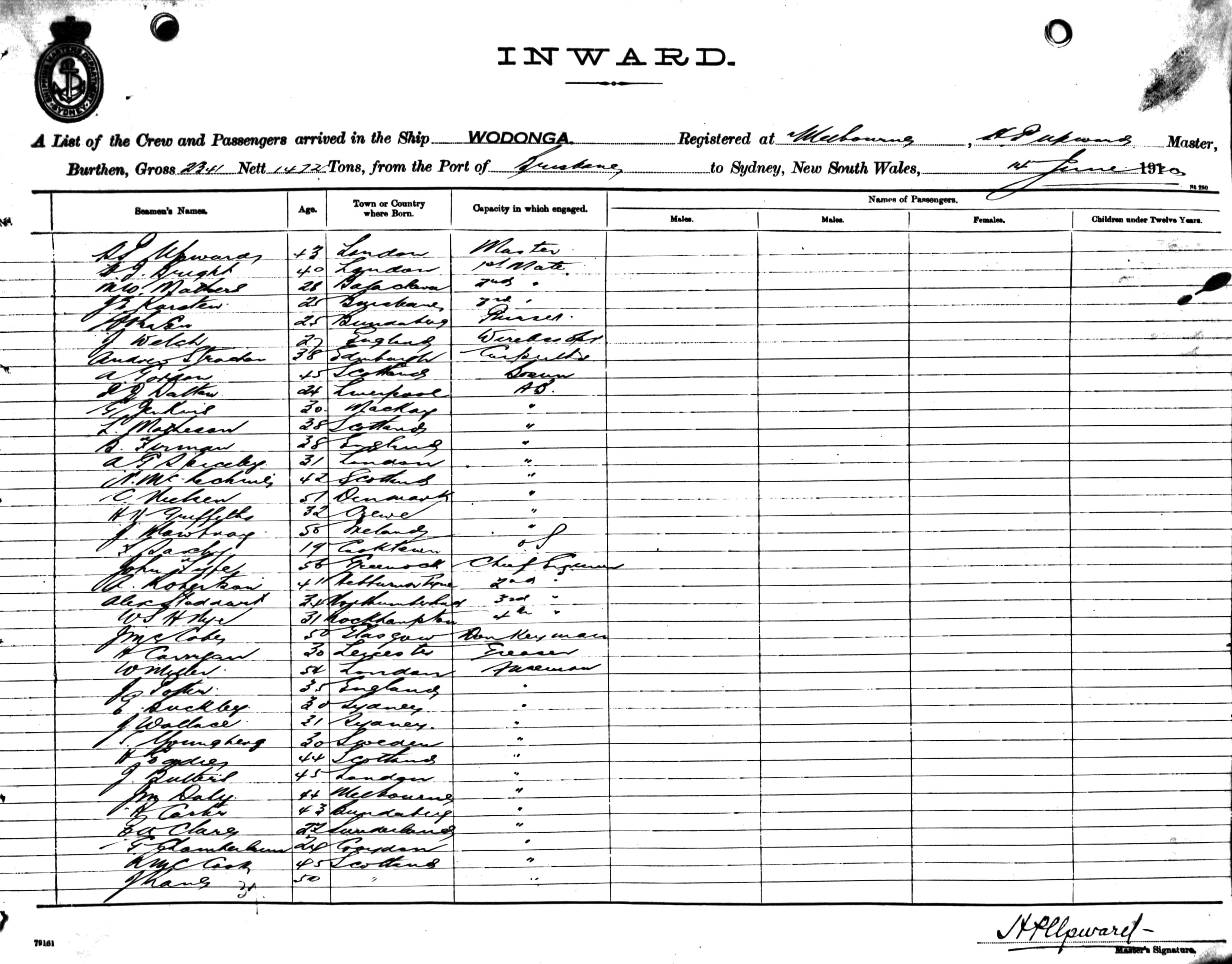 WODONGAOF MELBOURNE, H. P. UPWARD, MASTER, BURTHEN 2341/1472 TONS FROM THE PORT OF BRISBANE TO SYDNEY, NEW SOUTH WALES, 14TH JUNE 1920 |